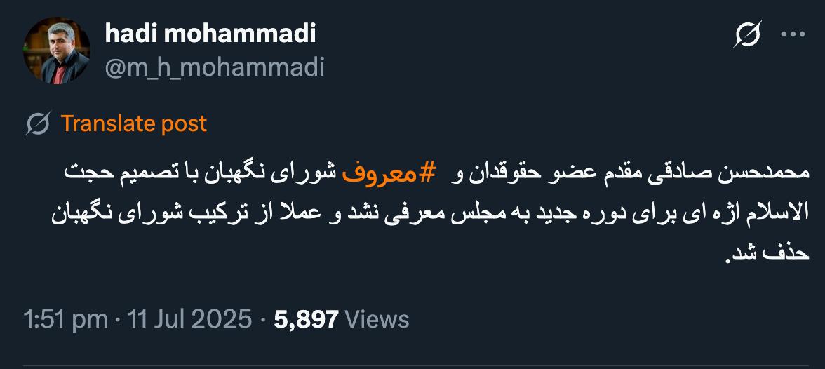 خانه/سیاستمعاون امور اجرایی و انتخابات شورای نگهبان هم نخواهد بود؟خواندن1 دقیقه -جمعه 1404/04/20 - 17:45کد خبر21187اشتراکگذاری محمدحسن صادقی مقدم عضو حقوقدان و #معروف شورای نگهبان با تصمیم حجت الاسلام اژه ای برای دوره جدید به مجلس معرفی نشد و عملا از ترکیب شورای نگهبان حذف شد.— hadi mohammadi (@m_h_mohammadi) July 11, 2025🔴 درودمعاون امور اجرایی و انتخابات شورای نگهبان هم نخواهد بود؟— AbdiMedia - Abdollah Abdi (@abdolah_abdi) July 11, 2025 کمتر از یک دقیقه زمان بگذارید، ثبتنام کنید و نظرتان را زیر همین پست به اشتراک بگذارید.پیامهای توهینآمیز و یا حاوی دعوت به خشونت حذف خواهند شد.ثبت نامدر ادامه بخوانید عجیب ترین پروندهای که همه تلاش خود را میکنند تا سرنخ ها و ارتباطات ذی نفعان را مسدود کنند و دیدهام، پدیده گروه مالی زاویه است که تا کنون بدون انتشار جزییات در عبدی مدیا به آن پرداختهامخواندن 1 دقیقه شمخانی: چون در حال تحریم هستیم هیچ جای دنیا با ما کار تسلیحاتی جدی نمیکندخواندن 1 دقیقه شمخانی: جمهوری اسلامی تجربه جنگ مستقیم با اسرائیل را نداشتخواندن 1 دقیقه شمخانی درباره عملیات عینالاسد: سریع و کافی بودخواندن 1 دقیقه اظهارات جنجالی شمخانی: در ماجرای هواپیمای اوکراینی، آقای روحانی از اول در جریان بودخواندن 1 دقیقهباید خواندخاطرات اکبر هاشمی - ۱ اسفند ۱۳۷۸ - ملاقات عبدالله جاسبی و نگرانی از نتایج انتخاباتفیلم/ سردار مرتضی طلایی کجاست؟خاطرات اکبر هاشمی - ۱۹ شهريور ۱۳۷۸ - مذاکرات دو نفره سیاسی با واعظ طبسی تا هنگام بدرقه به سوی تهران هم ادامه داشته که در نهایت هاشمی ظاهرا از اینجا تصمیم به شرکت جدی در انتخابات مجلس ششم گرفتسوابق ادوار اخیر مجلس شورای اسلامی نشان داد که مجلس در راس امور نیست و در اختیارات فرمانده کل قوا و نیروهای مسلح در هیچ سطحی نمیتواند دخالت و یا مصوبه طی کند، چه برسد که نظارت کندآینده ایران با نامزدهای اعلام شده انتخابات ریاست جمهوری چه میشود؟ / گفتگو با دکتر تقی آزاد ارمکیمیشه با شما احساس خستگی کرد؟یک دامپزشک بسیجی بجای جراح گوش و حلق و بینی سرپرست شبکه بهداشت ایذه شد!خاطرات اکبر هاشمی - ۱۴ شهريور ۱۳۷۸ - دیدار مدیران ارشد دستگاه قضایی با هاشمی رفسنجانی و گله آنان از بی توجهی هاشمی شاهرودی رییس جدید قوه قضاییه ادامه داردخاطرات اکبر هاشمی - ۱۶ شهريور ۱۳۷۸ - در ادامه تلاش های مرحوم واعظ طبسی که در دیدارهای مکرر برای تشویق هاشمی به شرکت در انتخابات اقدام میکرد این بار هم او با هاشمی ملاقات کردخاطرات اکبر هاشمی - ۱۸ شهريور ۱۳۷۸ - ادامه بازدید ها از متعلقات و ابنیه و آثار آستان قدس