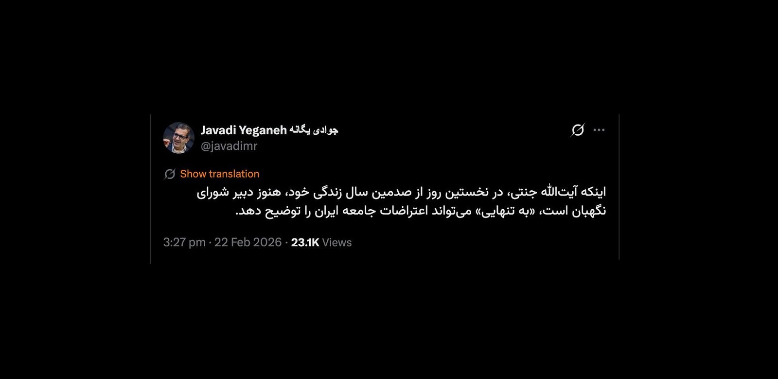 خانه/سیاست آقای دکتر درود چه کسی و با چه مصلحتی وی را به عنوان فقیه در شورای نگهبان قانون اساسی حفظ کرده است؟خواندن1 دقیقه -دوشنبه 1404/12/04 - 09:31کد خبر24487اشتراکگذاری اینکه آیتالله جنتی، در نخستین روز از صدمین سال زندگی خود، هنوز دبیر شورای نگهبان است، «به تنهایی» میتواند اعتراضات جامعه ایران را توضیح دهد.— Javadi Yeganeh جوادی یگانه (@javadimr) February 22, 2026🔴 آقای دکتردرودچه کسی و با چه مصلحتی وی را به عنوان #فقیه در شورای نگهبان قانون اساسی حفظ کرده است؟— AbdiMedia - Abdollah Abdi (@abdolah_abdi) February 22, 2026 کمتر از یک دقیقه زمان بگذارید، ثبتنام کنید و نظرتان را زیر همین پست به اشتراک بگذارید.پیامهای توهینآمیز و یا حاوی دعوت به خشونت حذف خواهند شد.ثبت نامدر ادامه بخوانید خواب هاشمی رفسنجانی درباره مذاکره با آمریکا - بخشی از روزنوشت جمعه ۱۵ اسفند ۱۳۸۲ اکبر هاشمی رفسنجانیخواندن 1 دقیقه جناب کرباسچی درود کاش ایشان و دیگران در اندازه خود، همانقدر که جنابعالی دغدغه زندانیان در بند ۳۲۵ اوین را داشتید...خواندن 1 دقیقه درود حسین جان البته مانند دیگر پیام های تسلیت خود به سایرین علاوه بر توییتر در حساب های دیگر هم منتشر کرده و سردار رضایی هم بازنشسته نیستخواندن 1 دقیقه سیاست متغیر بقدری عجیب و بیرحم است که اگر جنگ محدود یا حتی ناگهان گسترده بین جمهوری اسلامی و ایالات متحده رخ دهد...خواندن 1 دقیقه آقای رییس قوه قضاییه مشابه چنین توصیهای را به سازمان بازرسی کل کشور کرده بود که فریب رقبا را نخورند و...خواندن 1 دقیقهباید خواندخاطرات اکبر هاشمی - ۱ اسفند ۱۳۷۸ - ملاقات عبدالله جاسبی و نگرانی از نتایج انتخاباتفیلم/ سردار مرتضی طلایی کجاست؟خاطرات اکبر هاشمی - ۱۹ شهريور ۱۳۷۸ - مذاکرات دو نفره سیاسی با واعظ طبسی تا هنگام بدرقه به سوی تهران هم ادامه داشته که در نهایت هاشمی ظاهرا از اینجا تصمیم به شرکت جدی در انتخابات مجلس ششم گرفتسوابق ادوار اخیر مجلس شورای اسلامی نشان داد که مجلس در راس امور نیست و در اختیارات فرمانده کل قوا و نیروهای مسلح در هیچ سطحی نمیتواند دخالت و یا مصوبه طی کند، چه برسد که نظارت کندآینده ایران با نامزدهای اعلام شده انتخابات ریاست جمهوری چه میشود؟ / گفتگو با دکتر تقی آزاد ارمکیمیشه با شما احساس خستگی کرد؟یک دامپزشک بسیجی بجای جراح گوش و حلق و بینی سرپرست شبکه بهداشت ایذه شد!خاطرات اکبر هاشمی - ۱۴ شهريور ۱۳۷۸ - دیدار مدیران ارشد دستگاه قضایی با هاشمی رفسنجانی و گله آنان از بی توجهی هاشمی شاهرودی رییس جدید قوه قضاییه ادامه داردخاطرات اکبر هاشمی - ۱۶ شهريور ۱۳۷۸ - در ادامه تلاش های مرحوم واعظ طبسی که در دیدارهای مکرر برای تشویق هاشمی به شرکت در انتخابات اقدام میکرد این بار هم او با هاشمی ملاقات کردخاطرات اکبر هاشمی - ۱۸ شهريور ۱۳۷۸ - ادامه بازدید ها از متعلقات و ابنیه و آثار آستان قدس