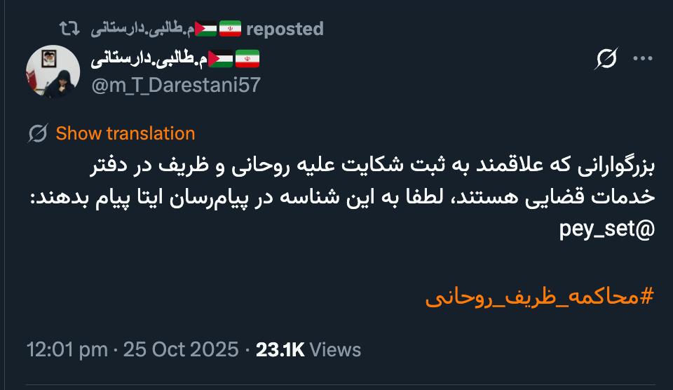 خانه/سیاست سرکار خانم مدیرکل سابق بازرسی وزارت تعاون، کار ورفاه اجتماعی درود خواندن1 دقیقه -شنبه 1404/08/03 - 23:18کد خبر23242اشتراکگذاری برای شکایت از اشخاص روحانی باید به دادسرای ویژه روحانیت مراجعه حضوری شود. دفاتر خدمات قضایی مربوط به شکایات و دادخواست های قوه قضاییه است.بزرگوارانی که علاقمند به ثبت شکایت علیه روحانی و ظریف در دفتر خدمات قضایی هستند، لطفا به این شناسه در پیامرسان ایتا پیام بدهند:@pey_set#محاکمه_ظریف_روحانی— م.طالبی.دارستانی🇵🇸🇮🇷 (@m_T_Darestani57) October 25, 2025🔴 سرکار خانم مدیرکل سابق بازرسی وزارت تعاون، کار ورفاه اجتماعیدرود💢برای شکایت از اشخاص روحانی باید به دادسرای ویژه روحانیت مراجعه حضوری شود. دفاتر خدمات قضایی مربوط به شکایات و دادخواست های قوه قضاییه است.— AbdiMedia - Abdollah Abdi (@abdolah_abdi) October 25, 2025 کمتر از یک دقیقه زمان بگذارید، ثبتنام کنید و نظرتان را زیر همین پست به اشتراک بگذارید.پیامهای توهینآمیز و یا حاوی دعوت به خشونت حذف خواهند شد.ثبت نامدر ادامه بخوانید خوب مدتی پیش سردار سید یحیی صفوی حضور رسانهای داشت صرف نظر از حضور ناگهانی و با پشتوانه رسانهای هماهنگ فرزندشانخواندن 1 دقیقه روحانی در خانه بیبیسی و صدای آمریکا را تماشا میکندخواندن 1 دقیقه پاسخ های توئیتری 3 آبانخواندن 1 دقیقه گردش روزگار به نوبت با هر پشتوانهای روزی به مصلحت همان که بر علی انصاری ومجموعهاش رفتخواندن 1 دقیقه یادتان هست که بر اساس قانون جدید بانک مرکزی در مورد شکایت از این بانک محدودیت خیلی خیلی جدی دارید!!!!خواندن 1 دقیقهباید خواندخاطرات اکبر هاشمی - ۱ اسفند ۱۳۷۸ - ملاقات عبدالله جاسبی و نگرانی از نتایج انتخاباتفیلم/ سردار مرتضی طلایی کجاست؟خاطرات اکبر هاشمی - ۱۹ شهريور ۱۳۷۸ - مذاکرات دو نفره سیاسی با واعظ طبسی تا هنگام بدرقه به سوی تهران هم ادامه داشته که در نهایت هاشمی ظاهرا از اینجا تصمیم به شرکت جدی در انتخابات مجلس ششم گرفتسوابق ادوار اخیر مجلس شورای اسلامی نشان داد که مجلس در راس امور نیست و در اختیارات فرمانده کل قوا و نیروهای مسلح در هیچ سطحی نمیتواند دخالت و یا مصوبه طی کند، چه برسد که نظارت کندآینده ایران با نامزدهای اعلام شده انتخابات ریاست جمهوری چه میشود؟ / گفتگو با دکتر تقی آزاد ارمکیمیشه با شما احساس خستگی کرد؟یک دامپزشک بسیجی بجای جراح گوش و حلق و بینی سرپرست شبکه بهداشت ایذه شد!خاطرات اکبر هاشمی - ۱۴ شهريور ۱۳۷۸ - دیدار مدیران ارشد دستگاه قضایی با هاشمی رفسنجانی و گله آنان از بی توجهی هاشمی شاهرودی رییس جدید قوه قضاییه ادامه داردخاطرات اکبر هاشمی - ۱۶ شهريور ۱۳۷۸ - در ادامه تلاش های مرحوم واعظ طبسی که در دیدارهای مکرر برای تشویق هاشمی به شرکت در انتخابات اقدام میکرد این بار هم او با هاشمی ملاقات کردخاطرات اکبر هاشمی - ۱۸ شهريور ۱۳۷۸ - ادامه بازدید ها از متعلقات و ابنیه و آثار آستان قدس