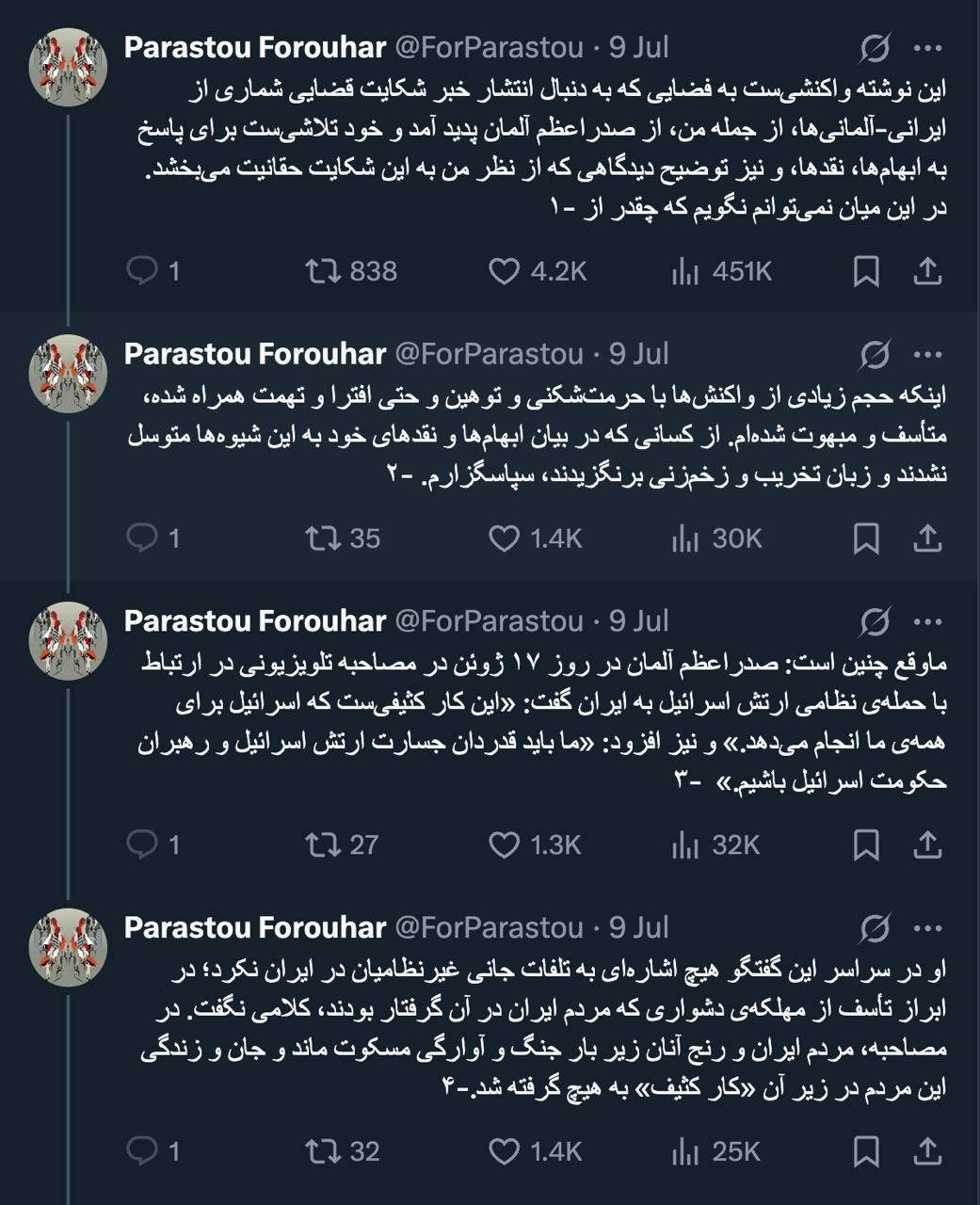 خانه/سیاستتوییت مشروح توضیحات پرستو فروهرخواندن1 دقیقه -جمعه 1404/04/20 - 12:45کد خبر21160اشتراکگذاری تصویر تصویر تصویر تصویر کمتر از یک دقیقه زمان بگذارید، ثبتنام کنید و نظرتان را زیر همین پست به اشتراک بگذارید.پیامهای توهینآمیز و یا حاوی دعوت به خشونت حذف خواهند شد.ثبت نامدر ادامه بخوانید البته توصیه آیتالله سبحانی اگر به آیتالله خامنهای ارسال میشد تا نظر فقهی خود را در صورت انطباق با نظر آیتالله سبحانی برای اعمال به مجمع تشخیص مصلحت و مجلس و شورای نگهبان ارجاع میداد، کاربردی تر بود.خواندن 1 دقیقه البته عجیب است مسئولان قوه قضاییه بویژه دادسرا و دادگاه های ویژه روحانیت هم برای این قاضی پیشین خود پیام تسلیت علنی هم ندادند.خواندن 1 دقیقه تابناک زیر تیغ داماد برادر محسن / داماد سرلشگر محسن رضایی از پدر همسرش خواست تا درباره ارتباطش با رسانه تابناک شفاف سازی کندخواندن 1 دقیقه یک سوال از دکتر علی لاریجانی در مورد سردار فرهاد نظریخواندن 1 دقیقه "هوشمندانه" خوب است اما نه برای ایرانیها!خواندن 1 دقیقهباید خواندخاطرات اکبر هاشمی - ۱ اسفند ۱۳۷۸ - ملاقات عبدالله جاسبی و نگرانی از نتایج انتخاباتفیلم/ سردار مرتضی طلایی کجاست؟خاطرات اکبر هاشمی - ۱۹ شهريور ۱۳۷۸ - مذاکرات دو نفره سیاسی با واعظ طبسی تا هنگام بدرقه به سوی تهران هم ادامه داشته که در نهایت هاشمی ظاهرا از اینجا تصمیم به شرکت جدی در انتخابات مجلس ششم گرفتسوابق ادوار اخیر مجلس شورای اسلامی نشان داد که مجلس در راس امور نیست و در اختیارات فرمانده کل قوا و نیروهای مسلح در هیچ سطحی نمیتواند دخالت و یا مصوبه طی کند، چه برسد که نظارت کندآینده ایران با نامزدهای اعلام شده انتخابات ریاست جمهوری چه میشود؟ / گفتگو با دکتر تقی آزاد ارمکیمیشه با شما احساس خستگی کرد؟یک دامپزشک بسیجی بجای جراح گوش و حلق و بینی سرپرست شبکه بهداشت ایذه شد!خاطرات اکبر هاشمی - ۱۴ شهريور ۱۳۷۸ - دیدار مدیران ارشد دستگاه قضایی با هاشمی رفسنجانی و گله آنان از بی توجهی هاشمی شاهرودی رییس جدید قوه قضاییه ادامه داردخاطرات اکبر هاشمی - ۱۶ شهريور ۱۳۷۸ - در ادامه تلاش های مرحوم واعظ طبسی که در دیدارهای مکرر برای تشویق هاشمی به شرکت در انتخابات اقدام میکرد این بار هم او با هاشمی ملاقات کردخاطرات اکبر هاشمی - ۱۸ شهريور ۱۳۷۸ - ادامه بازدید ها از متعلقات و ابنیه و آثار آستان قدس