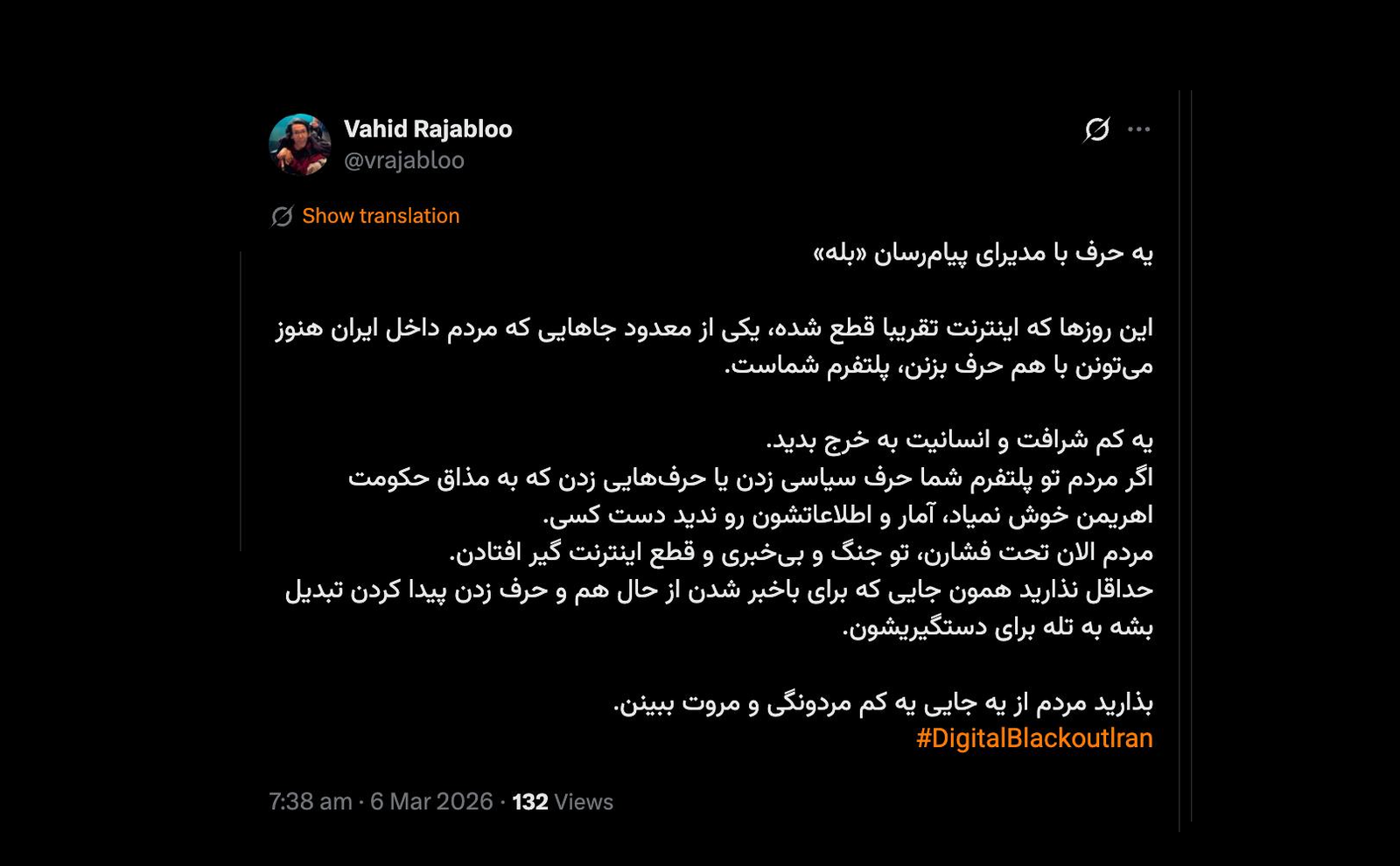 خانه/سیاست پیش از این در عبدی مدیا نوشتهام کدام اپراتورهای خدمات ارتباطی و کدام برنامه و اپ ایرانی هست که زیرساخت و کلید دسترسی آن در اختیار وزارت اطلاعات نباشد؟خواندن1 دقیقه -سه شنبه 1405/01/18 - 17:20کد خبر24597اشتراکگذاری شرط اعطای مجوز و فعالیت سازمان تنظیم مقررات و ارتباطات رادیویی همین است کمتر از یک دقیقه زمان بگذارید، ثبتنام کنید و نظرتان را زیر همین پست به اشتراک بگذارید.پیامهای توهینآمیز و یا حاوی دعوت به خشونت حذف خواهند شد.ثبت نامدر ادامه بخوانید سید مجتبی خامنهای رهبر منتقم هست و نه مصلحخواندن 1 دقیقه اندکی پیش از اعلام نام رهبر سوم جمهوری اسلامی در گفتگویی تحلیلی به سناریوهای آینده با ساختار فعلی جمهوری اسلامی پرداختمخواندن 0 بالاخره اکثریت این دوره مجلس خبرگان رهبری با مشورت و رایزنی بیشتر، صلاح را در این دانست که برای گزینه رهبر سوم به سراغ آیتالله سید مجتبی خامنهای برود و نام او را نهایی و اعلام کند.خواندن 1 دقیقه سیدمجتبی خامنهای با رأی مجلس خبرگان سومین رهبر انقلاب اسلامی ایران شدخواندن 2 دقیقه آقای علی حسین قاضی زاده از تبلیغ عبدی مدیا متشکرم حتی اگر دریچه اطلاع رسانی یک ایرانی که موج سواری نمی کند و از خون جوانان وطن و شهروندان ایران بزرگ و متحد برای خود کلاه و منفعتی عاید نمی کند.خواندن 1 دقیقهباید خواندخاطرات اکبر هاشمی - ۱ اسفند ۱۳۷۸ - ملاقات عبدالله جاسبی و نگرانی از نتایج انتخاباتفیلم/ سردار مرتضی طلایی کجاست؟خاطرات اکبر هاشمی - ۱۹ شهريور ۱۳۷۸ - مذاکرات دو نفره سیاسی با واعظ طبسی تا هنگام بدرقه به سوی تهران هم ادامه داشته که در نهایت هاشمی ظاهرا از اینجا تصمیم به شرکت جدی در انتخابات مجلس ششم گرفتسوابق ادوار اخیر مجلس شورای اسلامی نشان داد که مجلس در راس امور نیست و در اختیارات فرمانده کل قوا و نیروهای مسلح در هیچ سطحی نمیتواند دخالت و یا مصوبه طی کند، چه برسد که نظارت کندآینده ایران با نامزدهای اعلام شده انتخابات ریاست جمهوری چه میشود؟ / گفتگو با دکتر تقی آزاد ارمکیمیشه با شما احساس خستگی کرد؟یک دامپزشک بسیجی بجای جراح گوش و حلق و بینی سرپرست شبکه بهداشت ایذه شد!خاطرات اکبر هاشمی - ۱۴ شهريور ۱۳۷۸ - دیدار مدیران ارشد دستگاه قضایی با هاشمی رفسنجانی و گله آنان از بی توجهی هاشمی شاهرودی رییس جدید قوه قضاییه ادامه داردخاطرات اکبر هاشمی - ۱۶ شهريور ۱۳۷۸ - در ادامه تلاش های مرحوم واعظ طبسی که در دیدارهای مکرر برای تشویق هاشمی به شرکت در انتخابات اقدام میکرد این بار هم او با هاشمی ملاقات کردخاطرات اکبر هاشمی - ۱۸ شهريور ۱۳۷۸ - ادامه بازدید ها از متعلقات و ابنیه و آثار آستان قدس