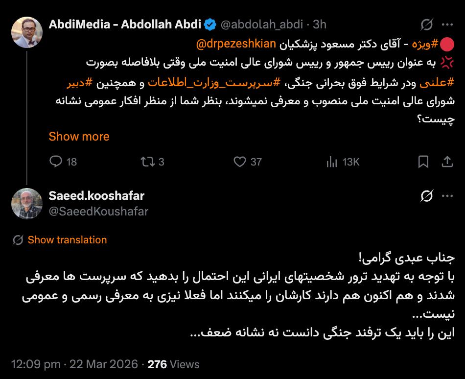 خانه/سیاستپاسخ های توییتریخواندن8 دقیقه -سه شنبه 1405/01/18 - 12:54کد خبر24575اشتراکگذاری عرض کردم من هیچ امکان راستی آزمایی ندارم اما چون از کانال های متعددی به من رسیده( حتی با این احتمال که از یک منبع با کانال های گوناگون باشد) بقدری اهمیت داشت که آن را رسانه ای کردم با این امید که تکذیب یا تایید شود.موفق بوده؟— siavakhsh13 (@siavakhsh13) March 2, 2026🔴 درودعرض کردم من هیچ امکان راستی آزمایی ندارم اما چون از کانال های متعددی به من رسیده ( حتی با این احتمال که از یک منبع با کانال های گوناگون باشد) بقدری اهمیت داشت که آن را رسانه ای کردم با این امید که تکذیب یا تایید شود.— AbdiMedia - Abdollah Abdi (@abdolah_abdi) March 2, 2026بجز عشق وطن در خون من نیستبجز در وطن، دردی مرا نیست🔴 دقت بفرمایید تمام تلاش من پوشش بی طرفانه حقیقت هست.🔸در پوشش اخبار جنگ برایم صرفا بیان دقیق آنچه رخ میدهد مهم است🔸 برای قصور و اشکالات و اهمالات پوزش میخوام. من هیچ ادعایی ندارم و آرزو دارم کور میشدم و این روزهای ایران رو نمیدیدم و با چشمانی خیس به حال خودم و مردمم و…— AbdiMedia - Abdollah Abdi (@abdolah_abdi) March 2, 2026دروددقیقا، چرا؟اما نه یکی؛ چندین نفرمن هم برای همین منتشر کردم که یا تکذیب یا تایید شود.اینهمه رسانه چرا باید یکی خبری که هیچ جا نیست رو برسونه به عبدی مدیا— معین (@micropersian) March 2, 2026🔴دروددقیقا، چرا؟اما نه یکی؛ چندین نفر🔸من هم برای همین منتشر کردم که یا تکذیب یا تایید شود.— AbdiMedia - Abdollah Abdi (@abdolah_abdi) March 3, 2026من این واقعیت های خیلی تلخ را بسیار سربسته و با تلطیف انتشار دادم مطمئنا اگر به طرفداران پادشاهی بگویی در شرایط تحریمی و جنگ این دست بزهها و ناهنجاریها افزایش مییابد، میگویند یعنی قباا دزدیدنبوده؟ این هم کار خود آخوندهاست— Add your name (@Me55209044) March 3, 2026🔴من این #واقعیت های خیلی تلخ را بسیار سربسته و با تلطیف انتشار دادم— AbdiMedia - Abdollah Abdi (@abdolah_abdi) March 3, 2026من در مورد ترور صرفاً نوشتم و از موفق یا عدم موفقیت مطلبی ننوشته ام. مگر میشود مرجع یا فقیه اعلم بعدی که طبق روال فقهی باید بر مرجع میت نماز بخواند حتی در خصوصی ترین حالت چنین کار فوق العاده مهمی را به جا نیاورد؟بهروزخاندرودآن موقع تفکیک و خلاء بین مرجعیت و رهبری بود و بنا بود مرجعیت اعلم به آیتالله گلپایگانی برسد که با حوادثی به آیتالله اراکی رسیدآیتالله خامنهای هم گرچه به استفتائات پاسخ میداد اما سال ۱۳۷۳ رسماً به عنوان مرجع معرفی شداکنون تفکیکی بین مرجعیت و رهبری عملا وجود نداردولی مشکلی نیست، صبر کنیم ببینیم چه کسی و چگونه بر پیکر آیتالله خامنهای نماز اقامه خواهد کرد و در ساختار آتی تفکیک مرجعیت و رهبری خواهد بود یا خیر؟ وقت جنگ است و در موارد بحران پیش از این تدابیر لازم اتخاذ شده است و نظر و رای اعضای نماینده خبرگان به شیوه های دیگری غیر از اجتماع فیزیکی به هیئت رییسه خبرگان محول شده تا تصمیم گیری شود. این ها نماینده مجلس خبرگان نیستند و هیچ نماینده ای مورد هدف واقع نشدهاینها کارمندان اداری دبیرخانه مجلس خبرگان رهبری هستند سمت نمایندگی مجلس شورای اسلامی طبق قانون اساسی قائم به شخص است و من در مورد شورای نگهبان هم عرض نکردمدر مورد مجلس خبرگان رهبری در مورد وکالت به هیات رییسه این مجلس برای جمع آوری آرا و نظرات به شیوهای غیر از اجتماع همه یا اکثریت نمایندگان برای انتخاب رهبر عرض کردهام اگر مخالف هر قانونی است مستندا بفرمایید عرض کردم اعلام کنید ولی نام منتخب را نگفتم و بعد نوشتم این هم یک نمونه از نامه تبریک یکی از نمایندگان خبرگاناکنون هم به صراحت نوشتم #اعلام_نهایی نشده و جزییات را ننوشتم و صرفا نوشتم با رایزنی بیشتر، که در این صورت ممکن استخروجی یا همان گزینه باشد یا گزینه جدید درودتاکنون؛ خیرمگر اینکه در ساعات آینده تغییراتی حاصل شود. آخرین فرصت نه اولین فرصت درود بر شماافسوس به ایران بزرگ و تاریخ این مرز و بوم من بسیار در لفافه نوشتم. فرمانده کل سازمان انتظامی کشور بگویید اخبار فیک است. ولی این موارد و آسی