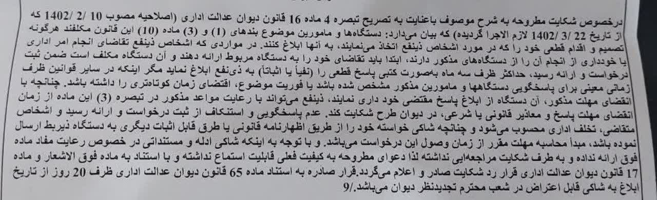 الرئيسية/قانونيقرار رفض الشكوى الصادر استناداً إلى القانون الجديد لديوان العدالة الإدارية.يقرأدقيقة واحدة -الثلاثاء 2024/10/22 - 23:47كود الأخبار:3704يشارك بناءً على الفقرة 4 من المادة 16 من هذا القانون، الذي أصبح نافذاً اعتباراً من 22 خرداد، في الحالات التي يطلب فيها الأشخاص المعنيون تنفيذ أمر إداري أو الامتناع عن تنفيذه، يجب أولاً تقديم طلبهم إلى الجهة المعنية، وبعد مرور فترة زمنية تبلغ ثلاثة أشهر، يكون لديوان العدالة الإدارية صلاحية التدخل والنظر في الأمر. إذا قام الأشخاص بمراجعة ديوان العدالة الإدارية قبل تقديم طلبهم إلى الجهة التنفيذية، يُصدر "قرار رفض الدعوى بناءً على عدم الاستماع". Take less than a minute, register and share your opinion under this post.Insulting or inciting messages will be deleted.اشتراكالقادم بعد ذلك هل تتذكر مذكرتي المُغلقة الموجهة إلى رئيس السلطة القضائية بعد قصف سجن إيفين بالصواريخ؟خواندن دقيقة واحدة مهمات نقابة المحامين في البرنامج الوطني لمكافحة غسيل الأموال وتمويل الإرهابخواندن دقيقتان هل هذا المتحدث على علم بالصلاحيات الواسعة الممنوحة للمحكمة الخاصة لرجال الدين للسماح بالتحقيق وجمع المعلومات من المتهمين والمشتبه بهم والأشخاص المرتبطين بهم؟خواندن دقيقة واحدة محسني إجیه، رئيس السلطة القضائية: لا يمكننا نشر أي محتوى غير صحيح وغير دقيق باسم مكافحة الفساد.خواندن دقيقة واحدة ماذا يحدث حقاً في مجلس إدارة نقابة محاميي جهارمحال وبختياري؟خواندن دقيقة واحدةالأكثر قراءةذكريات أكبر هاشمي رفسنجاني _ 1 اسفند 1378 ولقاء هو بعبدالله جاسبي وقلقه على نتائج الانتخاباتفیلم/أين العمید مرتضى طلاي؟مذكرات أكبر الهاشمي ــ 19 شهريفر 1378ـ استمرت المفاوضات السياسية بين الرجلين مع واز الطبسي حتى اصطحبه إلى طهران، وفي النهاية قرر الهاشمي على ما يبدو أن يخوض انتخابات البرلمان السادس بجدية من هنا.تشير سجلات المجلس الإسلامي الحديثة إلى أن البرلمان ليس رئيس الشؤون ولا يمكنه التدخل أو الموافقة على صلاحيات القائد العام للقوات المسلحة على أي مستوى ناهيك عن الإشراف عليها.ماذا سيحدث لمستقبل إيران مع المرشحين المعلنين للانتخابات الرئاسية؟ / حوار مع الدكتور تقي آزاد ارامكيهل يمكن الشعور بالتعب معك؟تعيين طبيب بيطري من قوا الباسيج رئيساً للشبكة الصحية بدلاً من جراح الأذن والأنف والحنجرة!مذكرات أكبر هاشمي ــ 14 سبتمبر 1378 ــ استمرت لقاءات كبار مديري الجهاز القضائي مع هاشمي رفسنجاني وشكواهم من إهمال رئيس القضاء الجديد هاشمي الشاهرودي.مذكرات أكبر الهاشمي -16 شهريور 1378- التقى الهاشمي مرة أخرى هذه المرة بعد أن التقى الراحل واز الطبسي بجهود عدة لتشجيع الهاشمي على المشاركة في الانتخابات.مذكرات اكبر الهاشمي-18 شهريفر 1378-استمرار جولة الممتلكات والمباني والأعمال في أستان المقدس