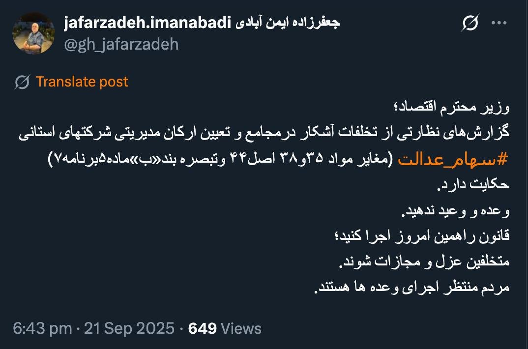 الرئيسية/قانونيمن وفقًا للمادة 64 من قانون الإجراءات الجنائية، سيقوم بإبلاغ الدكتور دشتي، القائم بأعمال رئيس النيابة الخاصة لموظفي الحكومة، بشكل رسمي ومكتوب؟يقرأدقيقة واحدة -الاثنين 2025/09/22 - 00:35كود الأخبار:22723يشارك وزیر محترم اقتصاد؛گزارشهای نظارتی از تخلفات آشکار درمجامع و تعیین ارکان مدیریتی شرکتهای استانی #سهام_عدالت (مغایر مواد ۳۵و۳۸ اصل۴۴ وتبصره بند«ب»ماده۵برنامه۷) حکایت دارد.وعده و وعید ندهید.قانون راهمین امروز اجرا کنید؛متخلفین عزل و مجازات شوند.مردم منتظر اجرای وعده ها هستند.— jafarzadeh.imanabadi جعفرزاده ایمن آبادی (@gh_jafarzadeh) September 21, 2025🔴 درودچه کسی طبق ماده ۶۴ قانون آیین دادرسی کیفری آقای دکتر دشتی سرپرست دادسرای ویژه کارکنان دولت را بصورت کتبی و مستند مطلع خواهد کرد؟— AbdiMedia - Abdollah Abdi (@abdolah_abdi) September 21, 2025 Take less than a minute, register and share your opinion under this post.Insulting or inciting messages will be deleted.اشتراكالقادم بعد ذلك هل تتذكر مذكرتي المُغلقة الموجهة إلى رئيس السلطة القضائية بعد قصف سجن إيفين بالصواريخ؟خواندن دقيقة واحدة مهمات نقابة المحامين في البرنامج الوطني لمكافحة غسيل الأموال وتمويل الإرهابخواندن دقيقتان هل هذا المتحدث على علم بالصلاحيات الواسعة الممنوحة للمحكمة الخاصة لرجال الدين للسماح بالتحقيق وجمع المعلومات من المتهمين والمشتبه بهم والأشخاص المرتبطين بهم؟خواندن دقيقة واحدة محسني إجیه، رئيس السلطة القضائية: لا يمكننا نشر أي محتوى غير صحيح وغير دقيق باسم مكافحة الفساد.خواندن دقيقة واحدة ماذا يحدث حقاً في مجلس إدارة نقابة محاميي جهارمحال وبختياري؟خواندن دقيقة واحدةالأكثر قراءةذكريات أكبر هاشمي رفسنجاني _ 1 اسفند 1378 ولقاء هو بعبدالله جاسبي وقلقه على نتائج الانتخاباتفیلم/أين العمید مرتضى طلاي؟مذكرات أكبر الهاشمي ــ 19 شهريفر 1378ـ استمرت المفاوضات السياسية بين الرجلين مع واز الطبسي حتى اصطحبه إلى طهران، وفي النهاية قرر الهاشمي على ما يبدو أن يخوض انتخابات البرلمان السادس بجدية من هنا.تشير سجلات المجلس الإسلامي الحديثة إلى أن البرلمان ليس رئيس الشؤون ولا يمكنه التدخل أو الموافقة على صلاحيات القائد العام للقوات المسلحة على أي مستوى ناهيك عن الإشراف عليها.ماذا سيحدث لمستقبل إيران مع المرشحين المعلنين للانتخابات الرئاسية؟ / حوار مع الدكتور تقي آزاد ارامكيهل يمكن الشعور بالتعب معك؟تعيين طبيب بيطري من قوا الباسيج رئيساً للشبكة الصحية بدلاً من جراح الأذن والأنف والحنجرة!مذكرات أكبر هاشمي ــ 14 سبتمبر 1378 ــ استمرت لقاءات كبار مديري الجهاز القضائي مع هاشمي رفسنجاني وشكواهم من إهمال رئيس القضاء الجديد هاشمي الشاهرودي.مذكرات أكبر الهاشمي -16 شهريور 1378- التقى الهاشمي مرة أخرى هذه المرة بعد أن التقى الراحل واز الطبسي بجهود عدة لتشجيع الهاشمي على المشاركة في الانتخابات.مذكرات اكبر الهاشمي-18 شهريفر 1378-استمرار جولة الممتلكات والمباني والأعمال في أستان المقدس
