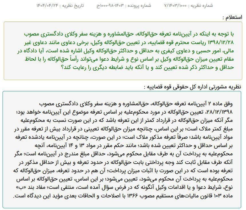 الرئيسية/قانونيالنظرية الاستشارية للدائرة القانونية العامة بالسلطة القضائية حول كيفية تحديد مبلغ أتعاب المحاماة التي يجب على المحكوم عليه دفعها للطرف الآخر.يقرأدقيقة واحدة -الاثنين 2025/11/24 - 17:22كود الأخبار:23645يشارك اخبار ذات صله هل هناك إصرار على منع التهرب الضريبي لدى بعض المحامين؟ Take less than a minute, register and share your opinion under this post.Insulting or inciting messages will be deleted.اشتراكالقادم بعد ذلك هل تتذكر مذكرتي المُغلقة الموجهة إلى رئيس السلطة القضائية بعد قصف سجن إيفين بالصواريخ؟خواندن دقيقة واحدة مهمات نقابة المحامين في البرنامج الوطني لمكافحة غسيل الأموال وتمويل الإرهابخواندن دقيقتان هل هذا المتحدث على علم بالصلاحيات الواسعة الممنوحة للمحكمة الخاصة لرجال الدين للسماح بالتحقيق وجمع المعلومات من المتهمين والمشتبه بهم والأشخاص المرتبطين بهم؟خواندن دقيقة واحدة محسني إجیه، رئيس السلطة القضائية: لا يمكننا نشر أي محتوى غير صحيح وغير دقيق باسم مكافحة الفساد.خواندن دقيقة واحدة ماذا يحدث حقاً في مجلس إدارة نقابة محاميي جهارمحال وبختياري؟خواندن دقيقة واحدةالأكثر قراءةذكريات أكبر هاشمي رفسنجاني _ 1 اسفند 1378 ولقاء هو بعبدالله جاسبي وقلقه على نتائج الانتخاباتفیلم/أين العمید مرتضى طلاي؟مذكرات أكبر الهاشمي ــ 19 شهريفر 1378ـ استمرت المفاوضات السياسية بين الرجلين مع واز الطبسي حتى اصطحبه إلى طهران، وفي النهاية قرر الهاشمي على ما يبدو أن يخوض انتخابات البرلمان السادس بجدية من هنا.تشير سجلات المجلس الإسلامي الحديثة إلى أن البرلمان ليس رئيس الشؤون ولا يمكنه التدخل أو الموافقة على صلاحيات القائد العام للقوات المسلحة على أي مستوى ناهيك عن الإشراف عليها.ماذا سيحدث لمستقبل إيران مع المرشحين المعلنين للانتخابات الرئاسية؟ / حوار مع الدكتور تقي آزاد ارامكيهل يمكن الشعور بالتعب معك؟تعيين طبيب بيطري من قوا الباسيج رئيساً للشبكة الصحية بدلاً من جراح الأذن والأنف والحنجرة!مذكرات أكبر هاشمي ــ 14 سبتمبر 1378 ــ استمرت لقاءات كبار مديري الجهاز القضائي مع هاشمي رفسنجاني وشكواهم من إهمال رئيس القضاء الجديد هاشمي الشاهرودي.مذكرات أكبر الهاشمي -16 شهريور 1378- التقى الهاشمي مرة أخرى هذه المرة بعد أن التقى الراحل واز الطبسي بجهود عدة لتشجيع الهاشمي على المشاركة في الانتخابات.مذكرات اكبر الهاشمي-18 شهريفر 1378-استمرار جولة الممتلكات والمباني والأعمال في أستان المقدس
