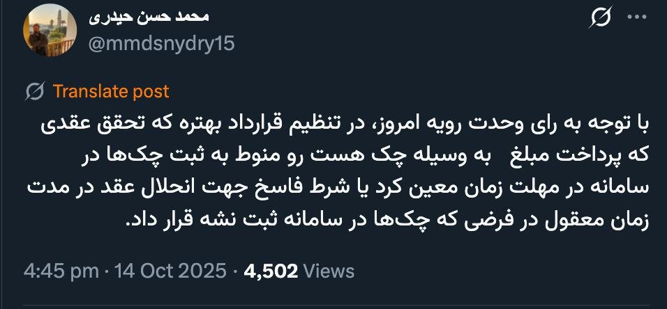 الرئيسية/قانونياقتراح محامٍ لصياغة العقود بالشيكات في ضوء الحكم الاجماعي الأخير للمحكمة العليايقرأ0 -الجمعة 2025/10/17 - 20:04كود الأخبار:23073يشارك Take less than a minute, register and share your opinion under this post.Insulting or inciting messages will be deleted.اشتراكالقادم بعد ذلك هل تتذكر مذكرتي المُغلقة الموجهة إلى رئيس السلطة القضائية بعد قصف سجن إيفين بالصواريخ؟خواندن دقيقة واحدة مهمات نقابة المحامين في البرنامج الوطني لمكافحة غسيل الأموال وتمويل الإرهابخواندن دقيقتان هل هذا المتحدث على علم بالصلاحيات الواسعة الممنوحة للمحكمة الخاصة لرجال الدين للسماح بالتحقيق وجمع المعلومات من المتهمين والمشتبه بهم والأشخاص المرتبطين بهم؟خواندن دقيقة واحدة محسني إجیه، رئيس السلطة القضائية: لا يمكننا نشر أي محتوى غير صحيح وغير دقيق باسم مكافحة الفساد.خواندن دقيقة واحدة ماذا يحدث حقاً في مجلس إدارة نقابة محاميي جهارمحال وبختياري؟خواندن دقيقة واحدةالأكثر قراءةذكريات أكبر هاشمي رفسنجاني _ 1 اسفند 1378 ولقاء هو بعبدالله جاسبي وقلقه على نتائج الانتخاباتفیلم/أين العمید مرتضى طلاي؟مذكرات أكبر الهاشمي ــ 19 شهريفر 1378ـ استمرت المفاوضات السياسية بين الرجلين مع واز الطبسي حتى اصطحبه إلى طهران، وفي النهاية قرر الهاشمي على ما يبدو أن يخوض انتخابات البرلمان السادس بجدية من هنا.تشير سجلات المجلس الإسلامي الحديثة إلى أن البرلمان ليس رئيس الشؤون ولا يمكنه التدخل أو الموافقة على صلاحيات القائد العام للقوات المسلحة على أي مستوى ناهيك عن الإشراف عليها.ماذا سيحدث لمستقبل إيران مع المرشحين المعلنين للانتخابات الرئاسية؟ / حوار مع الدكتور تقي آزاد ارامكيهل يمكن الشعور بالتعب معك؟تعيين طبيب بيطري من قوا الباسيج رئيساً للشبكة الصحية بدلاً من جراح الأذن والأنف والحنجرة!مذكرات أكبر هاشمي ــ 14 سبتمبر 1378 ــ استمرت لقاءات كبار مديري الجهاز القضائي مع هاشمي رفسنجاني وشكواهم من إهمال رئيس القضاء الجديد هاشمي الشاهرودي.مذكرات أكبر الهاشمي -16 شهريور 1378- التقى الهاشمي مرة أخرى هذه المرة بعد أن التقى الراحل واز الطبسي بجهود عدة لتشجيع الهاشمي على المشاركة في الانتخابات.مذكرات اكبر الهاشمي-18 شهريفر 1378-استمرار جولة الممتلكات والمباني والأعمال في أستان المقدس