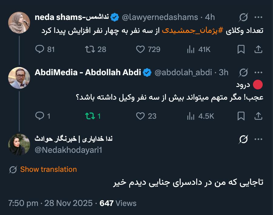 الرئيسية/قانونيعجباً! هل يمكن للمتهم أن يكون لديه أكثر من ثلاثة محامين؟يقرأدقيقة واحدة -السبت 2025/11/29 - 13:35كود الأخبار:23746يشارك وفقاً للقانون، يمكن للمتهم أن يكون لديه ما يصل إلى ثلاثة محامين في وقت واحد، ولكنه كتب أن الشخص المذكور لديه أربعة محامين. هل هذا ممكن؟ على الرغم من أنني أكدت مراراً على مراعاة حقوق جميع المتهمين وفقاً للقانون. 🔴 درودعجب! مگر متهم میتواند بیش از سه نفر وکیل داشته باشد؟— AbdiMedia - Abdollah Abdi (@abdolah_abdi) November 28, 2025تاجایی که من در دادسرای جنایی دیدم خیر— ندا خدایاری | خبرنگار حوادث (@Nedakhodayari1) November 28, 2025🔴 درود💢 طبق قانون متهم میتواند تا سه وکیل #همزمان داشته باشد ولی ایشان نوشته نامبرده، چهار وکیل دارد، مگر میشود؟🔸اگرچه من بارها به رعایت حقوق همه متهمان طبق قانون تاکید کردم.— AbdiMedia - Abdollah Abdi (@abdolah_abdi) November 28, 2025 Take less than a minute, register and share your opinion under this post.Insulting or inciting messages will be deleted.اشتراكالقادم بعد ذلك هل تتذكر مذكرتي المُغلقة الموجهة إلى رئيس السلطة القضائية بعد قصف سجن إيفين بالصواريخ؟خواندن دقيقة واحدة مهمات نقابة المحامين في البرنامج الوطني لمكافحة غسيل الأموال وتمويل الإرهابخواندن دقيقتان هل هذا المتحدث على علم بالصلاحيات الواسعة الممنوحة للمحكمة الخاصة لرجال الدين للسماح بالتحقيق وجمع المعلومات من المتهمين والمشتبه بهم والأشخاص المرتبطين بهم؟خواندن دقيقة واحدة محسني إجیه، رئيس السلطة القضائية: لا يمكننا نشر أي محتوى غير صحيح وغير دقيق باسم مكافحة الفساد.خواندن دقيقة واحدة ماذا يحدث حقاً في مجلس إدارة نقابة محاميي جهارمحال وبختياري؟خواندن دقيقة واحدةالأكثر قراءةذكريات أكبر هاشمي رفسنجاني _ 1 اسفند 1378 ولقاء هو بعبدالله جاسبي وقلقه على نتائج الانتخاباتفیلم/أين العمید مرتضى طلاي؟مذكرات أكبر الهاشمي ــ 19 شهريفر 1378ـ استمرت المفاوضات السياسية بين الرجلين مع واز الطبسي حتى اصطحبه إلى طهران، وفي النهاية قرر الهاشمي على ما يبدو أن يخوض انتخابات البرلمان السادس بجدية من هنا.تشير سجلات المجلس الإسلامي الحديثة إلى أن البرلمان ليس رئيس الشؤون ولا يمكنه التدخل أو الموافقة على صلاحيات القائد العام للقوات المسلحة على أي مستوى ناهيك عن الإشراف عليها.ماذا سيحدث لمستقبل إيران مع المرشحين المعلنين للانتخابات الرئاسية؟ / حوار مع الدكتور تقي آزاد ارامكيهل يمكن الشعور بالتعب معك؟تعيين طبيب بيطري من قوا الباسيج رئيساً للشبكة الصحية بدلاً من جراح الأذن والأنف والحنجرة!مذكرات أكبر هاشمي ــ 14 سبتمبر 1378 ــ استمرت لقاءات كبار مديري الجهاز القضائي مع هاشمي رفسنجاني وشكواهم من إهمال رئيس القضاء الجديد هاشمي الشاهرودي.مذكرات أكبر الهاشمي -16 شهريور 1378- التقى الهاشمي مرة أخرى هذه المرة بعد أن التقى الراحل واز الطبسي بجهود عدة لتشجيع الهاشمي على المشاركة في الانتخابات.مذكرات اكبر الهاشمي-18 شهريفر 1378-استمرار جولة الممتلكات والمباني والأعمال في أستان المقدس