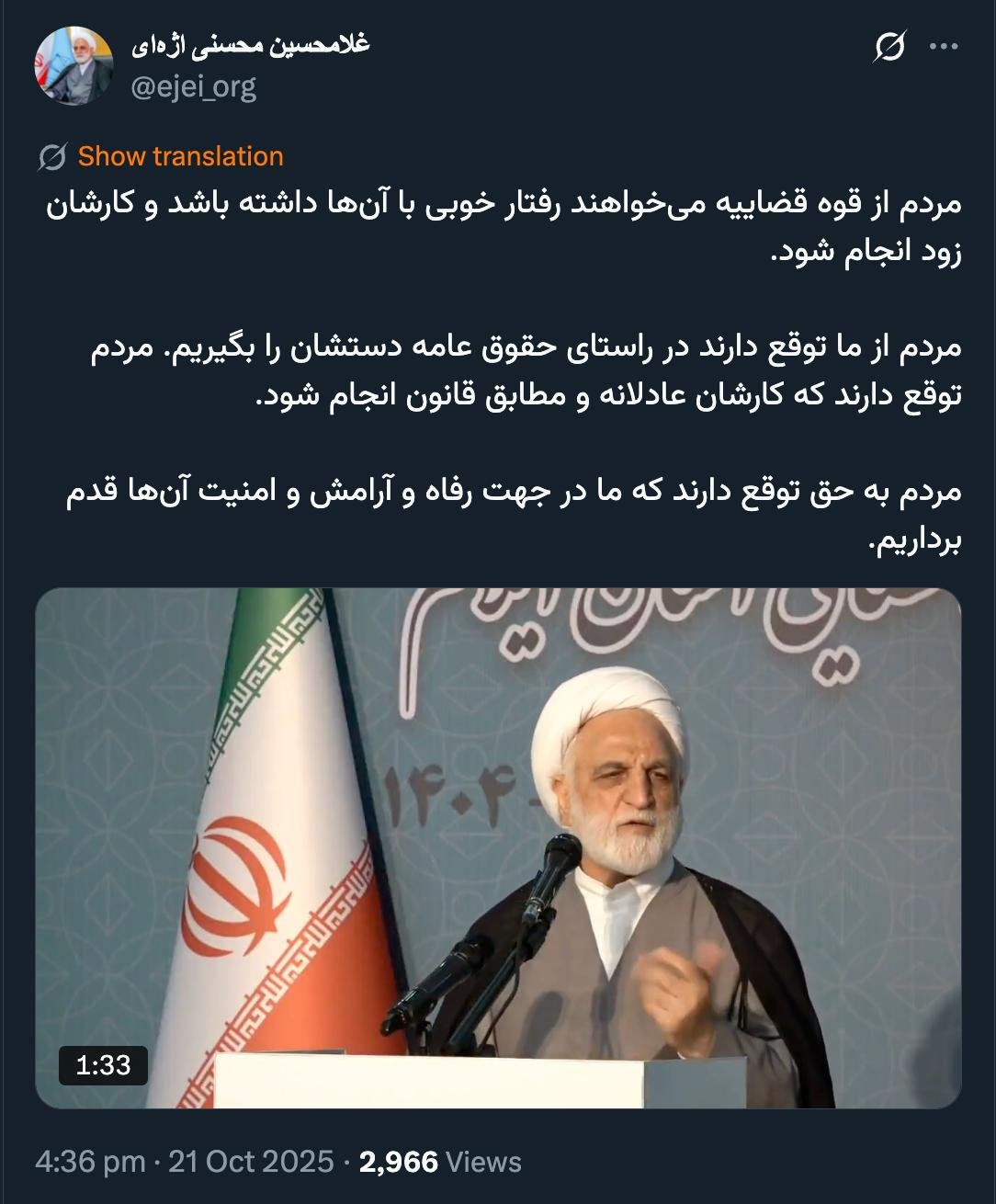 الرئيسية/قانونيالسيد الرئيس التنفيذي لوكالة ميزان دارود للأنباء، هل هذا الحساب مملوك للشيخ غلام حسين محسني أجيه أم لا؟يقرأدقيقة واحدة -الخميس 2025/10/23 - 01:12كود الأخبار:23165يشارك إذا لم يكن الأمر كذلك، أعد تأكيد عدم الإسناد هذامردم از قوه قضاییه میخواهند رفتار خوبی با آنها داشته باشد و کارشان زود انجام شود.مردم از ما توقع دارند در راستای حقوق عامه دستشان را بگیریم. مردم توقع دارند که کارشان عادلانه و مطابق قانون انجام شود.مردم به حق توقع دارند که ما در جهت رفاه و آرامش و امنیت آنها قدم برداریم. pic.twitter.com/EQH1RxzyMK— غلامحسین محسنی اژهای (@ejei_org) October 21, 2025🔴 آقای مدیرعامل خبرگزاری میزان، درود@MKeshtdar @MizanNewsAgency 💢بالاخره این حساب کاربری متعلق به شیخ غلامحسین محسنی اژیه هست یا خیر؟🔸اگر نیست، مجدداً این عدم انتساب را تاکید کنید https://t.co/MldUm7hbhA— AbdiMedia - Abdollah Abdi (@abdolah_abdi) October 22, 2025 Take less than a minute, register and share your opinion under this post.Insulting or inciting messages will be deleted.اشتراكالقادم بعد ذلك هل تتذكر مذكرتي المُغلقة الموجهة إلى رئيس السلطة القضائية بعد قصف سجن إيفين بالصواريخ؟خواندن دقيقة واحدة مهمات نقابة المحامين في البرنامج الوطني لمكافحة غسيل الأموال وتمويل الإرهابخواندن دقيقتان هل هذا المتحدث على علم بالصلاحيات الواسعة الممنوحة للمحكمة الخاصة لرجال الدين للسماح بالتحقيق وجمع المعلومات من المتهمين والمشتبه بهم والأشخاص المرتبطين بهم؟خواندن دقيقة واحدة محسني إجیه، رئيس السلطة القضائية: لا يمكننا نشر أي محتوى غير صحيح وغير دقيق باسم مكافحة الفساد.خواندن دقيقة واحدة ماذا يحدث حقاً في مجلس إدارة نقابة محاميي جهارمحال وبختياري؟خواندن دقيقة واحدةالأكثر قراءةذكريات أكبر هاشمي رفسنجاني _ 1 اسفند 1378 ولقاء هو بعبدالله جاسبي وقلقه على نتائج الانتخاباتفیلم/أين العمید مرتضى طلاي؟مذكرات أكبر الهاشمي ــ 19 شهريفر 1378ـ استمرت المفاوضات السياسية بين الرجلين مع واز الطبسي حتى اصطحبه إلى طهران، وفي النهاية قرر الهاشمي على ما يبدو أن يخوض انتخابات البرلمان السادس بجدية من هنا.تشير سجلات المجلس الإسلامي الحديثة إلى أن البرلمان ليس رئيس الشؤون ولا يمكنه التدخل أو الموافقة على صلاحيات القائد العام للقوات المسلحة على أي مستوى ناهيك عن الإشراف عليها.ماذا سيحدث لمستقبل إيران مع المرشحين المعلنين للانتخابات الرئاسية؟ / حوار مع الدكتور تقي آزاد ارامكيهل يمكن الشعور بالتعب معك؟تعيين طبيب بيطري من قوا الباسيج رئيساً للشبكة الصحية بدلاً من جراح الأذن والأنف والحنجرة!مذكرات أكبر هاشمي ــ 14 سبتمبر 1378 ــ استمرت لقاءات كبار مديري الجهاز القضائي مع هاشمي رفسنجاني وشكواهم من إهمال رئيس القضاء الجديد هاشمي الشاهرودي.مذكرات أكبر الهاشمي -16 شهريور 1378- التقى الهاشمي مرة أخرى هذه المرة بعد أن التقى الراحل واز الطبسي بجهود عدة لتشجيع الهاشمي على المشاركة في الانتخابات.مذكرات اكبر الهاشمي-18 شهريفر 1378-استمرار جولة الممتلكات والمباني والأعمال في أستان المقدس