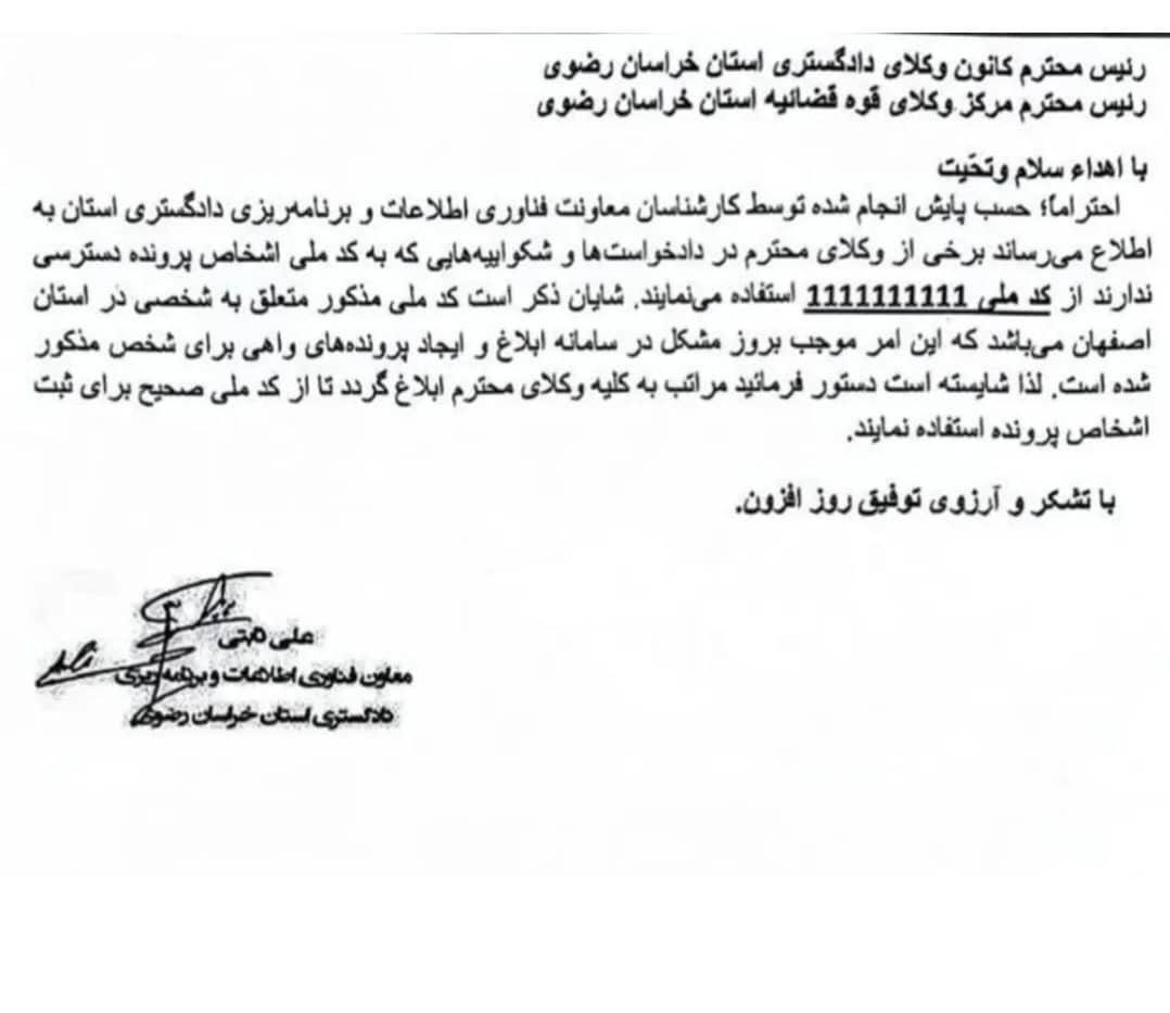 الرئيسية/قانونيتحذر دائرة العدل العامة في محافظة خراسان رضوي نقابات المحامين من استخدام الرمز الوطني: 1111111111يقرأدقيقة واحدة -الأحد 2025/10/05 - 10:36كود الأخبار:22941يشارك وتوجد نفس المشكلة بالضبط بالنسبة لأرقام الهواتف المحمولة في البنوك والمؤسسات الأخرى. Take less than a minute, register and share your opinion under this post.Insulting or inciting messages will be deleted.اشتراكالقادم بعد ذلك هل تتذكر مذكرتي المُغلقة الموجهة إلى رئيس السلطة القضائية بعد قصف سجن إيفين بالصواريخ؟خواندن دقيقة واحدة مهمات نقابة المحامين في البرنامج الوطني لمكافحة غسيل الأموال وتمويل الإرهابخواندن دقيقتان هل هذا المتحدث على علم بالصلاحيات الواسعة الممنوحة للمحكمة الخاصة لرجال الدين للسماح بالتحقيق وجمع المعلومات من المتهمين والمشتبه بهم والأشخاص المرتبطين بهم؟خواندن دقيقة واحدة محسني إجیه، رئيس السلطة القضائية: لا يمكننا نشر أي محتوى غير صحيح وغير دقيق باسم مكافحة الفساد.خواندن دقيقة واحدة ماذا يحدث حقاً في مجلس إدارة نقابة محاميي جهارمحال وبختياري؟خواندن دقيقة واحدةالأكثر قراءةذكريات أكبر هاشمي رفسنجاني _ 1 اسفند 1378 ولقاء هو بعبدالله جاسبي وقلقه على نتائج الانتخاباتفیلم/أين العمید مرتضى طلاي؟مذكرات أكبر الهاشمي ــ 19 شهريفر 1378ـ استمرت المفاوضات السياسية بين الرجلين مع واز الطبسي حتى اصطحبه إلى طهران، وفي النهاية قرر الهاشمي على ما يبدو أن يخوض انتخابات البرلمان السادس بجدية من هنا.تشير سجلات المجلس الإسلامي الحديثة إلى أن البرلمان ليس رئيس الشؤون ولا يمكنه التدخل أو الموافقة على صلاحيات القائد العام للقوات المسلحة على أي مستوى ناهيك عن الإشراف عليها.ماذا سيحدث لمستقبل إيران مع المرشحين المعلنين للانتخابات الرئاسية؟ / حوار مع الدكتور تقي آزاد ارامكيهل يمكن الشعور بالتعب معك؟تعيين طبيب بيطري من قوا الباسيج رئيساً للشبكة الصحية بدلاً من جراح الأذن والأنف والحنجرة!مذكرات أكبر هاشمي ــ 14 سبتمبر 1378 ــ استمرت لقاءات كبار مديري الجهاز القضائي مع هاشمي رفسنجاني وشكواهم من إهمال رئيس القضاء الجديد هاشمي الشاهرودي.مذكرات أكبر الهاشمي -16 شهريور 1378- التقى الهاشمي مرة أخرى هذه المرة بعد أن التقى الراحل واز الطبسي بجهود عدة لتشجيع الهاشمي على المشاركة في الانتخابات.مذكرات اكبر الهاشمي-18 شهريفر 1378-استمرار جولة الممتلكات والمباني والأعمال في أستان المقدس