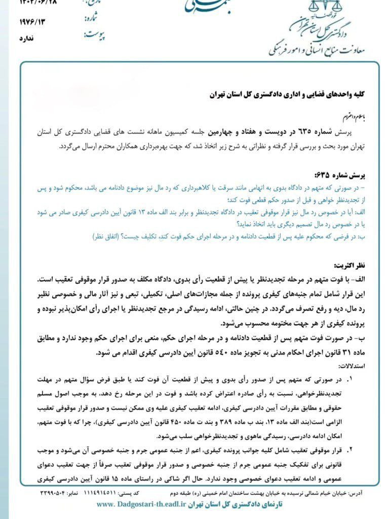 الرئيسية/قانونياجتماع قضائي في طهران حول وضعية استعادة الممتلكات في حال وفاة المتهميقرأدقيقة واحدة -السبت 2025/10/11 - 13:29كود الأخبار:23024يشارك في حالة وفاة المتهم قبل صدور الحكم النهائي (في مرحلة الاستئناف) يتم إصدار أمر بوقف التنفيذ لجميع الإجراءاتالصورة الصورة الصورة ردًا على سؤال حول وضعية مصادرة الممتلكات في حالة وفاة المتهم، أصدر مجلس القضاء الإقليمي في طهران رأيًا بالأغلبية يفيد بأنه في حال وفاة المتهم قبل صدور الحكم النهائي، تُغلق القضية الجنائية برمتها، بما في ذلك مصادرة الممتلكات.رأي الأغلبية (إجماع):- في حال وفاة المتهم قبل صدور الحكم النهائي (في مرحلة الاستئناف)، يكون إصدار أمر بوقف الملاحقة القضائية لجميع جوانب القضية، بما في ذلك مصادرة الممتلكات، أمرًا إلزاميًا. ويشمل هذا الأمر جميع الآثار الجنائية والمالية، كالعقوبات ومصادرة الممتلكات والدية.- في حال وفاة المتهم بعد صدور الحكم النهائي، يُمكن تنفيذ الحكم من تركة المتوفى.الحجج الرئيسية للأغلبية:1. لا يسمح قانون الإجراءات الجنائية بفصل الجوانب العامة والخاصة للجريمة في حال وفاة المتهم.٢. إن تحقق المسؤولية الجنائية وعواقبها يتوقف على حياة المتهم حتى انتهاء الإجراءات.٣. ويؤكد هذا التفسير ما استقر عليه القضاء وقرارات المحكمة العليا. Take less than a minute, register and share your opinion under this post.Insulting or inciting messages will be deleted.اشتراكالقادم بعد ذلك هل تتذكر مذكرتي المُغلقة الموجهة إلى رئيس السلطة القضائية بعد قصف سجن إيفين بالصواريخ؟خواندن دقيقة واحدة مهمات نقابة المحامين في البرنامج الوطني لمكافحة غسيل الأموال وتمويل الإرهابخواندن دقيقتان هل هذا المتحدث على علم بالصلاحيات الواسعة الممنوحة للمحكمة الخاصة لرجال الدين للسماح بالتحقيق وجمع المعلومات من المتهمين والمشتبه بهم والأشخاص المرتبطين بهم؟خواندن دقيقة واحدة محسني إجیه، رئيس السلطة القضائية: لا يمكننا نشر أي محتوى غير صحيح وغير دقيق باسم مكافحة الفساد.خواندن دقيقة واحدة ماذا يحدث حقاً في مجلس إدارة نقابة محاميي جهارمحال وبختياري؟خواندن دقيقة واحدةالأكثر قراءةذكريات أكبر هاشمي رفسنجاني _ 1 اسفند 1378 ولقاء هو بعبدالله جاسبي وقلقه على نتائج الانتخاباتفیلم/أين العمید مرتضى طلاي؟مذكرات أكبر الهاشمي ــ 19 شهريفر 1378ـ استمرت المفاوضات السياسية بين الرجلين مع واز الطبسي حتى اصطحبه إلى طهران، وفي النهاية قرر الهاشمي على ما يبدو أن يخوض انتخابات البرلمان السادس بجدية من هنا.تشير سجلات المجلس الإسلامي الحديثة إلى أن البرلمان ليس رئيس الشؤون ولا يمكنه التدخل أو الموافقة على صلاحيات القائد العام للقوات المسلحة على أي مستوى ناهيك عن الإشراف عليها.ماذا سيحدث لمستقبل إيران مع المرشحين المعلنين للانتخابات الرئاسية؟ / حوار مع الدكتور تقي آزاد ارامكيهل يمكن الشعور بالتعب معك؟تعيين طبيب بيطري من قوا الباسيج رئيساً للشبكة الصحية بدلاً من جراح الأذن والأنف والحنجرة!مذكرات أكبر هاشمي ــ 14 سبتمبر 1378 ــ استمرت لقاءات كبار مديري الجهاز القضائي مع هاشمي رفسنجاني وشكواهم من إهمال رئيس القضاء الجديد هاشمي الشاهرودي.مذكرات أكبر الهاشمي -16 شهريور 1378- التقى الهاشمي مرة أخرى هذه المرة بعد أن التقى الراحل واز الطبسي بجهود عدة لتشجيع الهاشمي على المشاركة في الانتخابات.مذكرات اكبر الهاشمي-18 شهريفر 1378-استمرار جولة الممتلكات والمباني والأعمال في أستان المقدس