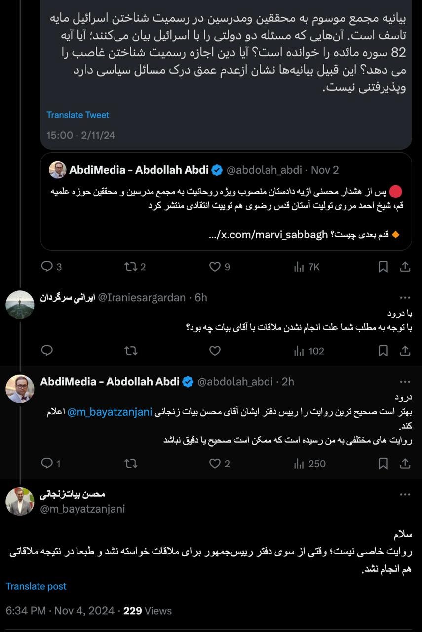 الرئيسية/سياسةبرواية رئيس مكتب آية الله الشيخ أسد الله بيات زنجاني: في سفر مسعود طبيب إلى قم لم يتم تقديم طلب للقاء آية الله بيات زنجاني.يقرأ0 -الاثنين 2024/11/04 - 23:55كود الأخبار:7994يشارك Take less than a minute, register and share your opinion under this post.Insulting or inciting messages will be deleted.اشتراكالقادم بعد ذلك بور محمدي: نحن متهورون في حماية المعلومات.خواندن دقيقة واحدة تاج زاده في مقابلة مع مجلة لوبوئن: يمكن للشعب أن ينهي حكم رجال الدين في إيران.خواندن %count دقائق بعد شكوى حميد رسايي واستفسار (طلب معلومات/توضيح) المدعي العام من محكمة رجال الدين الخاصة ومجلس صيانة الدستور.خواندن دقيقة واحدة تحياتي للسيد محسني إژيه، رئيس السلطة القضائية، والسيد مرتضوي، مساعد الإشراف والتفتيش في المحكمة العليا، والسيد دهقاني، رئيس القضاء في محافظة خوزستان.خواندن دقيقة واحدة كل تعليقاتنا وتغريداتنا في هذا الفضاء ستبقى إرثاً حتى لو حذفناها، وفي المستقبل سيُحاكموننا (أو سيحكمون علينا) بقسوة بسببها جميعاً.خواندن دقيقة واحدةالأكثر قراءةذكريات أكبر هاشمي رفسنجاني _ 1 اسفند 1378 ولقاء هو بعبدالله جاسبي وقلقه على نتائج الانتخاباتفیلم/أين العمید مرتضى طلاي؟مذكرات أكبر الهاشمي ــ 19 شهريفر 1378ـ استمرت المفاوضات السياسية بين الرجلين مع واز الطبسي حتى اصطحبه إلى طهران، وفي النهاية قرر الهاشمي على ما يبدو أن يخوض انتخابات البرلمان السادس بجدية من هنا.تشير سجلات المجلس الإسلامي الحديثة إلى أن البرلمان ليس رئيس الشؤون ولا يمكنه التدخل أو الموافقة على صلاحيات القائد العام للقوات المسلحة على أي مستوى ناهيك عن الإشراف عليها.ماذا سيحدث لمستقبل إيران مع المرشحين المعلنين للانتخابات الرئاسية؟ / حوار مع الدكتور تقي آزاد ارامكيهل يمكن الشعور بالتعب معك؟تعيين طبيب بيطري من قوا الباسيج رئيساً للشبكة الصحية بدلاً من جراح الأذن والأنف والحنجرة!مذكرات أكبر هاشمي ــ 14 سبتمبر 1378 ــ استمرت لقاءات كبار مديري الجهاز القضائي مع هاشمي رفسنجاني وشكواهم من إهمال رئيس القضاء الجديد هاشمي الشاهرودي.مذكرات أكبر الهاشمي -16 شهريور 1378- التقى الهاشمي مرة أخرى هذه المرة بعد أن التقى الراحل واز الطبسي بجهود عدة لتشجيع الهاشمي على المشاركة في الانتخابات.مذكرات اكبر الهاشمي-18 شهريفر 1378-استمرار جولة الممتلكات والمباني والأعمال في أستان المقدس