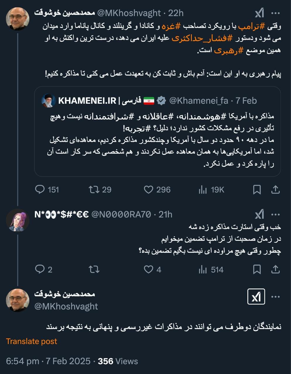 الرئيسية/سياسةكبير مفاوضي الاستخبارات، قد وافق على تصريحات آية الله علنا والاجتماع العلني اليوم مع حماس وحدثين محتملين آخرين. اللعبة مثيرة للاهتمام ، أليس كذلك؟يقرأدقيقة واحدة -السبت 2025/02/08 - 16:11كود الأخبار:13146يشارك وقتی #ترامپ با رویکرد تصاحب #غزه و کانادا و گرینلند و کانال پاناما وارد میدان می شود ودستور #فشار_حداکثری علیه ایران می دهد، درست ترین واکنش به او همین موضع #رهبری است. پیام رهبری به او این است: آدم باش و ثابت کن به تعهدت عمل می کنی تا مذاکره کنیم! https://t.co/rJ6GwfaoCF— محمدحسین خوشوقت (@MKhoshvaght) February 7, 2025نمایندگان دوطرف می توانند در مذاکرات غیررسمی و پنهانی به نتیجه برسند— محمدحسین خوشوقت (@MKhoshvaght) February 7, 2025🔴 آقای خوشوقتدرود💢 مذاکره کننده ارشد اطلاعاتی، دیروز #جمعه در مورد سخنان آیتالله بصورت علنی و دیدار امروز علنی با حماس و دو رویداد احتمالی دیگر هم توافق کرده بود؟بازی #طرفین جالب است، نیست؟📍 https://t.co/EJ1otLIXZf— AbdiMedia - Abdollah Abdi (@abdolah_abdi) February 8, 2025 Take less than a minute, register and share your opinion under this post.Insulting or inciting messages will be deleted.اشتراكالقادم بعد ذلك بور محمدي: نحن متهورون في حماية المعلومات.خواندن دقيقة واحدة تاج زاده في مقابلة مع مجلة لوبوئن: يمكن للشعب أن ينهي حكم رجال الدين في إيران.خواندن %count دقائق بعد شكوى حميد رسايي واستفسار (طلب معلومات/توضيح) المدعي العام من محكمة رجال الدين الخاصة ومجلس صيانة الدستور.خواندن دقيقة واحدة تحياتي للسيد محسني إژيه، رئيس السلطة القضائية، والسيد مرتضوي، مساعد الإشراف والتفتيش في المحكمة العليا، والسيد دهقاني، رئيس القضاء في محافظة خوزستان.خواندن دقيقة واحدة كل تعليقاتنا وتغريداتنا في هذا الفضاء ستبقى إرثاً حتى لو حذفناها، وفي المستقبل سيُحاكموننا (أو سيحكمون علينا) بقسوة بسببها جميعاً.خواندن دقيقة واحدةالأكثر قراءةذكريات أكبر هاشمي رفسنجاني _ 1 اسفند 1378 ولقاء هو بعبدالله جاسبي وقلقه على نتائج الانتخاباتفیلم/أين العمید مرتضى طلاي؟مذكرات أكبر الهاشمي ــ 19 شهريفر 1378ـ استمرت المفاوضات السياسية بين الرجلين مع واز الطبسي حتى اصطحبه إلى طهران، وفي النهاية قرر الهاشمي على ما يبدو أن يخوض انتخابات البرلمان السادس بجدية من هنا.تشير سجلات المجلس الإسلامي الحديثة إلى أن البرلمان ليس رئيس الشؤون ولا يمكنه التدخل أو الموافقة على صلاحيات القائد العام للقوات المسلحة على أي مستوى ناهيك عن الإشراف عليها.ماذا سيحدث لمستقبل إيران مع المرشحين المعلنين للانتخابات الرئاسية؟ / حوار مع الدكتور تقي آزاد ارامكيهل يمكن الشعور بالتعب معك؟تعيين طبيب بيطري من قوا الباسيج رئيساً للشبكة الصحية بدلاً من جراح الأذن والأنف والحنجرة!مذكرات أكبر هاشمي ــ 14 سبتمبر 1378 ــ استمرت لقاءات كبار مديري الجهاز القضائي مع هاشمي رفسنجاني وشكواهم من إهمال رئيس القضاء الجديد هاشمي الشاهرودي.مذكرات أكبر الهاشمي -16 شهريور 1378- التقى الهاشمي مرة أخرى هذه المرة بعد أن التقى الراحل واز الطبسي بجهود عدة لتشجيع الهاشمي على المشاركة في الانتخابات.مذكرات اكبر الهاشمي-18 شهريفر 1378-استمرار جولة الممتلكات والمباني والأعمال في أستان المقدس