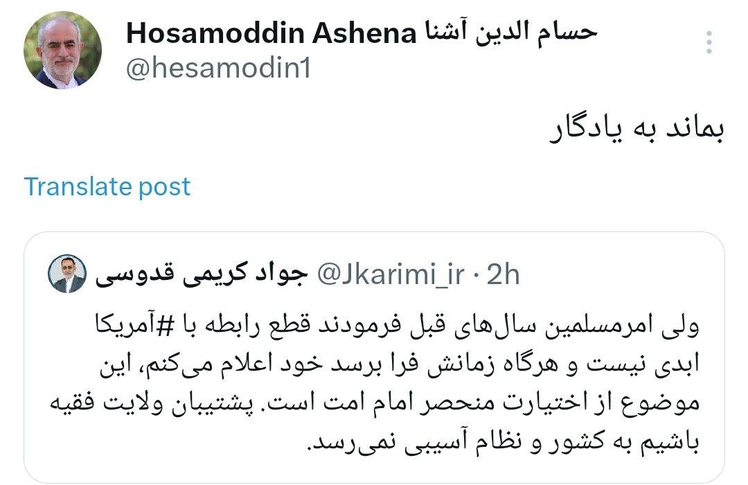الرئيسية/سياسة تغريدة مختلفة لكريمي الغدوسي، عضو البرلمان المتشدد في فترات سابقة، ورد حسام الدين آشنا عليهيقرأ0 -الثلاثاء 2025/01/21 - 15:09كود الأخبار:12154يشارك Take less than a minute, register and share your opinion under this post.Insulting or inciting messages will be deleted.اشتراكالقادم بعد ذلك بور محمدي: نحن متهورون في حماية المعلومات.خواندن دقيقة واحدة تاج زاده في مقابلة مع مجلة لوبوئن: يمكن للشعب أن ينهي حكم رجال الدين في إيران.خواندن %count دقائق بعد شكوى حميد رسايي واستفسار (طلب معلومات/توضيح) المدعي العام من محكمة رجال الدين الخاصة ومجلس صيانة الدستور.خواندن دقيقة واحدة تحياتي للسيد محسني إژيه، رئيس السلطة القضائية، والسيد مرتضوي، مساعد الإشراف والتفتيش في المحكمة العليا، والسيد دهقاني، رئيس القضاء في محافظة خوزستان.خواندن دقيقة واحدة كل تعليقاتنا وتغريداتنا في هذا الفضاء ستبقى إرثاً حتى لو حذفناها، وفي المستقبل سيُحاكموننا (أو سيحكمون علينا) بقسوة بسببها جميعاً.خواندن دقيقة واحدةالأكثر قراءةذكريات أكبر هاشمي رفسنجاني _ 1 اسفند 1378 ولقاء هو بعبدالله جاسبي وقلقه على نتائج الانتخاباتفیلم/أين العمید مرتضى طلاي؟مذكرات أكبر الهاشمي ــ 19 شهريفر 1378ـ استمرت المفاوضات السياسية بين الرجلين مع واز الطبسي حتى اصطحبه إلى طهران، وفي النهاية قرر الهاشمي على ما يبدو أن يخوض انتخابات البرلمان السادس بجدية من هنا.تشير سجلات المجلس الإسلامي الحديثة إلى أن البرلمان ليس رئيس الشؤون ولا يمكنه التدخل أو الموافقة على صلاحيات القائد العام للقوات المسلحة على أي مستوى ناهيك عن الإشراف عليها.ماذا سيحدث لمستقبل إيران مع المرشحين المعلنين للانتخابات الرئاسية؟ / حوار مع الدكتور تقي آزاد ارامكيهل يمكن الشعور بالتعب معك؟تعيين طبيب بيطري من قوا الباسيج رئيساً للشبكة الصحية بدلاً من جراح الأذن والأنف والحنجرة!مذكرات أكبر هاشمي ــ 14 سبتمبر 1378 ــ استمرت لقاءات كبار مديري الجهاز القضائي مع هاشمي رفسنجاني وشكواهم من إهمال رئيس القضاء الجديد هاشمي الشاهرودي.مذكرات أكبر الهاشمي -16 شهريور 1378- التقى الهاشمي مرة أخرى هذه المرة بعد أن التقى الراحل واز الطبسي بجهود عدة لتشجيع الهاشمي على المشاركة في الانتخابات.مذكرات اكبر الهاشمي-18 شهريفر 1378-استمرار جولة الممتلكات والمباني والأعمال في أستان المقدس