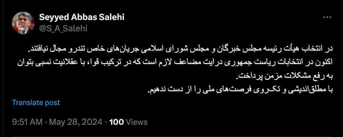 الرئيسية/سياسة/السياسة الداخليةتغريدة مدروسة لسيد عباس صالحي، وزير الثقافة والإرشاد الإسلامي السابق ورئيس تحرير معهد وصحيفة اطلاعات، الذي عينه آية الله خامنئييقرأدقيقة واحدة -الاثنين 2024/10/21 - 07:22كود الأخبار:5409يشارك المعين من قبل آية الله خامنئي:"في انتخاب هيئة رئاسة مجلس الخبراء ومجلس الشورى الإسلامي، لم تتح الفرصة لبعض التيارات المتشددة.الآن ، في الانتخابات الرئاسية ، من الضروري أن تكون لبقا مضاعفا حتى يتسنى حل المشكلات المزمنة في مزيج من السلطات ، مع عقلانية نسبية.يجب ألا نفوت الفرص الوطنية بالاستبداد والأحادية". Take less than a minute, register and share your opinion under this post.Insulting or inciting messages will be deleted.اشتراكالقادم بعد ذلك وأخيرا دعم النائب الأول لرئيس الجمهورية لوزير الشؤون الاقتصادية والماليةخواندن 0 كيهان: في عنبر النساء في سجن إيفين، سجينات سياسيات بحوزتهم مشروبات كحولية مصنوعة يدوياخواندن دقيقة واحدة اهتمام مجلس صيانة الدستور بالغموض في موقفه بشأن قانون الحجاب والعفافخواندن دقيقة واحدة دكتور عليرضا رييسي، معاون الصحة في وزارة الصحة، في خطوة مشكورة، طلب في رسالة إلى الدكتور ظفرقندي إعفاءً ضريبيًا لجميع العاملين في القطاع الصحي، مثل الاقتراح المطروح للممرضاتخواندن 0 المتحدث باسم الحكومة: تم تعيين محمدصادق معتمديان كحاكم لطهران وأكبر بهنامجو كحاكم لقُم من قبل مجلس الوزراء.خواندن 0الأكثر قراءةذكريات أكبر هاشمي رفسنجاني _ 1 اسفند 1378 ولقاء هو بعبدالله جاسبي وقلقه على نتائج الانتخاباتفیلم/أين العمید مرتضى طلاي؟مذكرات أكبر الهاشمي ــ 19 شهريفر 1378ـ استمرت المفاوضات السياسية بين الرجلين مع واز الطبسي حتى اصطحبه إلى طهران، وفي النهاية قرر الهاشمي على ما يبدو أن يخوض انتخابات البرلمان السادس بجدية من هنا.تشير سجلات المجلس الإسلامي الحديثة إلى أن البرلمان ليس رئيس الشؤون ولا يمكنه التدخل أو الموافقة على صلاحيات القائد العام للقوات المسلحة على أي مستوى ناهيك عن الإشراف عليها.ماذا سيحدث لمستقبل إيران مع المرشحين المعلنين للانتخابات الرئاسية؟ / حوار مع الدكتور تقي آزاد ارامكيهل يمكن الشعور بالتعب معك؟تعيين طبيب بيطري من قوا الباسيج رئيساً للشبكة الصحية بدلاً من جراح الأذن والأنف والحنجرة!مذكرات أكبر هاشمي ــ 14 سبتمبر 1378 ــ استمرت لقاءات كبار مديري الجهاز القضائي مع هاشمي رفسنجاني وشكواهم من إهمال رئيس القضاء الجديد هاشمي الشاهرودي.مذكرات أكبر الهاشمي -16 شهريور 1378- التقى الهاشمي مرة أخرى هذه المرة بعد أن التقى الراحل واز الطبسي بجهود عدة لتشجيع الهاشمي على المشاركة في الانتخابات.مذكرات اكبر الهاشمي-18 شهريفر 1378-استمرار جولة الممتلكات والمباني والأعمال في أستان المقدس