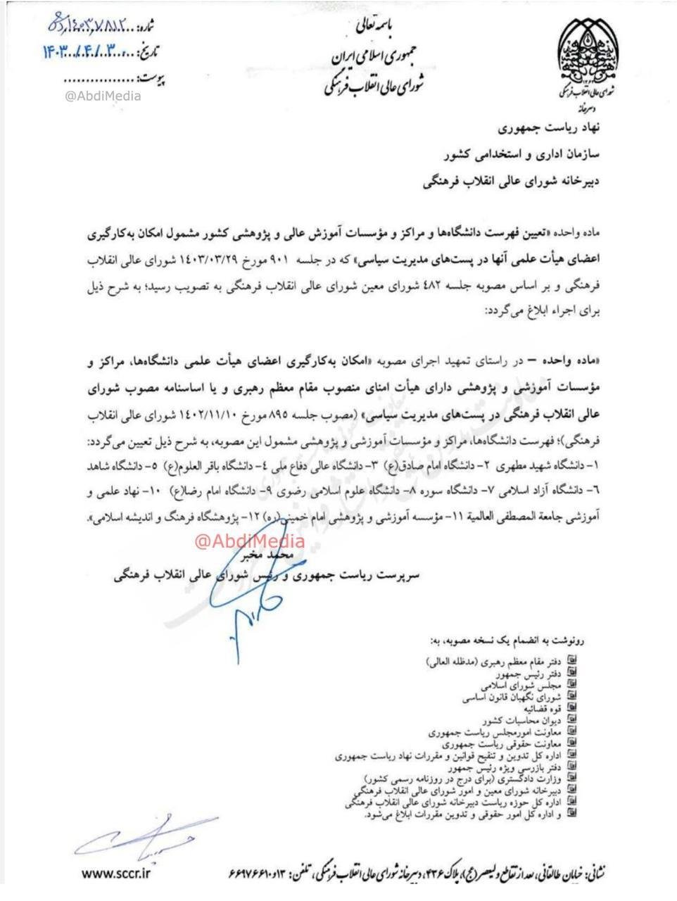 الرئيسية/سياسة/السياسة الداخليةأول قطة علنية وقانونية قُتلت في بداية مسعود بزشكيان.يقرأدقيقة واحدة -الأربعاء 2024/10/23 - 14:56كود الأخبار:6186يشارك ابحث عن العناصر الأخرى بين الأخبار، مثل مقابلة مع نائب قائد فراجا لخطة نور.يستمر تبليغ قرارات المجلس الأعلى للثورة الثقافية، التي تعتبر قانونًا بموافقة آية الله خامنئي، ولا يستطيع البرلمان أو السلطة القضائية معارضتها أو تشويهها، في هذه الأيام التي تسبق رئاسة مسعود بزشكيان لهذا المجلس، بواسطة محمد مخبر رئيس هذا المجلس.قرار مهم جدًا للمجلس الأعلى للثورة الثقافية لتقسيم أعضاء هيئة التدريس في الجامعات الخاصة وغير الخاصة الذين يمكنهم فقط أن يكونوا مديري البلاد السياسيين.هذا القرار يحد بشكل كبير من صلاحيات مسعود بزشكيان والرؤساء القادمين، وإذا لم يلتزم أي رئيس بهذا القرار وأصدر حكمًا مخالفًا له، فإن الهيئة العامة لديوان العدالة الإدارية ستقوم بإبطاله.تشمل هذه الجامعات:1- جامعة الشهيد مطهري2- جامعة الإمام صادق3- جامعة الدفاع الوطني العليا4- جامعة باقر العلوم5- جامعة شاهد6- الجامعة الحرة الإسلامية7- جامعة السورة8- جامعة العلوم الإسلامية الرضوية9- جامعة الإمام رضا10- المؤسسة العلمية والتعليمية لجمعية المصطفى العالمية11- معهد الإمام الخميني للتعليم والبحوث12- معهد البحوث للثقافة والفكر الإسلامي Take less than a minute, register and share your opinion under this post.Insulting or inciting messages will be deleted.اشتراكالقادم بعد ذلك وأخيرا دعم النائب الأول لرئيس الجمهورية لوزير الشؤون الاقتصادية والماليةخواندن 0 كيهان: في عنبر النساء في سجن إيفين، سجينات سياسيات بحوزتهم مشروبات كحولية مصنوعة يدوياخواندن دقيقة واحدة اهتمام مجلس صيانة الدستور بالغموض في موقفه بشأن قانون الحجاب والعفافخواندن دقيقة واحدة دكتور عليرضا رييسي، معاون الصحة في وزارة الصحة، في خطوة مشكورة، طلب في رسالة إلى الدكتور ظفرقندي إعفاءً ضريبيًا لجميع العاملين في القطاع الصحي، مثل الاقتراح المطروح للممرضاتخواندن 0 المتحدث باسم الحكومة: تم تعيين محمدصادق معتمديان كحاكم لطهران وأكبر بهنامجو كحاكم لقُم من قبل مجلس الوزراء.خواندن 0الأكثر قراءةذكريات أكبر هاشمي رفسنجاني _ 1 اسفند 1378 ولقاء هو بعبدالله جاسبي وقلقه على نتائج الانتخاباتفیلم/أين العمید مرتضى طلاي؟مذكرات أكبر الهاشمي ــ 19 شهريفر 1378ـ استمرت المفاوضات السياسية بين الرجلين مع واز الطبسي حتى اصطحبه إلى طهران، وفي النهاية قرر الهاشمي على ما يبدو أن يخوض انتخابات البرلمان السادس بجدية من هنا.تشير سجلات المجلس الإسلامي الحديثة إلى أن البرلمان ليس رئيس الشؤون ولا يمكنه التدخل أو الموافقة على صلاحيات القائد العام للقوات المسلحة على أي مستوى ناهيك عن الإشراف عليها.ماذا سيحدث لمستقبل إيران مع المرشحين المعلنين للانتخابات الرئاسية؟ / حوار مع الدكتور تقي آزاد ارامكيهل يمكن الشعور بالتعب معك؟تعيين طبيب بيطري من قوا الباسيج رئيساً للشبكة الصحية بدلاً من جراح الأذن والأنف والحنجرة!مذكرات أكبر هاشمي ــ 14 سبتمبر 1378 ــ استمرت لقاءات كبار مديري الجهاز القضائي مع هاشمي رفسنجاني وشكواهم من إهمال رئيس القضاء الجديد هاشمي الشاهرودي.مذكرات أكبر الهاشمي -16 شهريور 1378- التقى الهاشمي مرة أخرى هذه المرة بعد أن التقى الراحل واز الطبسي بجهود عدة لتشجيع الهاشمي على المشاركة في الانتخابات.مذكرات اكبر الهاشمي-18 شهريفر 1378-استمرار جولة الممتلكات والمباني والأعمال في أستان المقدس