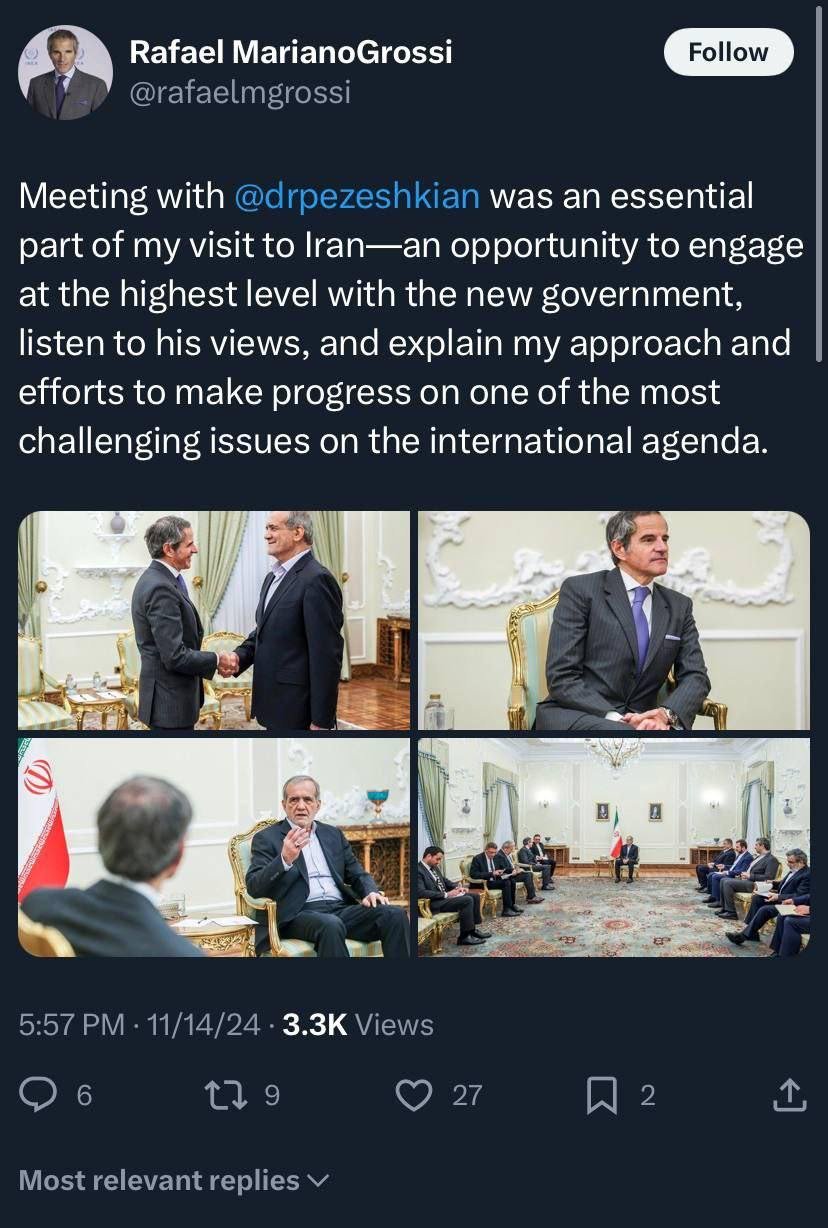 الرئيسية/سياسةغروسي: في لقاء مع بيزيشکيان، شرحت جهودي في الملف النووي الإيرانييقرأدقيقة واحدة -الجمعة 2024/11/15 - 01:28كود الأخبار:8413يشارك في هذا الاجتماع، أتيحت لي الفرصة للقاء أعلى مستوى في الحكومة الإيرانية الجديدة والاستماع إلى آرائهم.في هذا الاجتماع، أتيحت لي الفرصة للقاء أعلى مستوى في الحكومة الإيرانية الجديدة والاستماع إلى آرائهم.المدير العام للوكالة الدولية للطاقة الذرية: كان الاجتماع مع الدكتور بزشكيان جزءا مهما من زيارتي إلى إيران.اشرح نهجي وجهودي لإحراز تقدم في واحدة من أكثر القضايا تحديا على جدول الأعمال الدولي. Take less than a minute, register and share your opinion under this post.Insulting or inciting messages will be deleted.اشتراكالقادم بعد ذلك بور محمدي: نحن متهورون في حماية المعلومات.خواندن دقيقة واحدة تاج زاده في مقابلة مع مجلة لوبوئن: يمكن للشعب أن ينهي حكم رجال الدين في إيران.خواندن %count دقائق بعد شكوى حميد رسايي واستفسار (طلب معلومات/توضيح) المدعي العام من محكمة رجال الدين الخاصة ومجلس صيانة الدستور.خواندن دقيقة واحدة تحياتي للسيد محسني إژيه، رئيس السلطة القضائية، والسيد مرتضوي، مساعد الإشراف والتفتيش في المحكمة العليا، والسيد دهقاني، رئيس القضاء في محافظة خوزستان.خواندن دقيقة واحدة كل تعليقاتنا وتغريداتنا في هذا الفضاء ستبقى إرثاً حتى لو حذفناها، وفي المستقبل سيُحاكموننا (أو سيحكمون علينا) بقسوة بسببها جميعاً.خواندن دقيقة واحدةالأكثر قراءةذكريات أكبر هاشمي رفسنجاني _ 1 اسفند 1378 ولقاء هو بعبدالله جاسبي وقلقه على نتائج الانتخاباتفیلم/أين العمید مرتضى طلاي؟مذكرات أكبر الهاشمي ــ 19 شهريفر 1378ـ استمرت المفاوضات السياسية بين الرجلين مع واز الطبسي حتى اصطحبه إلى طهران، وفي النهاية قرر الهاشمي على ما يبدو أن يخوض انتخابات البرلمان السادس بجدية من هنا.تشير سجلات المجلس الإسلامي الحديثة إلى أن البرلمان ليس رئيس الشؤون ولا يمكنه التدخل أو الموافقة على صلاحيات القائد العام للقوات المسلحة على أي مستوى ناهيك عن الإشراف عليها.ماذا سيحدث لمستقبل إيران مع المرشحين المعلنين للانتخابات الرئاسية؟ / حوار مع الدكتور تقي آزاد ارامكيهل يمكن الشعور بالتعب معك؟تعيين طبيب بيطري من قوا الباسيج رئيساً للشبكة الصحية بدلاً من جراح الأذن والأنف والحنجرة!مذكرات أكبر هاشمي ــ 14 سبتمبر 1378 ــ استمرت لقاءات كبار مديري الجهاز القضائي مع هاشمي رفسنجاني وشكواهم من إهمال رئيس القضاء الجديد هاشمي الشاهرودي.مذكرات أكبر الهاشمي -16 شهريور 1378- التقى الهاشمي مرة أخرى هذه المرة بعد أن التقى الراحل واز الطبسي بجهود عدة لتشجيع الهاشمي على المشاركة في الانتخابات.مذكرات اكبر الهاشمي-18 شهريفر 1378-استمرار جولة الممتلكات والمباني والأعمال في أستان المقدس