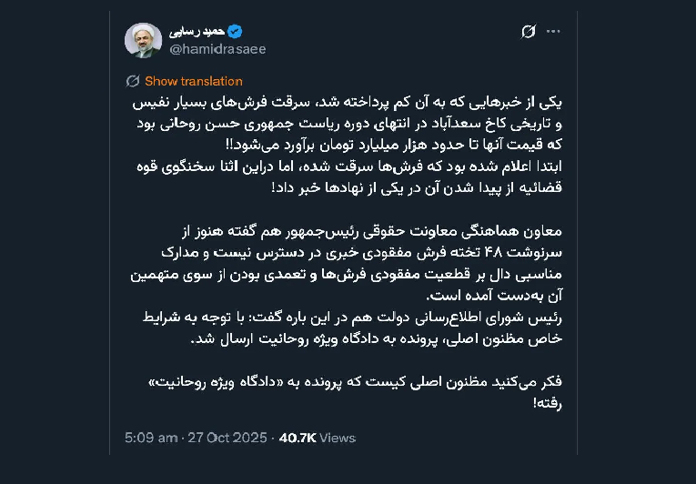 الرئيسية/سياسةحضرة عضو المجلس الإسلامي المحترم، أرجو أن تخبرني أولاً هل هي المحكمة الخاصة برجال الدين أم المحكمة الخاصة برجال الدين؟يقرأدقيقة واحدة -الاثنين 2025/10/27 - 22:39كود الأخبار:23272يشارك ثم هل صدرت لائحة اتهام أو أمر جنائي بالذهاب إلى المحكمة؟أولاً، أخبرني المحكمة الخاصة برجال الدين أم المحكمة الخاصة برجال الدين؟ثم هل صدرت لائحة اتهام أو أمر جنائي بالذهاب إلى المحكمة؟وبعد ذلك، ودون ذكر التفاصيل، لا يختلف المتهم عن المتهم؟وفي النهاية أرجو أن تخبرونا بنتيجة هذه القضية في محكمة رجال الدين الخاصة، فالموضوع سيكون واضحاً تماماً.یکی از خبرهایی که به آن کم پرداخته شد، سرقت فرشهای بسیار نفیس و تاریخی کاخ سعدآباد در انتهای دوره ریاست جمهوری حسن روحانی بود که قیمت آنها تا حدود هزار میلیارد تومان برآورد میشود!!ابتدا اعلام شده بود که فرشها سرقت شده، اما دراین اثنا سخنگوی قوه قضائیه از پیدا شدن آن در یکی از…— حمید رسایی (@hamidrasaee) October 27, 2025⭕️آقای نماینده محترم مجلس شورای اسلامیدرود💢ابتدا بفرمایید دادسرای ویژه روحانیت یا دادگاه ویژه روحانیت؟📌سپس مگر کیفرخواست یا قرار مجرمیتی صادر شده که برود دادگاه؟📌 بعد اینکه بدون اشاره به جزییات آن، #مظنون با #متهم فرق ندارد؟📌 ودر آخر لطفا نتیجه همین پرونده در دادسرای…— AbdiMedia - Abdollah Abdi (@abdolah_abdi) October 27, 2025 Take less than a minute, register and share your opinion under this post.Insulting or inciting messages will be deleted.اشتراكالقادم بعد ذلك بور محمدي: نحن متهورون في حماية المعلومات.خواندن دقيقة واحدة تاج زاده في مقابلة مع مجلة لوبوئن: يمكن للشعب أن ينهي حكم رجال الدين في إيران.خواندن %count دقائق بعد شكوى حميد رسايي واستفسار (طلب معلومات/توضيح) المدعي العام من محكمة رجال الدين الخاصة ومجلس صيانة الدستور.خواندن دقيقة واحدة تحياتي للسيد محسني إژيه، رئيس السلطة القضائية، والسيد مرتضوي، مساعد الإشراف والتفتيش في المحكمة العليا، والسيد دهقاني، رئيس القضاء في محافظة خوزستان.خواندن دقيقة واحدة كل تعليقاتنا وتغريداتنا في هذا الفضاء ستبقى إرثاً حتى لو حذفناها، وفي المستقبل سيُحاكموننا (أو سيحكمون علينا) بقسوة بسببها جميعاً.خواندن دقيقة واحدةالأكثر قراءةذكريات أكبر هاشمي رفسنجاني _ 1 اسفند 1378 ولقاء هو بعبدالله جاسبي وقلقه على نتائج الانتخاباتفیلم/أين العمید مرتضى طلاي؟مذكرات أكبر الهاشمي ــ 19 شهريفر 1378ـ استمرت المفاوضات السياسية بين الرجلين مع واز الطبسي حتى اصطحبه إلى طهران، وفي النهاية قرر الهاشمي على ما يبدو أن يخوض انتخابات البرلمان السادس بجدية من هنا.تشير سجلات المجلس الإسلامي الحديثة إلى أن البرلمان ليس رئيس الشؤون ولا يمكنه التدخل أو الموافقة على صلاحيات القائد العام للقوات المسلحة على أي مستوى ناهيك عن الإشراف عليها.ماذا سيحدث لمستقبل إيران مع المرشحين المعلنين للانتخابات الرئاسية؟ / حوار مع الدكتور تقي آزاد ارامكيهل يمكن الشعور بالتعب معك؟تعيين طبيب بيطري من قوا الباسيج رئيساً للشبكة الصحية بدلاً من جراح الأذن والأنف والحنجرة!مذكرات أكبر هاشمي ــ 14 سبتمبر 1378 ــ استمرت لقاءات كبار مديري الجهاز القضائي مع هاشمي رفسنجاني وشكواهم من إهمال رئيس القضاء الجديد هاشمي الشاهرودي.مذكرات أكبر الهاشمي -16 شهريور 1378- التقى الهاشمي مرة أخرى هذه المرة بعد أن التقى الراحل واز الطبسي بجهود عدة لتشجيع الهاشمي على المشاركة في الانتخابات.مذكرات اكبر الهاشمي-18 شهريفر 1378-استمرار جولة الممتلكات والمباني والأعمال في أستان المقدس