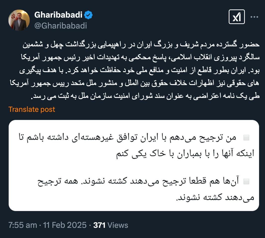 الرئيسية/سياسةتسجيل رسالة احتجاجية إيرانية عقب تصريحات ترامب المخالفة للقانون الدولييقرأدقيقة واحدة -الثلاثاء 2025/02/11 - 13:08كود الأخبار:13293يشارك ردا على تصريحات دونالد ترامب الأخيرة، التي تتعارض مع القانون الدولي وميثاق الأمم المتحدة، سجلت إيران خطاب احتجاجها كوثيقة في مجلس الأمن الدولي.صرح نائب وزير الخارجية للشؤون القانونية والدولية بأن إيران ستدافع بحزم عن أمنها ومصالحها الوطنية.وفي إطار المتابعة القانونية، تم تقديم تصريحات رئيس الولايات المتحدة المخالفة للقانون الدولي وميثاق الأمم المتحدة في رسالة احتجاجية تم تسجيلها رسميًا كوثيقة لدى مجلس الأمن التابع للأمم المتحدة. Take less than a minute, register and share your opinion under this post.Insulting or inciting messages will be deleted.اشتراكالقادم بعد ذلك بور محمدي: نحن متهورون في حماية المعلومات.خواندن دقيقة واحدة تاج زاده في مقابلة مع مجلة لوبوئن: يمكن للشعب أن ينهي حكم رجال الدين في إيران.خواندن %count دقائق بعد شكوى حميد رسايي واستفسار (طلب معلومات/توضيح) المدعي العام من محكمة رجال الدين الخاصة ومجلس صيانة الدستور.خواندن دقيقة واحدة تحياتي للسيد محسني إژيه، رئيس السلطة القضائية، والسيد مرتضوي، مساعد الإشراف والتفتيش في المحكمة العليا، والسيد دهقاني، رئيس القضاء في محافظة خوزستان.خواندن دقيقة واحدة كل تعليقاتنا وتغريداتنا في هذا الفضاء ستبقى إرثاً حتى لو حذفناها، وفي المستقبل سيُحاكموننا (أو سيحكمون علينا) بقسوة بسببها جميعاً.خواندن دقيقة واحدةالأكثر قراءةذكريات أكبر هاشمي رفسنجاني _ 1 اسفند 1378 ولقاء هو بعبدالله جاسبي وقلقه على نتائج الانتخاباتفیلم/أين العمید مرتضى طلاي؟مذكرات أكبر الهاشمي ــ 19 شهريفر 1378ـ استمرت المفاوضات السياسية بين الرجلين مع واز الطبسي حتى اصطحبه إلى طهران، وفي النهاية قرر الهاشمي على ما يبدو أن يخوض انتخابات البرلمان السادس بجدية من هنا.تشير سجلات المجلس الإسلامي الحديثة إلى أن البرلمان ليس رئيس الشؤون ولا يمكنه التدخل أو الموافقة على صلاحيات القائد العام للقوات المسلحة على أي مستوى ناهيك عن الإشراف عليها.ماذا سيحدث لمستقبل إيران مع المرشحين المعلنين للانتخابات الرئاسية؟ / حوار مع الدكتور تقي آزاد ارامكيهل يمكن الشعور بالتعب معك؟تعيين طبيب بيطري من قوا الباسيج رئيساً للشبكة الصحية بدلاً من جراح الأذن والأنف والحنجرة!مذكرات أكبر هاشمي ــ 14 سبتمبر 1378 ــ استمرت لقاءات كبار مديري الجهاز القضائي مع هاشمي رفسنجاني وشكواهم من إهمال رئيس القضاء الجديد هاشمي الشاهرودي.مذكرات أكبر الهاشمي -16 شهريور 1378- التقى الهاشمي مرة أخرى هذه المرة بعد أن التقى الراحل واز الطبسي بجهود عدة لتشجيع الهاشمي على المشاركة في الانتخابات.مذكرات اكبر الهاشمي-18 شهريفر 1378-استمرار جولة الممتلكات والمباني والأعمال في أستان المقدس