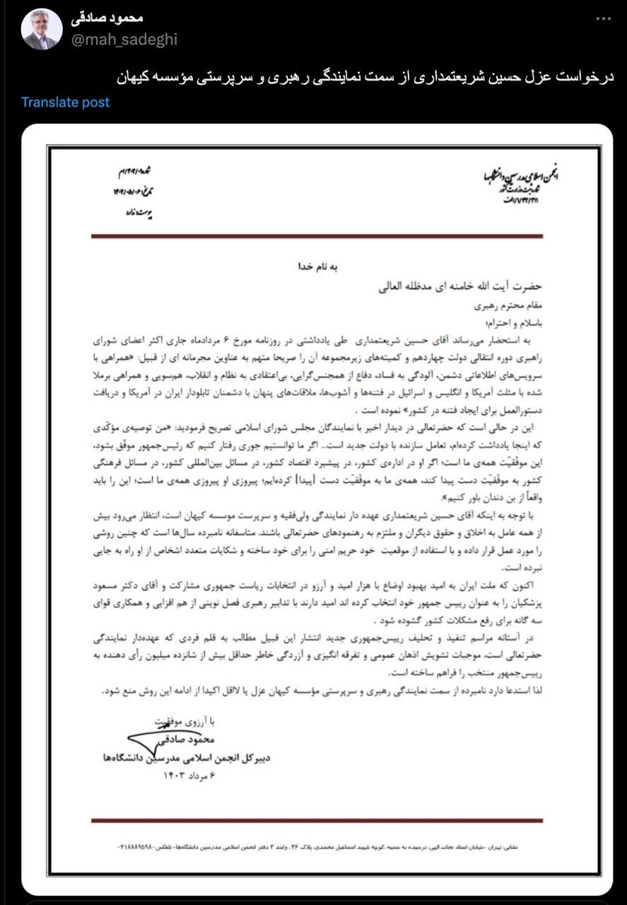 الرئيسية/سياسةمحمود صادقی، محامي العدالة و الذي يشغل أيضًا منصب أمين جمعية المدرسين الإسلاميين في الجامعات، في الساعات الأخيرة قبل تنصيب مسعود بزشکیان، وجه رسالة رسمية إلى قائد الثورة الإسلامية طالب فيها بإقالة حسين شريعتمداري من تمثيل ولي الفقيه وإدارة مؤسسة كيهانيقرأ0 -الأربعاء 2024/10/23 - 09:15كود الأخبار:6245يشارك Take less than a minute, register and share your opinion under this post.Insulting or inciting messages will be deleted.اشتراكالقادم بعد ذلك بور محمدي: نحن متهورون في حماية المعلومات.خواندن دقيقة واحدة تاج زاده في مقابلة مع مجلة لوبوئن: يمكن للشعب أن ينهي حكم رجال الدين في إيران.خواندن %count دقائق بعد شكوى حميد رسايي واستفسار (طلب معلومات/توضيح) المدعي العام من محكمة رجال الدين الخاصة ومجلس صيانة الدستور.خواندن دقيقة واحدة تحياتي للسيد محسني إژيه، رئيس السلطة القضائية، والسيد مرتضوي، مساعد الإشراف والتفتيش في المحكمة العليا، والسيد دهقاني، رئيس القضاء في محافظة خوزستان.خواندن دقيقة واحدة كل تعليقاتنا وتغريداتنا في هذا الفضاء ستبقى إرثاً حتى لو حذفناها، وفي المستقبل سيُحاكموننا (أو سيحكمون علينا) بقسوة بسببها جميعاً.خواندن دقيقة واحدةالأكثر قراءةذكريات أكبر هاشمي رفسنجاني _ 1 اسفند 1378 ولقاء هو بعبدالله جاسبي وقلقه على نتائج الانتخاباتفیلم/أين العمید مرتضى طلاي؟مذكرات أكبر الهاشمي ــ 19 شهريفر 1378ـ استمرت المفاوضات السياسية بين الرجلين مع واز الطبسي حتى اصطحبه إلى طهران، وفي النهاية قرر الهاشمي على ما يبدو أن يخوض انتخابات البرلمان السادس بجدية من هنا.تشير سجلات المجلس الإسلامي الحديثة إلى أن البرلمان ليس رئيس الشؤون ولا يمكنه التدخل أو الموافقة على صلاحيات القائد العام للقوات المسلحة على أي مستوى ناهيك عن الإشراف عليها.ماذا سيحدث لمستقبل إيران مع المرشحين المعلنين للانتخابات الرئاسية؟ / حوار مع الدكتور تقي آزاد ارامكيهل يمكن الشعور بالتعب معك؟تعيين طبيب بيطري من قوا الباسيج رئيساً للشبكة الصحية بدلاً من جراح الأذن والأنف والحنجرة!مذكرات أكبر هاشمي ــ 14 سبتمبر 1378 ــ استمرت لقاءات كبار مديري الجهاز القضائي مع هاشمي رفسنجاني وشكواهم من إهمال رئيس القضاء الجديد هاشمي الشاهرودي.مذكرات أكبر الهاشمي -16 شهريور 1378- التقى الهاشمي مرة أخرى هذه المرة بعد أن التقى الراحل واز الطبسي بجهود عدة لتشجيع الهاشمي على المشاركة في الانتخابات.مذكرات اكبر الهاشمي-18 شهريفر 1378-استمرار جولة الممتلكات والمباني والأعمال في أستان المقدس