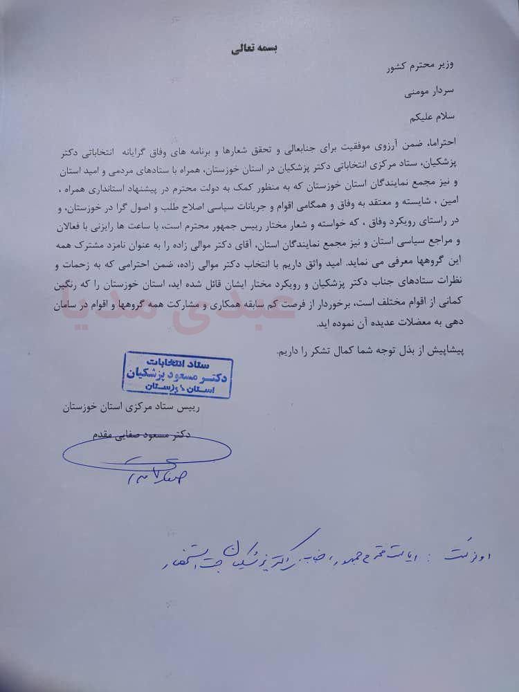 الرئيسية/سياسةمسعود صفائي مقدم، رئيس المكتب المركزي لمحافظة خوزستان، أرسل رسالة إلى إسکندر مومني، وزير الداخلية، يوصي فيها بتعيين الدكتور محمد رضا موالي زاده كأمين محافظة خوزستان، مع ذكره بلقب 'سردار'يقرأدقيقة واحدة -السبت 2024/10/19 - 18:02كود الأخبار:7308يشارك من المثير للاهتمام أن المذكور قد أرسل نسخة مكتوبة بخط اليد من هذه الرسالة إلى رئيس الجمهورية.فهل ستثمر جهودهم لتعيين سيد محمد رضا موالي زاده في منصب الأمين؟وكيف ستكون جهود مجموعة أخرى لتعيين هوشنگ بازوند كأمين أيضاً؟ Take less than a minute, register and share your opinion under this post.Insulting or inciting messages will be deleted.اشتراكالقادم بعد ذلك بور محمدي: نحن متهورون في حماية المعلومات.خواندن دقيقة واحدة تاج زاده في مقابلة مع مجلة لوبوئن: يمكن للشعب أن ينهي حكم رجال الدين في إيران.خواندن %count دقائق بعد شكوى حميد رسايي واستفسار (طلب معلومات/توضيح) المدعي العام من محكمة رجال الدين الخاصة ومجلس صيانة الدستور.خواندن دقيقة واحدة تحياتي للسيد محسني إژيه، رئيس السلطة القضائية، والسيد مرتضوي، مساعد الإشراف والتفتيش في المحكمة العليا، والسيد دهقاني، رئيس القضاء في محافظة خوزستان.خواندن دقيقة واحدة كل تعليقاتنا وتغريداتنا في هذا الفضاء ستبقى إرثاً حتى لو حذفناها، وفي المستقبل سيُحاكموننا (أو سيحكمون علينا) بقسوة بسببها جميعاً.خواندن دقيقة واحدةالأكثر قراءةذكريات أكبر هاشمي رفسنجاني _ 1 اسفند 1378 ولقاء هو بعبدالله جاسبي وقلقه على نتائج الانتخاباتفیلم/أين العمید مرتضى طلاي؟مذكرات أكبر الهاشمي ــ 19 شهريفر 1378ـ استمرت المفاوضات السياسية بين الرجلين مع واز الطبسي حتى اصطحبه إلى طهران، وفي النهاية قرر الهاشمي على ما يبدو أن يخوض انتخابات البرلمان السادس بجدية من هنا.تشير سجلات المجلس الإسلامي الحديثة إلى أن البرلمان ليس رئيس الشؤون ولا يمكنه التدخل أو الموافقة على صلاحيات القائد العام للقوات المسلحة على أي مستوى ناهيك عن الإشراف عليها.ماذا سيحدث لمستقبل إيران مع المرشحين المعلنين للانتخابات الرئاسية؟ / حوار مع الدكتور تقي آزاد ارامكيهل يمكن الشعور بالتعب معك؟تعيين طبيب بيطري من قوا الباسيج رئيساً للشبكة الصحية بدلاً من جراح الأذن والأنف والحنجرة!مذكرات أكبر هاشمي ــ 14 سبتمبر 1378 ــ استمرت لقاءات كبار مديري الجهاز القضائي مع هاشمي رفسنجاني وشكواهم من إهمال رئيس القضاء الجديد هاشمي الشاهرودي.مذكرات أكبر الهاشمي -16 شهريور 1378- التقى الهاشمي مرة أخرى هذه المرة بعد أن التقى الراحل واز الطبسي بجهود عدة لتشجيع الهاشمي على المشاركة في الانتخابات.مذكرات اكبر الهاشمي-18 شهريفر 1378-استمرار جولة الممتلكات والمباني والأعمال في أستان المقدس