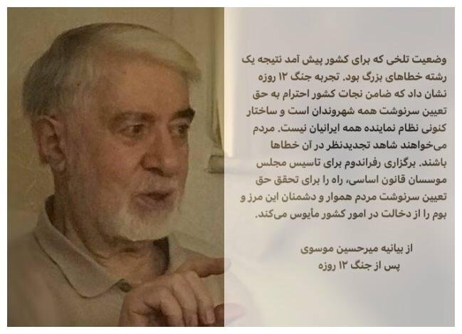 الرئيسية/سياسةبيان مير حسين موسافي الجديديقرأدقيقتان -الأربعاء 2025/07/16 - 11:19كود الأخبار:21182يشارك خلال الجرائم الأخيرة من إسرائيل والولايات المتحدة ضد وطننا المحبوب ، تم اختبار الشعب الإيراني مرة أخرىخلال الجرائم الأخيرة من إسرائيل والولايات المتحدة ضد وطننا المحبوب ، تم اختبار الشعب الإيراني مرة أخرىلا يمثل الهيكل الحالي للنظام جميع الإيرانيين الذين يحملون استفتاء لإنشاء الجمعية الدستورية الدستورية سوف يأس من التدخل في شؤون البلد لتحقيق الحق في تحديد مصير الشعب وأعداء هذه الحدود.بسم الله الرحمن الرحيمخلال الجرائم الأخيرة من إسرائيل والولايات المتحدة ضد وطننا المحبوب ، شهد الشعب الإيراني مرة أخرى وزيادة امتياز سجلها التاريخي ؛ وهذا لم يكن فقط بسبب تضامنهم مع العدو ، ولكن بسبب مقاومته في عيوب عميقة. في حين أن الأطفال العسكريين في الأمة الشهيد قد فوجئوا أو فوجئوا ، فإن البصر الجدير بالثناء للشعب فشل في الخطط الشريرة للغزاة. الآن ، بعد تلك الأيام ، سيكون من الرهيب إذا كان أولئك الذين يحلمون بتأكيد أو التعبير عن رد فعل المجتمع لتأكيد أو إظهار حوكمةهم غير الفعالة. مثل هذا الخطأ سوف يثبط الأمة ويأمل أن يتمكن في المرة القادمة من إيجاد إلهة في المقطع الذي أخفقه.الناس بعد ما مرت لديهم توقعات من الحكومة التي تجعل العدو سعيدا. على المدى القصير ، فإن التدابير السريعة والرمزية مثل الإفراج عن السجناء السياسيين وتغيير واضح في مناهج وسائل الإعلام الوطنية هي أقل التوقعات. بالإضافة إلى ذلك ، كان الوضع المرير للبلاد نتيجة لسلسلة من الأخطاء الرئيسية. أظهرت تجربة حرب الاثني عشر يومًا أن إنقاذ البلاد هو احترام حق جميع المواطنين ، وأن الهيكل الحالي للنظام لا يمثل جميع الإيرانيين. يريد الناس رؤية مراجعة تلك الأخطاء. عقد استفتاء لإثبات الجمعية الدستورية الدستورية التي تأسس الطريق لتحقيق الحق في تحديد مصير الناس وأعداء هذه الحدود وسيتداخل اللوحة في شؤون البلاد."في أيام أيام روح الروح ، الفتا آل ، والهجوم". في الواقع ، في أيام الوقت ، هناك نسيان من ربك ، هان ، الذي عثرت عليه ولم ينظر إليهم.أثناء إدانة العدوان الأخير ضد بلدنا ، أقدم تعازي إلى العائلات الحزينة والمتأثرة ، وأتمنى لشهداء هذه السنوات من الرحمة.مير حسين موسافي1 يوليو 2025 Take less than a minute, register and share your opinion under this post.Insulting or inciting messages will be deleted.اشتراكالقادم بعد ذلك بور محمدي: نحن متهورون في حماية المعلومات.خواندن دقيقة واحدة تاج زاده في مقابلة مع مجلة لوبوئن: يمكن للشعب أن ينهي حكم رجال الدين في إيران.خواندن %count دقائق بعد شكوى حميد رسايي واستفسار (طلب معلومات/توضيح) المدعي العام من محكمة رجال الدين الخاصة ومجلس صيانة الدستور.خواندن دقيقة واحدة تحياتي للسيد محسني إژيه، رئيس السلطة القضائية، والسيد مرتضوي، مساعد الإشراف والتفتيش في المحكمة العليا، والسيد دهقاني، رئيس القضاء في محافظة خوزستان.خواندن دقيقة واحدة كل تعليقاتنا وتغريداتنا في هذا الفضاء ستبقى إرثاً حتى لو حذفناها، وفي المستقبل سيُحاكموننا (أو سيحكمون علينا) بقسوة بسببها جميعاً.خواندن دقيقة واحدةالأكثر قراءةذكريات أكبر هاشمي رفسنجاني _ 1 اسفند 1378 ولقاء هو بعبدالله جاسبي وقلقه على نتائج الانتخاباتفیلم/أين العمید مرتضى طلاي؟مذكرات أكبر الهاشمي ــ 19 شهريفر 1378ـ استمرت المفاوضات السياسية بين الرجلين مع واز الطبسي حتى اصطحبه إلى طهران، وفي النهاية قرر الهاشمي على ما يبدو أن يخوض انتخابات البرلمان السادس بجدية من هنا.تشير سجلات المجلس الإسلامي الحديثة إلى أن البرلمان ليس رئيس الشؤون ولا يمكنه التدخل أو الموافقة على صلاحيات القائد العام للقوات المسلحة على أي مستوى ناهيك عن الإشراف عليها.ماذا سيحدث لمستقبل إيران مع المرشحين المعلنين للانتخابات الرئاسية؟ / حوار مع الدكتور تقي آزاد ارامكيهل يمكن الشعور بالتعب معك؟تعيين طبيب بيطري من قوا الباسيج رئيساً للشبكة الصحي