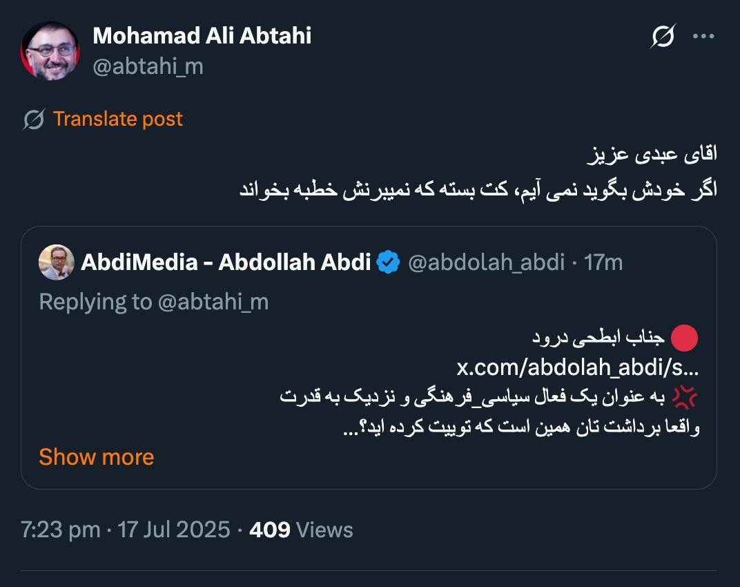 الرئيسية/سياسةهل أنت متأكد من عدم عرضه؟يقرأدقيقة واحدة -الخميس 2025/07/17 - 23:03كود الأخبار:21479يشارك اقای عبدی عزیزاگر خودش بگوید نمی آیم، کت بسته که نمیبرنش خطبه بخواند https://t.co/3HmbDd1nMh— Mohamad Ali Abtahi (@abtahi_m) July 17, 2025🔴 درود دوباره💢 مطمئن هستید پیشنهاد نداده؟— AbdiMedia - Abdollah Abdi (@abdolah_abdi) July 17, 2025اخبار ذات صله عزيزي أبطاهي ، كناشط سياسي للثقافة وقريبة من السلطة ، هل هي حقا تغريدة؟ بسيطة؟ Take less than a minute, register and share your opinion under this post.Insulting or inciting messages will be deleted.اشتراكالقادم بعد ذلك بور محمدي: نحن متهورون في حماية المعلومات.خواندن دقيقة واحدة تاج زاده في مقابلة مع مجلة لوبوئن: يمكن للشعب أن ينهي حكم رجال الدين في إيران.خواندن %count دقائق بعد شكوى حميد رسايي واستفسار (طلب معلومات/توضيح) المدعي العام من محكمة رجال الدين الخاصة ومجلس صيانة الدستور.خواندن دقيقة واحدة تحياتي للسيد محسني إژيه، رئيس السلطة القضائية، والسيد مرتضوي، مساعد الإشراف والتفتيش في المحكمة العليا، والسيد دهقاني، رئيس القضاء في محافظة خوزستان.خواندن دقيقة واحدة كل تعليقاتنا وتغريداتنا في هذا الفضاء ستبقى إرثاً حتى لو حذفناها، وفي المستقبل سيُحاكموننا (أو سيحكمون علينا) بقسوة بسببها جميعاً.خواندن دقيقة واحدةالأكثر قراءةذكريات أكبر هاشمي رفسنجاني _ 1 اسفند 1378 ولقاء هو بعبدالله جاسبي وقلقه على نتائج الانتخاباتفیلم/أين العمید مرتضى طلاي؟مذكرات أكبر الهاشمي ــ 19 شهريفر 1378ـ استمرت المفاوضات السياسية بين الرجلين مع واز الطبسي حتى اصطحبه إلى طهران، وفي النهاية قرر الهاشمي على ما يبدو أن يخوض انتخابات البرلمان السادس بجدية من هنا.تشير سجلات المجلس الإسلامي الحديثة إلى أن البرلمان ليس رئيس الشؤون ولا يمكنه التدخل أو الموافقة على صلاحيات القائد العام للقوات المسلحة على أي مستوى ناهيك عن الإشراف عليها.ماذا سيحدث لمستقبل إيران مع المرشحين المعلنين للانتخابات الرئاسية؟ / حوار مع الدكتور تقي آزاد ارامكيهل يمكن الشعور بالتعب معك؟تعيين طبيب بيطري من قوا الباسيج رئيساً للشبكة الصحية بدلاً من جراح الأذن والأنف والحنجرة!مذكرات أكبر هاشمي ــ 14 سبتمبر 1378 ــ استمرت لقاءات كبار مديري الجهاز القضائي مع هاشمي رفسنجاني وشكواهم من إهمال رئيس القضاء الجديد هاشمي الشاهرودي.مذكرات أكبر الهاشمي -16 شهريور 1378- التقى الهاشمي مرة أخرى هذه المرة بعد أن التقى الراحل واز الطبسي بجهود عدة لتشجيع الهاشمي على المشاركة في الانتخابات.مذكرات اكبر الهاشمي-18 شهريفر 1378-استمرار جولة الممتلكات والمباني والأعمال في أستان المقدس