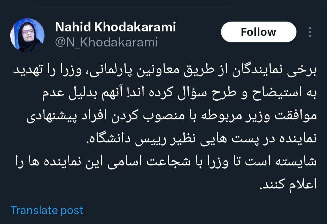 الرئيسية/سياسةناهد خداكرامي، عضو لجنة الاختيار التابعة لوزير الصحة ورئيس جمعية القبالة: لكي يوافق الوزير على تعيين أشخاص مقترحين، بمن فيهم رئيس الجامعة، يهدد النواب الوزراء بالعزل ويطرحون الأسئلة!يقرأ0 -الخميس 2024/10/31 - 10:56كود الأخبار:7777يشارك Take less than a minute, register and share your opinion under this post.Insulting or inciting messages will be deleted.اشتراكالقادم بعد ذلك بور محمدي: نحن متهورون في حماية المعلومات.خواندن دقيقة واحدة تاج زاده في مقابلة مع مجلة لوبوئن: يمكن للشعب أن ينهي حكم رجال الدين في إيران.خواندن %count دقائق بعد شكوى حميد رسايي واستفسار (طلب معلومات/توضيح) المدعي العام من محكمة رجال الدين الخاصة ومجلس صيانة الدستور.خواندن دقيقة واحدة تحياتي للسيد محسني إژيه، رئيس السلطة القضائية، والسيد مرتضوي، مساعد الإشراف والتفتيش في المحكمة العليا، والسيد دهقاني، رئيس القضاء في محافظة خوزستان.خواندن دقيقة واحدة كل تعليقاتنا وتغريداتنا في هذا الفضاء ستبقى إرثاً حتى لو حذفناها، وفي المستقبل سيُحاكموننا (أو سيحكمون علينا) بقسوة بسببها جميعاً.خواندن دقيقة واحدةالأكثر قراءةذكريات أكبر هاشمي رفسنجاني _ 1 اسفند 1378 ولقاء هو بعبدالله جاسبي وقلقه على نتائج الانتخاباتفیلم/أين العمید مرتضى طلاي؟مذكرات أكبر الهاشمي ــ 19 شهريفر 1378ـ استمرت المفاوضات السياسية بين الرجلين مع واز الطبسي حتى اصطحبه إلى طهران، وفي النهاية قرر الهاشمي على ما يبدو أن يخوض انتخابات البرلمان السادس بجدية من هنا.تشير سجلات المجلس الإسلامي الحديثة إلى أن البرلمان ليس رئيس الشؤون ولا يمكنه التدخل أو الموافقة على صلاحيات القائد العام للقوات المسلحة على أي مستوى ناهيك عن الإشراف عليها.ماذا سيحدث لمستقبل إيران مع المرشحين المعلنين للانتخابات الرئاسية؟ / حوار مع الدكتور تقي آزاد ارامكيهل يمكن الشعور بالتعب معك؟تعيين طبيب بيطري من قوا الباسيج رئيساً للشبكة الصحية بدلاً من جراح الأذن والأنف والحنجرة!مذكرات أكبر هاشمي ــ 14 سبتمبر 1378 ــ استمرت لقاءات كبار مديري الجهاز القضائي مع هاشمي رفسنجاني وشكواهم من إهمال رئيس القضاء الجديد هاشمي الشاهرودي.مذكرات أكبر الهاشمي -16 شهريور 1378- التقى الهاشمي مرة أخرى هذه المرة بعد أن التقى الراحل واز الطبسي بجهود عدة لتشجيع الهاشمي على المشاركة في الانتخابات.مذكرات اكبر الهاشمي-18 شهريفر 1378-استمرار جولة الممتلكات والمباني والأعمال في أستان المقدس