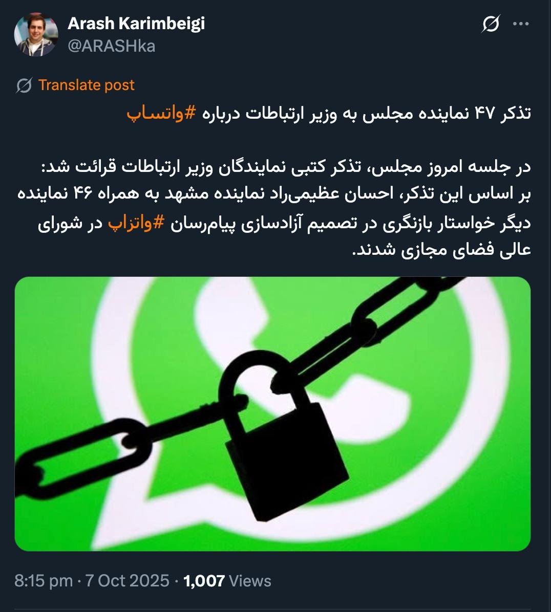 الرئيسية/سياسة/البرلمانما علاقة وزير الاتصالات بالمجلس الأعلى للفضاء الإلكتروني؟ لماذا لم يُنذر رئيس المجلس؟يقرأدقيقة واحدة -الأربعاء 2025/10/08 - 13:42كود الأخبار:22992يشارك تذکر ۴۷ نماینده مجلس به وزیر ارتباطات درباره #واتساپدر جلسه امروز مجلس، تذکر کتبی نمایندگان وزیر ارتباطات قرائت شد:بر اساس این تذکر، احسان عظیمیراد نماینده مشهد به همراه ۴۶ نماینده دیگر خواستار بازنگری در تصمیم آزادسازی پیامرسان #واتزاپ در شورای عالی فضای مجازی شدند. pic.twitter.com/Vk45Fhoezd— Arash Karimbeigi (@ARASHka) October 7, 2025🔴 درودوزیر ارتباطات چه ارتباطی با شورای عالی فضای مجازی دارد؟🔸چرا به رییس شورا تذکر ندادند؟#سیاست_عجیب_بیرحم_است— AbdiMedia - Abdollah Abdi (@abdolah_abdi) October 7, 2025الصورة هل يستطيع شيوخ ووجهاء المجلس الأعلى تحذير الرئيس؟أم أنه صعب؟ 🔴 بزرگان و اکابر مجلس معظم مگر نمیتوانند به رییس جمهور تذکر دهند؟یا سخت است؟— AbdiMedia - Abdollah Abdi (@abdolah_abdi) October 7, 2025نمیدانم.— Arash Karimbeigi (@ARASHka) October 8, 2025 Take less than a minute, register and share your opinion under this post.Insulting or inciting messages will be deleted.اشتراكالقادم بعد ذلك أنتم أنفسكم بالتأكيد تدركون جيداً أن هذه تبريرات ناتجة عن إشارات (أو تلميحات)، حتى لو تم نفيها.خواندن دقيقة واحدة السيد رئيس مجلس الشورى الإسلامي، تحياتي. بغض النظر عن تفاصيل هذه القضية، هل يجوز للمدعي العام، وفقًا للدستور، التدخل في رأي نائب من خلال منبر المجلس؟خواندن دقيقة واحدة اقتراح نائب سابق في البرلمان: أعلنوا أسماء مؤيدي التصفيةخواندن دقيقتان أرادوا إعادة بنك اینده سراً إلى المساهم المتخلف عن السداد من خلال الموافقة عليه في إحدى لجان البرلمان / رسالة النواب أوقفوا هذه العمليةخواندن دقيقة واحدة لماذا يصرخ بعض أعضاء البرلمان بهذه الطريقة في القاعة؟خواندن دقيقة واحدةالأكثر قراءةذكريات أكبر هاشمي رفسنجاني _ 1 اسفند 1378 ولقاء هو بعبدالله جاسبي وقلقه على نتائج الانتخاباتفیلم/أين العمید مرتضى طلاي؟مذكرات أكبر الهاشمي ــ 19 شهريفر 1378ـ استمرت المفاوضات السياسية بين الرجلين مع واز الطبسي حتى اصطحبه إلى طهران، وفي النهاية قرر الهاشمي على ما يبدو أن يخوض انتخابات البرلمان السادس بجدية من هنا.تشير سجلات المجلس الإسلامي الحديثة إلى أن البرلمان ليس رئيس الشؤون ولا يمكنه التدخل أو الموافقة على صلاحيات القائد العام للقوات المسلحة على أي مستوى ناهيك عن الإشراف عليها.ماذا سيحدث لمستقبل إيران مع المرشحين المعلنين للانتخابات الرئاسية؟ / حوار مع الدكتور تقي آزاد ارامكيهل يمكن الشعور بالتعب معك؟تعيين طبيب بيطري من قوا الباسيج رئيساً للشبكة الصحية بدلاً من جراح الأذن والأنف والحنجرة!مذكرات أكبر هاشمي ــ 14 سبتمبر 1378 ــ استمرت لقاءات كبار مديري الجهاز القضائي مع هاشمي رفسنجاني وشكواهم من إهمال رئيس القضاء الجديد هاشمي الشاهرودي.مذكرات أكبر الهاشمي -16 شهريور 1378- التقى الهاشمي مرة أخرى هذه المرة بعد أن التقى الراحل واز الطبسي بجهود عدة لتشجيع الهاشمي على المشاركة في الانتخابات.مذكرات اكبر الهاشمي-18 شهريفر 1378-استمرار جولة الممتلكات والمباني والأعمال في أستان المقدس