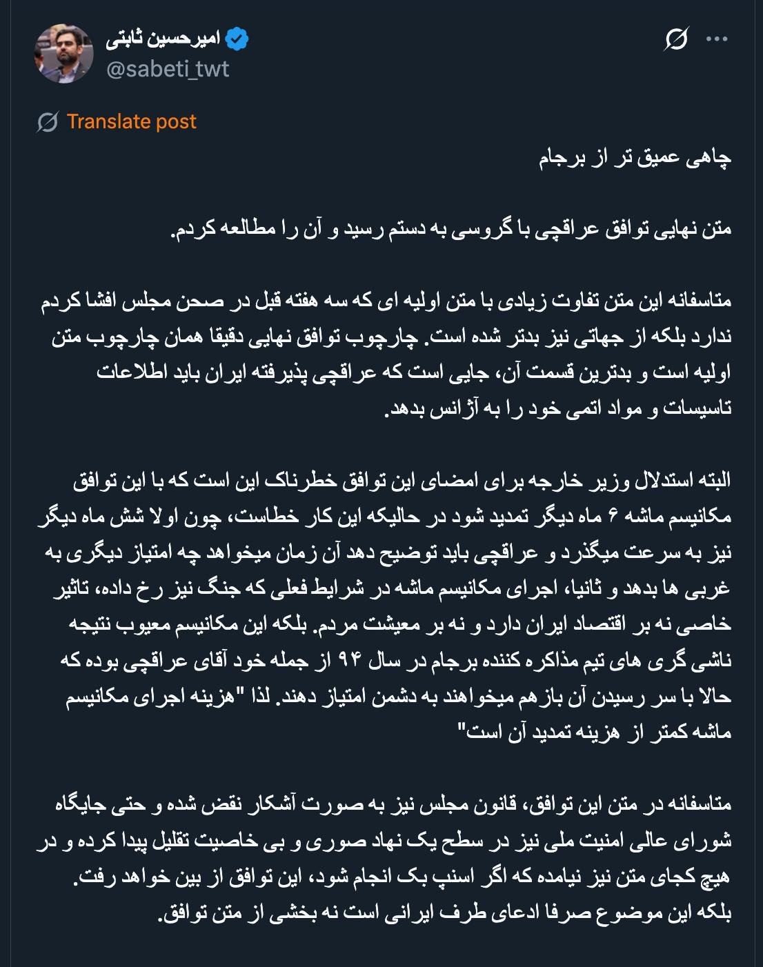 الرئيسية/سياسةتحياتي، السيد عضو مجلس الشورى الإسلامي. لنفترض أن اتفاقًا استراتيجيًا وهامًا كهذا لم يُبرم إطلاقًا بتنسيق وموافقة آية الله خامنئي.يقرأدقيقة واحدة -الخميس 2025/09/18 - 11:21كود الأخبار:22642يشارك يمكننا أن نفترض أن هذا ممكن وليس مستحيلا، ولكن في هذه الحالة يبرز سؤال مهم للغاية.الصورة لنفترض أن مثل هذا الاتفاق الاستراتيجي والهام لم يتم إطلاقا بالتنسيق والموافقة من قبل آية الله خامنئي.الافتراض الذي يمكننا أن نتوصل إليه ليس مستحيلا.ولكن في هذه الحالة يطرح سؤال مهم جدًا جدًا:كيف يمكن أن نتصور أن آية الله الذي يعطي رأيه في كثير من تفاصيل الأمور، سيلتزم الصمت في مجال السياسة الخارجية وعلى هذا المستوى الكلي ويسمح بعقد مثل هذا الاتفاق مع روايتك؟چاهی عمیق تر از برجاممتن نهایی توافق عراقچی با گروسی به دستم رسید و آن را مطالعه کردم.متاسفانه این متن تفاوت زیادی با متن اولیه ای که سه هفته قبل در صحن مجلس افشا کردم ندارد بلکه از جهاتی نیز بدتر شده است. چارچوب توافق نهایی دقیقا همان چارچوب متن اولیه است و بدترین قسمت آن،…— امیرحسین ثابتی (@sabeti_twt) September 17, 2025🔴 آقای نماینده مجلس شورای اسلامی؛ درود@Khamenei_fa @SCFRonline @araghchi @alilarijani_ir @alishamkhani_ir 💢فرض کنیم که چنین توافق بسیار استراتژیک و مهمی اصلا با هماهنگی و تصویب آیتالله خامنهای صورت نگرفته است.📌 فرض را که می توانیم داشته باشیم و محال نیستاما در این صورت…— AbdiMedia - Abdollah Abdi (@abdolah_abdi) September 18, 2025 Take less than a minute, register and share your opinion under this post.Insulting or inciting messages will be deleted.اشتراكالقادم بعد ذلك بور محمدي: نحن متهورون في حماية المعلومات.خواندن دقيقة واحدة تاج زاده في مقابلة مع مجلة لوبوئن: يمكن للشعب أن ينهي حكم رجال الدين في إيران.خواندن %count دقائق بعد شكوى حميد رسايي واستفسار (طلب معلومات/توضيح) المدعي العام من محكمة رجال الدين الخاصة ومجلس صيانة الدستور.خواندن دقيقة واحدة تحياتي للسيد محسني إژيه، رئيس السلطة القضائية، والسيد مرتضوي، مساعد الإشراف والتفتيش في المحكمة العليا، والسيد دهقاني، رئيس القضاء في محافظة خوزستان.خواندن دقيقة واحدة كل تعليقاتنا وتغريداتنا في هذا الفضاء ستبقى إرثاً حتى لو حذفناها، وفي المستقبل سيُحاكموننا (أو سيحكمون علينا) بقسوة بسببها جميعاً.خواندن دقيقة واحدةالأكثر قراءةذكريات أكبر هاشمي رفسنجاني _ 1 اسفند 1378 ولقاء هو بعبدالله جاسبي وقلقه على نتائج الانتخاباتفیلم/أين العمید مرتضى طلاي؟مذكرات أكبر الهاشمي ــ 19 شهريفر 1378ـ استمرت المفاوضات السياسية بين الرجلين مع واز الطبسي حتى اصطحبه إلى طهران، وفي النهاية قرر الهاشمي على ما يبدو أن يخوض انتخابات البرلمان السادس بجدية من هنا.تشير سجلات المجلس الإسلامي الحديثة إلى أن البرلمان ليس رئيس الشؤون ولا يمكنه التدخل أو الموافقة على صلاحيات القائد العام للقوات المسلحة على أي مستوى ناهيك عن الإشراف عليها.ماذا سيحدث لمستقبل إيران مع المرشحين المعلنين للانتخابات الرئاسية؟ / حوار مع الدكتور تقي آزاد ارامكيهل يمكن الشعور بالتعب معك؟تعيين طبيب بيطري من قوا الباسيج رئيساً للشبكة الصحية بدلاً من جراح الأذن والأنف والحنجرة!مذكرات أكبر هاشمي ــ 14 سبتمبر 1378 ــ استمرت لقاءات كبار مديري الجهاز القضائي مع هاشمي رفسنجاني وشكواهم من إهمال رئيس القضاء الجديد هاشمي الشاهرودي.مذكرات أكبر الهاشمي -16 شهريور 1378- التقى الهاشمي مرة أخرى هذه المرة بعد أن التقى الراحل واز الطبسي بجهود عدة لتشجيع الهاشمي على المشاركة في الانتخابات.مذكرات اكبر الهاشمي-18 شهريفر 1378-استمرار جولة الممتلكات والمباني والأعمال في أستان المقدس