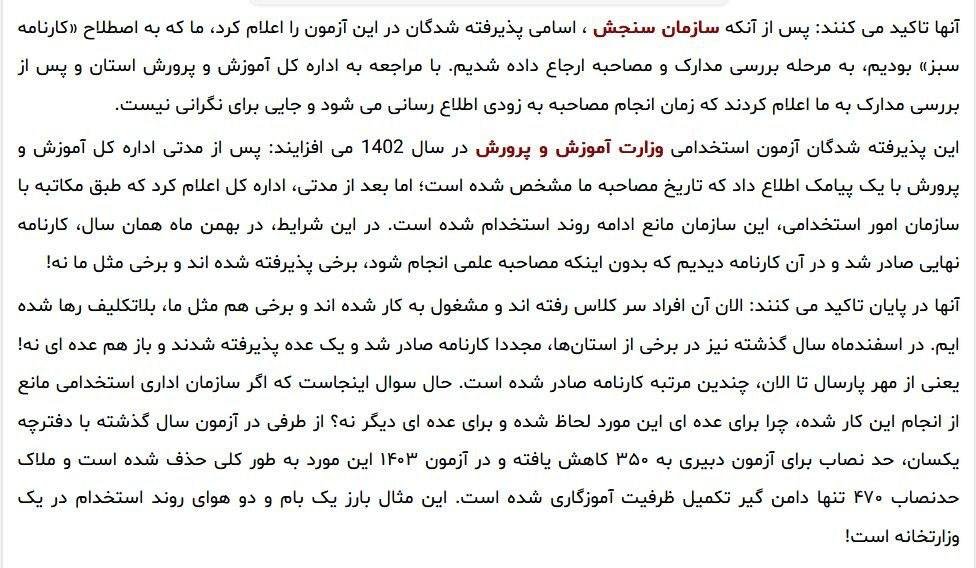 الرئيسية/ الاجتماع/تعليمعدد كبير ممن اجتازوا اختبار التوظيف التعليمي يعلنون أنه تم استبعادهم دون إجراء مقابلة علمية! آزاده مختاري, صحفييقرأ0 -الاثنين 2024/11/04 - 10:18كود الأخبار:7949يشارك Take less than a minute, register and share your opinion under this post.Insulting or inciting messages will be deleted.اشتراكالقادم بعد ذلك إهانة الجامعة هذه المرة / بهنوش الطباطبائي مع حارس شخصي !!!! ذهب للدفاع عن الدكتوراهخواندن دقيقة واحدة إنهاء تعاون 50 أستاذًا مع جامعة شريف التكنولوجية في السنوات الأخيرةخواندن دقيقة واحدة فك شفرة الموت المرير لثلاثة طلاب في خريف 2025/ نحتقر الأطفالخواندن دقيقة واحدة هجرة 66 ألف طالب من البلاد خلال 20 عاما / أوباما قال إن كل النخب في العالم هم أمريكيونخواندن دقيقة واحدة تم إبلاغ قرار نقل أبناء أعضاء هيئة التدريسخواندن دقيقة واحدةالأكثر قراءةذكريات أكبر هاشمي رفسنجاني _ 1 اسفند 1378 ولقاء هو بعبدالله جاسبي وقلقه على نتائج الانتخاباتفیلم/أين العمید مرتضى طلاي؟مذكرات أكبر الهاشمي ــ 19 شهريفر 1378ـ استمرت المفاوضات السياسية بين الرجلين مع واز الطبسي حتى اصطحبه إلى طهران، وفي النهاية قرر الهاشمي على ما يبدو أن يخوض انتخابات البرلمان السادس بجدية من هنا.تشير سجلات المجلس الإسلامي الحديثة إلى أن البرلمان ليس رئيس الشؤون ولا يمكنه التدخل أو الموافقة على صلاحيات القائد العام للقوات المسلحة على أي مستوى ناهيك عن الإشراف عليها.ماذا سيحدث لمستقبل إيران مع المرشحين المعلنين للانتخابات الرئاسية؟ / حوار مع الدكتور تقي آزاد ارامكيهل يمكن الشعور بالتعب معك؟تعيين طبيب بيطري من قوا الباسيج رئيساً للشبكة الصحية بدلاً من جراح الأذن والأنف والحنجرة!مذكرات أكبر هاشمي ــ 14 سبتمبر 1378 ــ استمرت لقاءات كبار مديري الجهاز القضائي مع هاشمي رفسنجاني وشكواهم من إهمال رئيس القضاء الجديد هاشمي الشاهرودي.مذكرات أكبر الهاشمي -16 شهريور 1378- التقى الهاشمي مرة أخرى هذه المرة بعد أن التقى الراحل واز الطبسي بجهود عدة لتشجيع الهاشمي على المشاركة في الانتخابات.مذكرات اكبر الهاشمي-18 شهريفر 1378-استمرار جولة الممتلكات والمباني والأعمال في أستان المقدس
