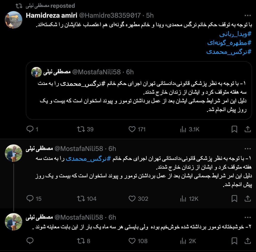 الرئيسية/ الاجتماعالإفراج عن نرجس محمدي من السجن | فشل إضراب سجينين عن الطعاميقرأدقيقة واحدة -الأربعاء 2024/12/04 - 23:37كود الأخبار:9359يشارك وأعلن محامي نرجس محمدي إطلاق سراحها من السجن.وأعلن محامي نرجس محمدي إطلاق سراحها من السجن.كتب مصطفى نيلي على شبكة X الاجتماعية: "وفقا لرأي الطبيب الشرعي ، مكتب المدعي العام في طهران تنفيذ عقوبة السيدة نرجس محمدي لمدة ثلاثة أسابيع وتم إطلاق سراحها من السجن.وأوضح سبب هذا القرار على النحو التالي: "والسبب في ذلك هو الحالة الجسدية للسيدة محمدي بعد عملية استئصال الورم والطعم العظمي ، والتي أجريت قبل واحد وعشرين يوما.كتب السيد نيلي عن مرض نرجس محمدي: لحسن الحظ ، الورم الذي تمت إزالته حميد ، لكن يجب فحصه كل ثلاثة أشهر.كما ذكرت زوجة فيدا رباني أن إضراب زوجها عن الطعام، وكذلك إضراب مطهره غويني، انتهيا بعد إطلاق سراح نرجس محمدي من السجن. Take less than a minute, register and share your opinion under this post.Insulting or inciting messages will be deleted.اشتراكالقادم بعد ذلك إنه شعور يتناسب تماماً مع الواقع.خواندن دقيقة واحدة تويتر يجيبخواندن دقيقة واحدة لقد كتبت على انفراد، ولكن يجب على جميع الناشطين المحليين والأجانب في الفضاء الإلكتروني الذين يعتقدون أنهم مجهولون أو لديهم مهمة عدم الكشف عن هويتهم أن يعرفوا ذلك.خواندن دقيقة واحدة سعر تذكرة الذهاب من تشابهار إلى طهران 12 مليون تومان! / بيع الماشية والأغنام لرحلة علاجية!خواندن دقيقة واحدة منشد الخرمشهري الشهير الذي لم ينشد احتجاجا على فقر الشعب وتحدث بلغة احتجاج الشعب بحضور مسؤولي البلاد!خواندن 0الأكثر قراءةذكريات أكبر هاشمي رفسنجاني _ 1 اسفند 1378 ولقاء هو بعبدالله جاسبي وقلقه على نتائج الانتخاباتفیلم/أين العمید مرتضى طلاي؟مذكرات أكبر الهاشمي ــ 19 شهريفر 1378ـ استمرت المفاوضات السياسية بين الرجلين مع واز الطبسي حتى اصطحبه إلى طهران، وفي النهاية قرر الهاشمي على ما يبدو أن يخوض انتخابات البرلمان السادس بجدية من هنا.تشير سجلات المجلس الإسلامي الحديثة إلى أن البرلمان ليس رئيس الشؤون ولا يمكنه التدخل أو الموافقة على صلاحيات القائد العام للقوات المسلحة على أي مستوى ناهيك عن الإشراف عليها.ماذا سيحدث لمستقبل إيران مع المرشحين المعلنين للانتخابات الرئاسية؟ / حوار مع الدكتور تقي آزاد ارامكيهل يمكن الشعور بالتعب معك؟تعيين طبيب بيطري من قوا الباسيج رئيساً للشبكة الصحية بدلاً من جراح الأذن والأنف والحنجرة!مذكرات أكبر هاشمي ــ 14 سبتمبر 1378 ــ استمرت لقاءات كبار مديري الجهاز القضائي مع هاشمي رفسنجاني وشكواهم من إهمال رئيس القضاء الجديد هاشمي الشاهرودي.مذكرات أكبر الهاشمي -16 شهريور 1378- التقى الهاشمي مرة أخرى هذه المرة بعد أن التقى الراحل واز الطبسي بجهود عدة لتشجيع الهاشمي على المشاركة في الانتخابات.مذكرات اكبر الهاشمي-18 شهريفر 1378-استمرار جولة الممتلكات والمباني والأعمال في أستان المقدس