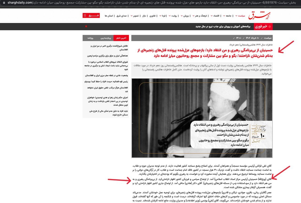 خانه/روزنوشتهای اکبر هاشمی رفسنجانیبه نمونه دیگری از سانسور خاطرات امروز اکبر هاشمی رفسنجانی به نوشته های ملاقات روح الله حسینیان در انتقاد از آیتالله خامنهای در سایت روزنامه شرق (که صحت دارد) و نوشته تعدیل شده خانه موزه هاشمی دقت کنید.خواندن1 دقیقه -یکشنبه 1403/07/01 - 20:13کد خبر3432اشتراکگذاریتصویر تصویر PreviousNextواقعا چرا اینکار را میکنید؟ کمتر از یک دقیقه زمان بگذارید، ثبتنام کنید و نظرتان را زیر همین پست به اشتراک بگذارید.پیامهای توهینآمیز و یا حاوی دعوت به خشونت حذف خواهند شد.ثبت نامدر ادامه بخوانید خاطرات اکبر هاشمی - ۹ بهمن ١٣٨١خواندن 4 دقیقه مهم - بخشی از روزنوشت اکبر هاشمی رفسنجانی در چهارشنبه ۷ اسفند ۱۳۸۱خواندن 1 دقیقه خاطرات اکبر هاشمی - ۷ بهمن ١٣٨١خواندن 2 دقیقه خاطرات اکبر هاشمی - ۸ بهمن ١٣٨١خواندن 3 دقیقه خاطرات اکبر هاشمی - ۶ بهمن ١٣٨١خواندن 3 دقیقهباید خواندخاطرات اکبر هاشمی - ۱ اسفند ۱۳۷۸ - ملاقات عبدالله جاسبی و نگرانی از نتایج انتخاباتفیلم/ سردار مرتضی طلایی کجاست؟خاطرات اکبر هاشمی - ۱۹ شهريور ۱۳۷۸ - مذاکرات دو نفره سیاسی با واعظ طبسی تا هنگام بدرقه به سوی تهران هم ادامه داشته که در نهایت هاشمی ظاهرا از اینجا تصمیم به شرکت جدی در انتخابات مجلس ششم گرفتسوابق ادوار اخیر مجلس شورای اسلامی نشان داد که مجلس در راس امور نیست و در اختیارات فرمانده کل قوا و نیروهای مسلح در هیچ سطحی نمیتواند دخالت و یا مصوبه طی کند، چه برسد که نظارت کندآینده ایران با نامزدهای اعلام شده انتخابات ریاست جمهوری چه میشود؟ / گفتگو با دکتر تقی آزاد ارمکیمیشه با شما احساس خستگی کرد؟یک دامپزشک بسیجی بجای جراح گوش و حلق و بینی سرپرست شبکه بهداشت ایذه شد!خاطرات اکبر هاشمی - ۱۴ شهريور ۱۳۷۸ - دیدار مدیران ارشد دستگاه قضایی با هاشمی رفسنجانی و گله آنان از بی توجهی هاشمی شاهرودی رییس جدید قوه قضاییه ادامه داردخاطرات اکبر هاشمی - ۱۶ شهريور ۱۳۷۸ - در ادامه تلاش های مرحوم واعظ طبسی که در دیدارهای مکرر برای تشویق هاشمی به شرکت در انتخابات اقدام میکرد این بار هم او با هاشمی ملاقات کردخاطرات اکبر هاشمی - ۱۸ شهريور ۱۳۷۸ - ادامه بازدید ها از متعلقات و ابنیه و آثار آستان قدس