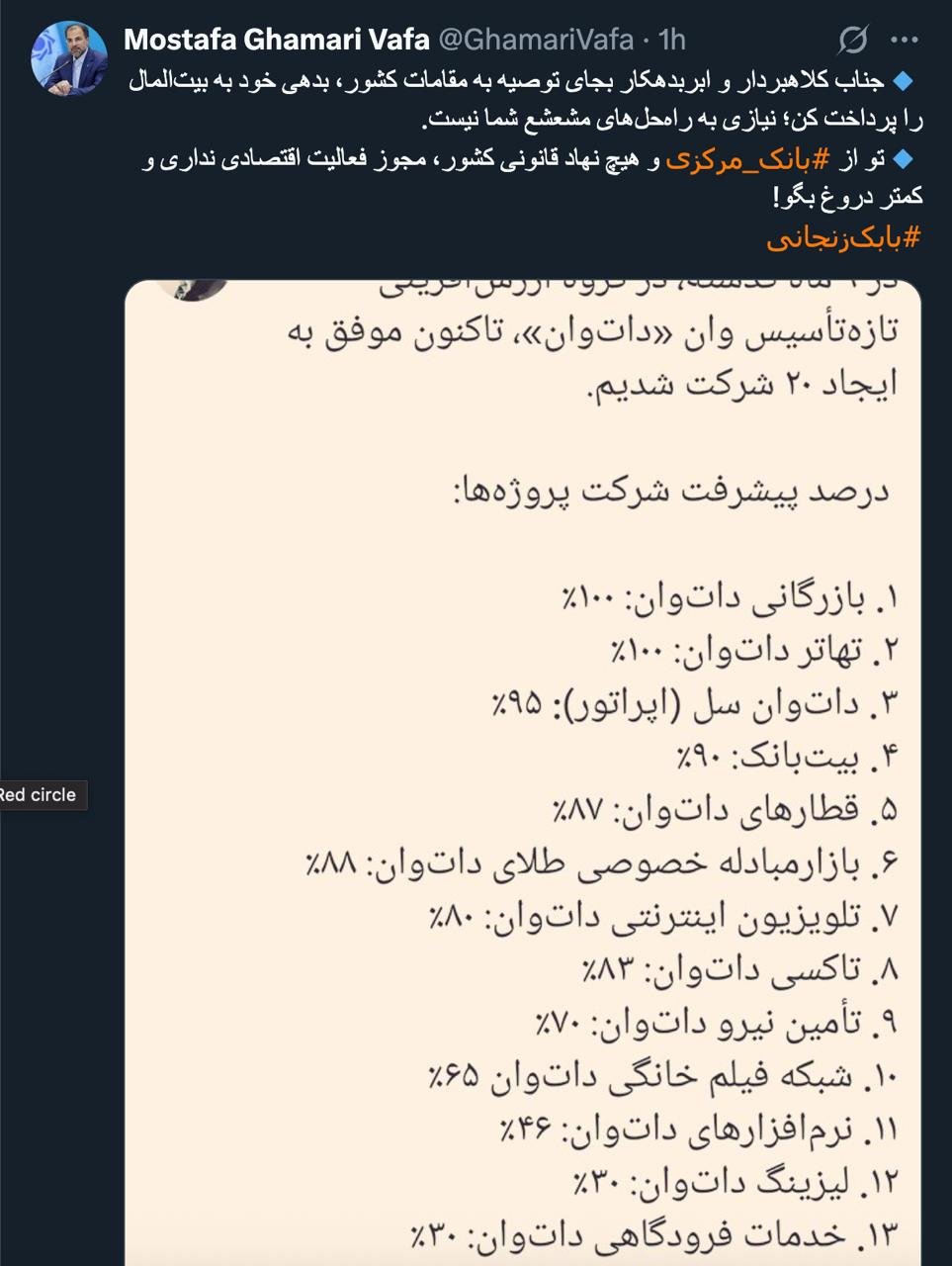 خانه/اقتصادی آقای قمری وفا درود به عنوان مدیر روابط عمومی بانک مرکزی میخواهید بفرمایید آقای نامبرده بدهی و رد مال خود را به اجرای احکام دادسرای مجری حکم پرداخت ننموده و بدون تادیه رد مال از ارفاقات قانونی برخوردار شده؟خواندن1 دقیقه -پنجشنبه 1404/04/19 - 12:30کد خبر21136اشتراکگذاری چنین چیزی بر خلاف ادعای رسمی قوه قضاییه است. واقعاً قضیه چیست؟🔹جناب کلاهبردار و ابربدهکار بجای توصیه به مقامات کشور، بدهی خود به بیتالمال را پرداخت کن؛ نیازی به راهحلهای مشعشع شما نیست.🔹تو از #بانک_مرکزی و هیچ نهاد قانونی کشور، مجوز فعالیت اقتصادی نداری و کمتر دروغ بگو!#بابکزنجانی https://t.co/TdF31d5ZsP pic.twitter.com/1RwgNRdxfA— Mostafa Ghamari Vafa (@GhamariVafa) July 10, 2025🔴 آقای قمری وفا @GhamariVafa درود@babakzanjani3 💢 به عنوان مدیر روابط عمومی بانک مرکزی میخواهید بفرمایید آقای نامبرده بدهی و رد مال خود را به اجرای احکام دادسرای مجری حکم پرداخت ننموده و بدون تادیه رد مال از ارفاقات قانونی برخوردار شده؟📌چنین چیزی بر خلاف ادعای رسمی قوه… https://t.co/TQbbMu5r49— AbdiMedia - Abdollah Abdi (@abdolah_abdi) July 10, 2025 کمتر از یک دقیقه زمان بگذارید، ثبتنام کنید و نظرتان را زیر همین پست به اشتراک بگذارید.پیامهای توهینآمیز و یا حاوی دعوت به خشونت حذف خواهند شد.ثبت نامدر ادامه بخوانید در میانه جنگ و بحرانی ترین روزهای جمهوری اسلامی میخواهم باز تکرار کنم، اگرچه بسیاری از عقبه های گروه مالی زاویه که واسط مالی و پولشویی گسترده بود اکنون نیستندخواندن 2 دقیقه یک سوال مهم برای من هم پیش آمده است آیا حراست بانک قرض الحسنه رسالت و مدیر حراست پرسنلی مرکز حراست بانک مرکزی هم برایشان مهم است یا نه؟خواندن 1 دقیقه درود به همان دلیل که فلان مقام خاص و عالی رتبه تصویب کرده تا سازمان انرژی اتمی مجری موارد این چنینی باشدخواندن 1 دقیقه آقای شاهین مستوفی هم با وجود صدور قرار منع تعقیب برای اتهام ترک فعل در رسیدگی به وضعیت فرار مالیاتی گروه مالی زاویه...خواندن 1 دقیقه هرکس که به عنوان مدیرعامل یا عضو هیئت مدیره بانکها اعم از دولتی یا خصوصی پیشنهاد میشود علاوه بر شرایط تخصصی مدنظر بانک مرکزی...خواندن 1 دقیقهباید خواندخاطرات اکبر هاشمی - ۱ اسفند ۱۳۷۸ - ملاقات عبدالله جاسبی و نگرانی از نتایج انتخاباتفیلم/ سردار مرتضی طلایی کجاست؟خاطرات اکبر هاشمی - ۱۹ شهريور ۱۳۷۸ - مذاکرات دو نفره سیاسی با واعظ طبسی تا هنگام بدرقه به سوی تهران هم ادامه داشته که در نهایت هاشمی ظاهرا از اینجا تصمیم به شرکت جدی در انتخابات مجلس ششم گرفتسوابق ادوار اخیر مجلس شورای اسلامی نشان داد که مجلس در راس امور نیست و در اختیارات فرمانده کل قوا و نیروهای مسلح در هیچ سطحی نمیتواند دخالت و یا مصوبه طی کند، چه برسد که نظارت کندآینده ایران با نامزدهای اعلام شده انتخابات ریاست جمهوری چه میشود؟ / گفتگو با دکتر تقی آزاد ارمکیمیشه با شما احساس خستگی کرد؟یک دامپزشک بسیجی بجای جراح گوش و حلق و بینی سرپرست شبکه بهداشت ایذه شد!خاطرات اکبر هاشمی - ۱۴ شهريور ۱۳۷۸ - دیدار مدیران ارشد دستگاه قضایی با هاشمی رفسنجانی و گله آنان از بی توجهی هاشمی شاهرودی رییس جدید قوه قضاییه ادامه داردخاطرات اکبر هاشمی - ۱۶ شهريور ۱۳۷۸ - در ادامه تلاش های مرحوم واعظ طبسی که در دیدارهای مکرر برای تشویق هاشمی به شرکت در انتخابات اقدام میکرد این بار هم او با هاشمی ملاقات کردخاطرات اکبر هاشمی - ۱۸ شهريور ۱۳۷۸ - ادامه بازدید ها از متعلقات و ابنیه و آثار آستان قدس