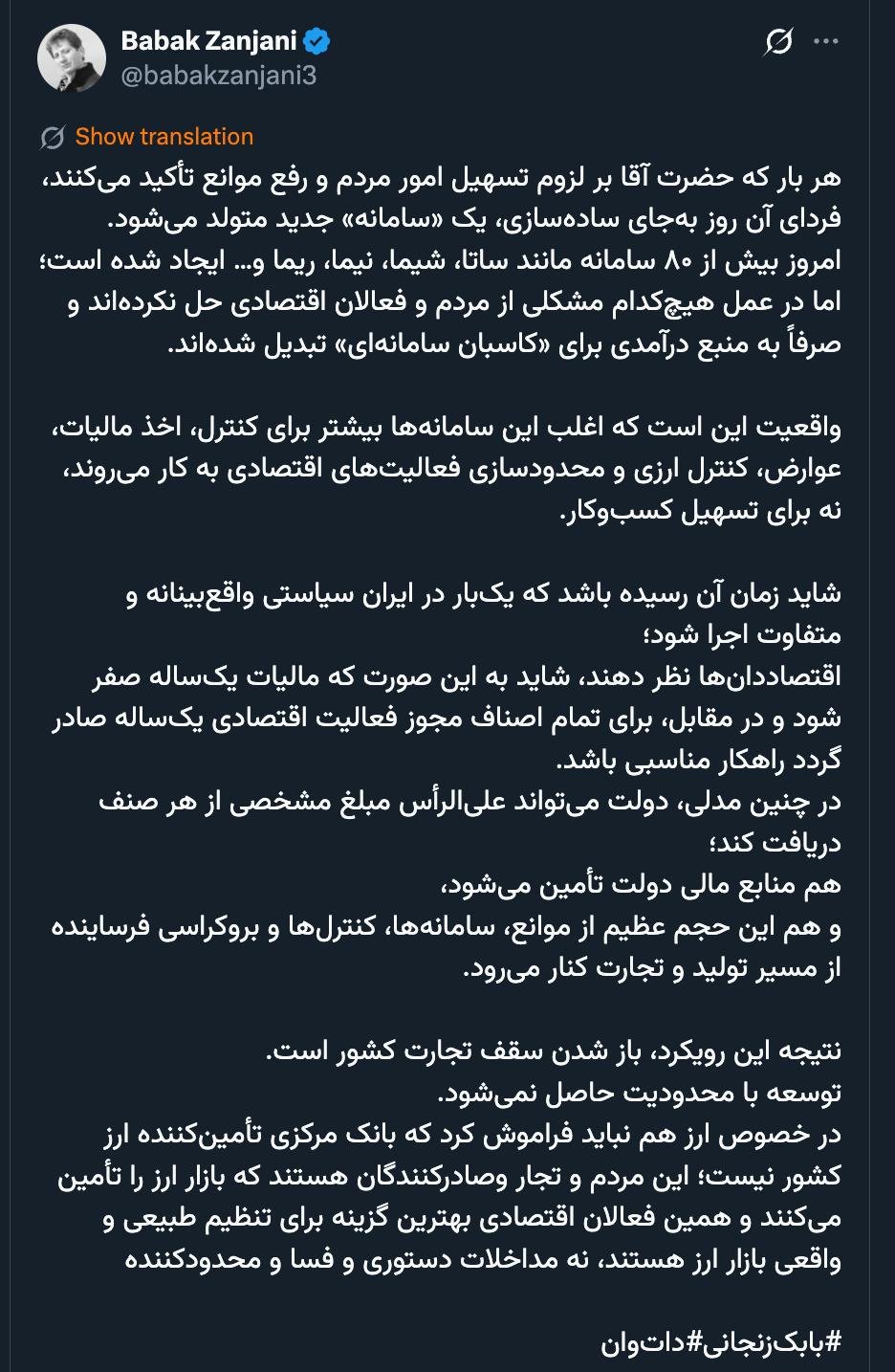 Home/EconomicDear Babak Zanjani, greetings. I asked a question once again, and I find it very strange!Read2 minutes -Saturday 2025/11/29 - 13:21News Code:23742Share How is it possible that the Ayatollah, as the Absolute Guardian Jurist (Vali-e Mutlaq-e Faqih) and Leader of the Ummah, with unlimited powers under Article 57 of the Constitutional Amendment, issues an order...How is it possible that the Ayatollah, as the Absolute Guardian Jurist (Vali-e Mutlaq-e Faqih) and Leader of the Ummah, with unlimited powers under Article 57 of the Constitutional Amendment, issues an order or makes statements and expresses intentions, and others, including the government, do not heed them, and then he says, 'No one listened'?!Shouldn't there be a unit in his office to supervise the implementation and follow-up of these intentions, and should the insubordinate not be dealt with according to disciplinary and criminal laws?Even mid-level government officials have such a section in their offices, but the office of the Leader of the Islamic Republic does not?Image هر بار که حضرت آقا بر لزوم تسهیل امور مردم و رفع موانع تأکید میکنند، فردای آن روز بهجای سادهسازی، یک «سامانه» جدید متولد میشود.امروز بیش از ۸۰ سامانه مانند ساتا، شیما، نیما، ریما و… ایجاد شده است؛ اما در عمل هیچکدام مشکلی از مردم و فعالان اقتصادی حل نکردهاند و صرفاً به… pic.twitter.com/8XmeurYzYQ— Babak Zanjani (@babakzanjani3) November 28, 2025🔴 جناب بابک زنجانیدرود@Khamenei_fa @drpezeshkian @mb_ghalibaf 💢یک بار دیگر هم سوال پرسیدم و برایم خیلی عجیب است!📌 مگر میشود آیتالله به عنوان #ولایت_مطلقه_فقیه و #امامت_امت با اختیارات بی حد و حصر در اصل ۵۷ متمم قانون اساسی دستوری بدهد و یا سخنانی بیان کند و #منویات ی…— AbdiMedia - Abdollah Abdi (@abdolah_abdi) November 28, 2025 Take less than a minute, register and share your opinion under this post.Insulting or inciting messages will be deleted.Sign UpComming Up Next When do the board members of "Bank Sepah" plan to change the name of this very old and historic bank to "Omid"?خواندن 0 Which interrogation and which prosecutor's office? Do you have any news?خواندن 1 minute The horrific increase in car prices coincides with nationwide and bloody protests in Iranخواندن 1 minute To be recorded in history on the country's most critical days, addressed to the Chief of the National Tax Administrationخواندن 2 minutes This time, as soon as the investigation into the charges of tax evasion and social security claims begins and the resulting actions are abandoned by the Tax Administration and the Social Security Organization...خواندن 2 minutesMost ReadMemories of Akbar Hashemi - February 20, 2000 - Meeting with Abdullah Jasbi and Concerns About Election ResultsMovie / Where is Commander Morteza Talaie?Akbar Hashemi's memoirs - 1999 September 10 - The two-person political negotiations with Vaez Tabasi continued until he was escorted to Tehran, where Hashemi apparently decided to seriously participate in the sixth parliamentary elections.The records of the recent periods of the Islamic Council showed that the parliament is not in charge of affairs and cannot interfere or pass resolutions on the authority of the Commander-in-Chief of the Armed Forces at any level, let alone supervise.What will be the future of Iran with the announced candidates for the presidential election? / Conversation with Dr. Taghi Azad AramakiCan I feel tired with you?A Basiji veterinarian was appointed head of the health network instead of an otolaryngologist.Akbar Hashemi's memoirs - 1999 September 5 - The meeting of the senior managers of the judiciary with Hashemi Rafsanjani and their complaint about the neglect of Hashemi Shahroudi, the new head of the judiciary, continues.Memories of Akbar Hashemi - 1999 September 7 - In continuation of the efforts of the late Vaez Tabasi, who used to encourage Hashemi to participate in the elections in frequent meetings, this time he also met with Hashemi.Akbar Hashemi's memories - 1999 September 9 - Continued visits to the belongings, buildings and works of Astan Quds