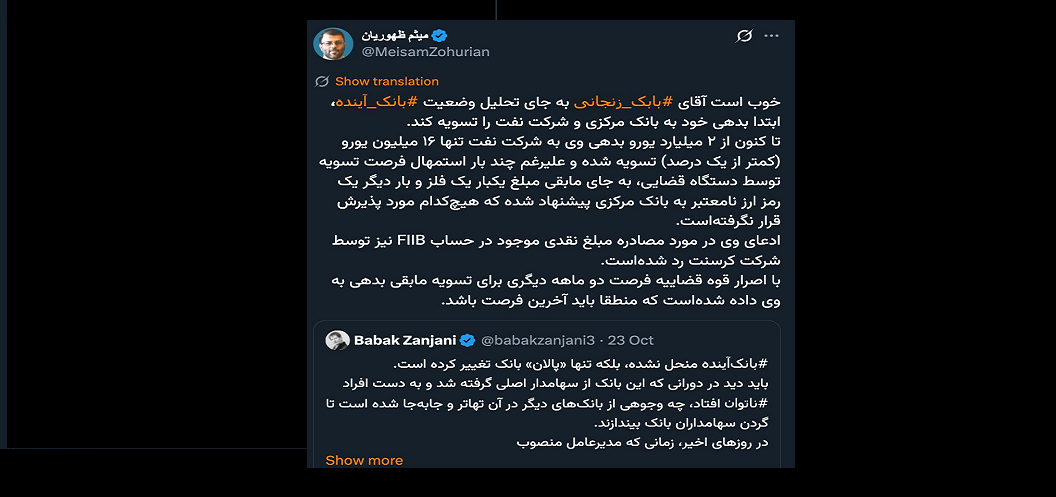 Home/EconomicGreetings, Mr. Representative of the Islamic Council, are all these official assertions of the judiciary about the settlement of property rejections true? is it possibleRead1 minute -Sunday 2025/11/02 - 01:30News Code:23330Share خوب است آقای #بابک_زنجانی به جای تحلیل وضعیت #بانک_آینده، ابتدا بدهی خود به بانک مرکزی و شرکت نفت را تسویه کند. تا کنون از ۲ میلیارد یورو بدهی وی به شرکت نفت تنها ۱۶ میلیون یورو (کمتر از یک درصد) تسویه شده و علیرغم چند بار استمهال فرصت تسویه توسط دستگاه قضایی، به جای مابقی مبلغ… https://t.co/eLKXlwYwuo— میثم ظهوریان (@MeisamZohurian) November 1, 2025⭕️ آقای نماینده مجلس شورای اسلامیدرود💢میفرمایید این همه تاکیدات رسمی قوه قضاییه دال بر تسویه رد مال صحت ندارد؟ ممکن است؟— AbdiMedia - Abdollah Abdi (@abdolah_abdi) November 1, 2025 Take less than a minute, register and share your opinion under this post.Insulting or inciting messages will be deleted.Sign UpComming Up Next When do the board members of "Bank Sepah" plan to change the name of this very old and historic bank to "Omid"?خواندن 0 Which interrogation and which prosecutor's office? Do you have any news?خواندن 1 minute The horrific increase in car prices coincides with nationwide and bloody protests in Iranخواندن 1 minute To be recorded in history on the country's most critical days, addressed to the Chief of the National Tax Administrationخواندن 2 minutes This time, as soon as the investigation into the charges of tax evasion and social security claims begins and the resulting actions are abandoned by the Tax Administration and the Social Security Organization...خواندن 2 minutesMost ReadMemories of Akbar Hashemi - February 20, 2000 - Meeting with Abdullah Jasbi and Concerns About Election ResultsMovie / Where is Commander Morteza Talaie?Akbar Hashemi's memoirs - 1999 September 10 - The two-person political negotiations with Vaez Tabasi continued until he was escorted to Tehran, where Hashemi apparently decided to seriously participate in the sixth parliamentary elections.The records of the recent periods of the Islamic Council showed that the parliament is not in charge of affairs and cannot interfere or pass resolutions on the authority of the Commander-in-Chief of the Armed Forces at any level, let alone supervise.What will be the future of Iran with the announced candidates for the presidential election? / Conversation with Dr. Taghi Azad AramakiCan I feel tired with you?A Basiji veterinarian was appointed head of the health network instead of an otolaryngologist.Akbar Hashemi's memoirs - 1999 September 5 - The meeting of the senior managers of the judiciary with Hashemi Rafsanjani and their complaint about the neglect of Hashemi Shahroudi, the new head of the judiciary, continues.Memories of Akbar Hashemi - 1999 September 7 - In continuation of the efforts of the late Vaez Tabasi, who used to encourage Hashemi to participate in the elections in frequent meetings, this time he also met with Hashemi.Akbar Hashemi's memories - 1999 September 9 - Continued visits to the belongings, buildings and works of Astan Quds