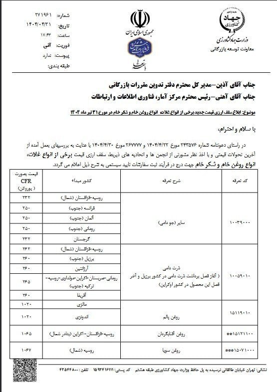 Home/EconomicNew approved price of livestock, oil and sugar inputs.Read1 minute -Wednesday 2025/07/23 - 11:53News Code:21732Share Image Take less than a minute, register and share your opinion under this post.Insulting or inciting messages will be deleted.Sign UpComming Up Next An important question has also arisen for me: Does the security department of Qarz al-Hasaneh Resalat Bank and the personnel security manager of the Central Bank's security department even care about this or not?خواندن 1 minute Greetings, for the same reason that some special and high-ranking authority has approved for the Atomic Energy Organization to implement such casesخواندن 1 minute Mr. Shahin Mostowfi, despite the issuance of a non-prosecution order regarding the charge of dereliction of duty in investigating the tax evasion status of the Zavieh Financial Group...خواندن 1 minute Anyone who is proposed as the CEO or a member of the board of directors of banks, whether public or private, in addition to the specialized conditions considered by the Central Bank...خواندن 1 minute When do the board members of "Bank Sepah" plan to change the name of this very old and historic bank to "Omid"?خواندن 0Most ReadMemories of Akbar Hashemi - February 20, 2000 - Meeting with Abdullah Jasbi and Concerns About Election ResultsMovie / Where is Commander Morteza Talaie?Akbar Hashemi's memoirs - 1999 September 10 - The two-person political negotiations with Vaez Tabasi continued until he was escorted to Tehran, where Hashemi apparently decided to seriously participate in the sixth parliamentary elections.The records of the recent periods of the Islamic Council showed that the parliament is not in charge of affairs and cannot interfere or pass resolutions on the authority of the Commander-in-Chief of the Armed Forces at any level, let alone supervise.What will be the future of Iran with the announced candidates for the presidential election? / Conversation with Dr. Taghi Azad AramakiCan I feel tired with you?A Basiji veterinarian was appointed head of the health network instead of an otolaryngologist.Akbar Hashemi's memoirs - 1999 September 5 - The meeting of the senior managers of the judiciary with Hashemi Rafsanjani and their complaint about the neglect of Hashemi Shahroudi, the new head of the judiciary, continues.Memories of Akbar Hashemi - 1999 September 7 - In continuation of the efforts of the late Vaez Tabasi, who used to encourage Hashemi to participate in the elections in frequent meetings, this time he also met with Hashemi.Akbar Hashemi's memories - 1999 September 9 - Continued visits to the belongings, buildings and works of Astan Quds