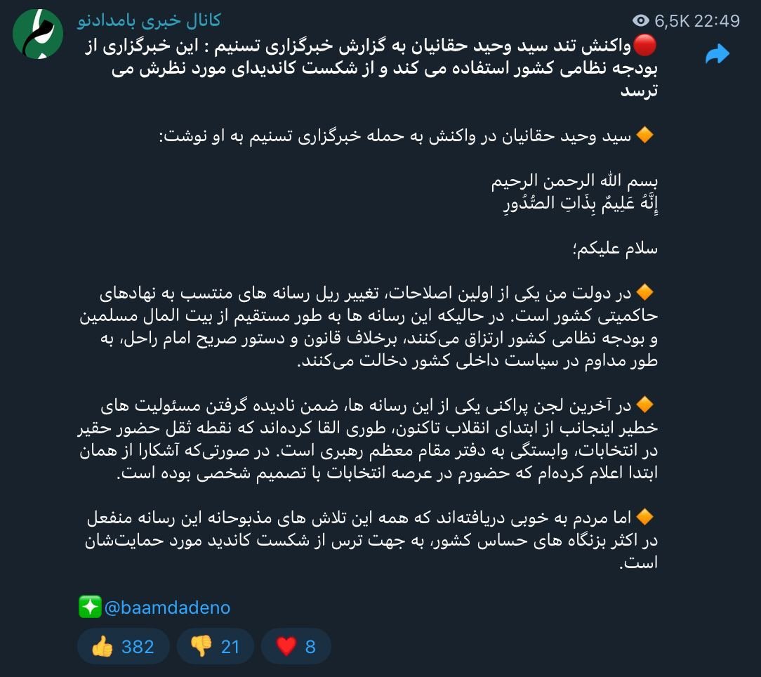 Home/elections Seyyed Vahid Haqqanian, in response to Tasnim News Agency's report, wrote:Read1 minute -Sunday 2024/10/20 - 15:49News Code:5480Share This news agency uses the country’s military budget and is afraid of the defeat of its favored candidate.Now, as a journalist, I have an important question for Mr. Seyyed Vahid Haqqanian.Mr. Haqqanian, Greetings.Could you please explain, in the position of a potential president, with what resources and capabilities (whether it’s you or any other president) you can limit and bring under control all this activity on social media, ranging from official news agencies to websites and anonymous cyber accounts supported by or under the backing of military institutions and various social, cultural, and security centers—both known and unknown?Even Seyyed Ebrahim Raisi, with the system and the two other branches of power, as well as the armed forces, at least appearing to be aligned with him, couldn’t achieve this. What, then, can be expected for the next president?" Take less than a minute, register and share your opinion under this post.Insulting or inciting messages will be deleted.Sign UpComming Up Next Sheikh Mustafa apparently does not have the habit of introducing all his advisors and associates in this campaign to both maintain his circle at this stage and after the election, and to remind other candidates to observe the law.خواندن 0 Sheikh Mohammad Hossein Ahmadi Shahroodi, the special religious judge of the Islamic Revolutionary Courts and former advisor of Branch 6 of the Supreme Court, and former representative of the Assembly of Experts, also expressed support for Dr. Masoud Pezخواندن 1 minute Can the protection of the cultural institutions in the country really impose their taste?خواندن 1 minute Mr. Qalibaf, isn't this more than an election violation?خواندن 1 minute Sokhon Ribabadi, Deputy of International Affairs of the Judiciaryخواندن 1 minuteMost ReadMemories of Akbar Hashemi - February 20, 2000 - Meeting with Abdullah Jasbi and Concerns About Election ResultsMovie / Where is Commander Morteza Talaie?Akbar Hashemi's memoirs - 1999 September 10 - The two-person political negotiations with Vaez Tabasi continued until he was escorted to Tehran, where Hashemi apparently decided to seriously participate in the sixth parliamentary elections.The records of the recent periods of the Islamic Council showed that the parliament is not in charge of affairs and cannot interfere or pass resolutions on the authority of the Commander-in-Chief of the Armed Forces at any level, let alone supervise.What will be the future of Iran with the announced candidates for the presidential election? / Conversation with Dr. Taghi Azad AramakiCan I feel tired with you?A Basiji veterinarian was appointed head of the health network instead of an otolaryngologist.Akbar Hashemi's memoirs - 1999 September 5 - The meeting of the senior managers of the judiciary with Hashemi Rafsanjani and their complaint about the neglect of Hashemi Shahroudi, the new head of the judiciary, continues.Memories of Akbar Hashemi - 1999 September 7 - In continuation of the efforts of the late Vaez Tabasi, who used to encourage Hashemi to participate in the elections in frequent meetings, this time he also met with Hashemi.Akbar Hashemi's memories - 1999 September 9 - Continued visits to the belongings, buildings and works of Astan Quds