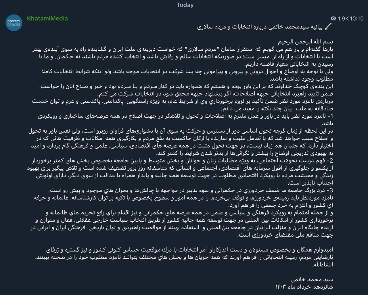 Home/electionsSeyyed Mohammad Khatami, after not participating in the elections for the Islamic Consultative Assembly and the Assembly of Experts, announced in a statement that he would participate in the elections if the proposals of the Reform Front are realized.Read1 minute -Saturday 2024/10/19 - 21:45News Code:5487Share Now, please review my notes regarding the lack of restrictions on him following his previous statements. Isn't it interesting? Take less than a minute, register and share your opinion under this post.Insulting or inciting messages will be deleted.Sign UpComming Up Next Sheikh Mustafa apparently does not have the habit of introducing all his advisors and associates in this campaign to both maintain his circle at this stage and after the election, and to remind other candidates to observe the law.خواندن 0 Sheikh Mohammad Hossein Ahmadi Shahroodi, the special religious judge of the Islamic Revolutionary Courts and former advisor of Branch 6 of the Supreme Court, and former representative of the Assembly of Experts, also expressed support for Dr. Masoud Pezخواندن 1 minute Can the protection of the cultural institutions in the country really impose their taste?خواندن 1 minute Mr. Qalibaf, isn't this more than an election violation?خواندن 1 minute Sokhon Ribabadi, Deputy of International Affairs of the Judiciaryخواندن 1 minuteMost ReadMemories of Akbar Hashemi - February 20, 2000 - Meeting with Abdullah Jasbi and Concerns About Election ResultsMovie / Where is Commander Morteza Talaie?Akbar Hashemi's memoirs - 1999 September 10 - The two-person political negotiations with Vaez Tabasi continued until he was escorted to Tehran, where Hashemi apparently decided to seriously participate in the sixth parliamentary elections.The records of the recent periods of the Islamic Council showed that the parliament is not in charge of affairs and cannot interfere or pass resolutions on the authority of the Commander-in-Chief of the Armed Forces at any level, let alone supervise.What will be the future of Iran with the announced candidates for the presidential election? / Conversation with Dr. Taghi Azad AramakiCan I feel tired with you?A Basiji veterinarian was appointed head of the health network instead of an otolaryngologist.Akbar Hashemi's memoirs - 1999 September 5 - The meeting of the senior managers of the judiciary with Hashemi Rafsanjani and their complaint about the neglect of Hashemi Shahroudi, the new head of the judiciary, continues.Memories of Akbar Hashemi - 1999 September 7 - In continuation of the efforts of the late Vaez Tabasi, who used to encourage Hashemi to participate in the elections in frequent meetings, this time he also met with Hashemi.Akbar Hashemi's memories - 1999 September 9 - Continued visits to the belongings, buildings and works of Astan Quds
