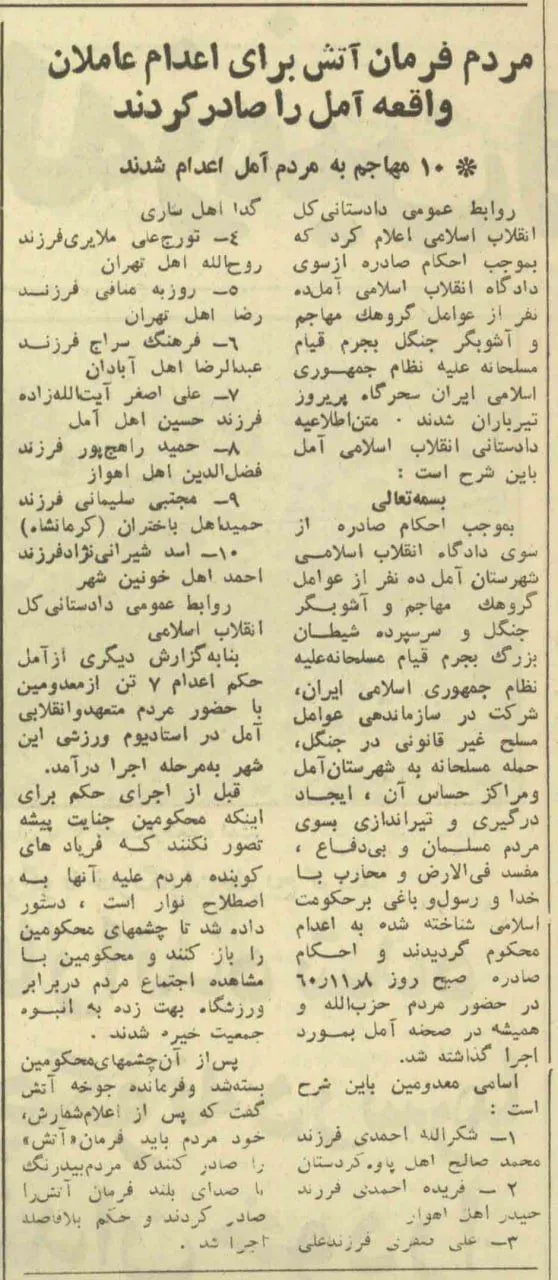 Home/HistoricalIn addition to the significant number of executions (shootings) in 1981, the way they were carried out publicly this year is rare and highly controversialRead1 minute -Thursday 2024/09/26 - 00:50News Code:2399Share In this news of Kihan newspaper, published on January 30, 1982, it is clearly reported that shootings were carried out in the stadium and the order to fire was issued. Take less than a minute, register and share your opinion under this post.Insulting or inciting messages will be deleted.Sign UpComming Up Next Watch | Mohammad Reza Pahlavi's rare and shocking news conference on oil, inflation and economic issuesخواندن 1 minute Ms. Farrokhro Parsa, the Minister of Education of the Hoveyda government, is visiting the exam session of one of the teacher training centers in Fars province.خواندن 1 minute On his deathbed, Shah Ismail was only thinking about Iran.خواندن 1 minute News of 1995: The United States has once again called for negotiations with the Islamic Republic of Iran!خواندن 1 minute Ayatollah Seyyed Ahmad Khwansari, Allama Seyyed Mohammad Hossein Tabataba'i, Seyyed Reza Sadr and Seyyed Mohammad Rouhani did not participate in the elections of the Islamic Republic of Iranخواندن 2 minutesMost ReadMemories of Akbar Hashemi - February 20, 2000 - Meeting with Abdullah Jasbi and Concerns About Election ResultsMovie / Where is Commander Morteza Talaie?Akbar Hashemi's memoirs - 1999 September 10 - The two-person political negotiations with Vaez Tabasi continued until he was escorted to Tehran, where Hashemi apparently decided to seriously participate in the sixth parliamentary elections.The records of the recent periods of the Islamic Council showed that the parliament is not in charge of affairs and cannot interfere or pass resolutions on the authority of the Commander-in-Chief of the Armed Forces at any level, let alone supervise.What will be the future of Iran with the announced candidates for the presidential election? / Conversation with Dr. Taghi Azad AramakiCan I feel tired with you?A Basiji veterinarian was appointed head of the health network instead of an otolaryngologist.Akbar Hashemi's memoirs - 1999 September 5 - The meeting of the senior managers of the judiciary with Hashemi Rafsanjani and their complaint about the neglect of Hashemi Shahroudi, the new head of the judiciary, continues.Memories of Akbar Hashemi - 1999 September 7 - In continuation of the efforts of the late Vaez Tabasi, who used to encourage Hashemi to participate in the elections in frequent meetings, this time he also met with Hashemi.Akbar Hashemi's memories - 1999 September 9 - Continued visits to the belongings, buildings and works of Astan Quds