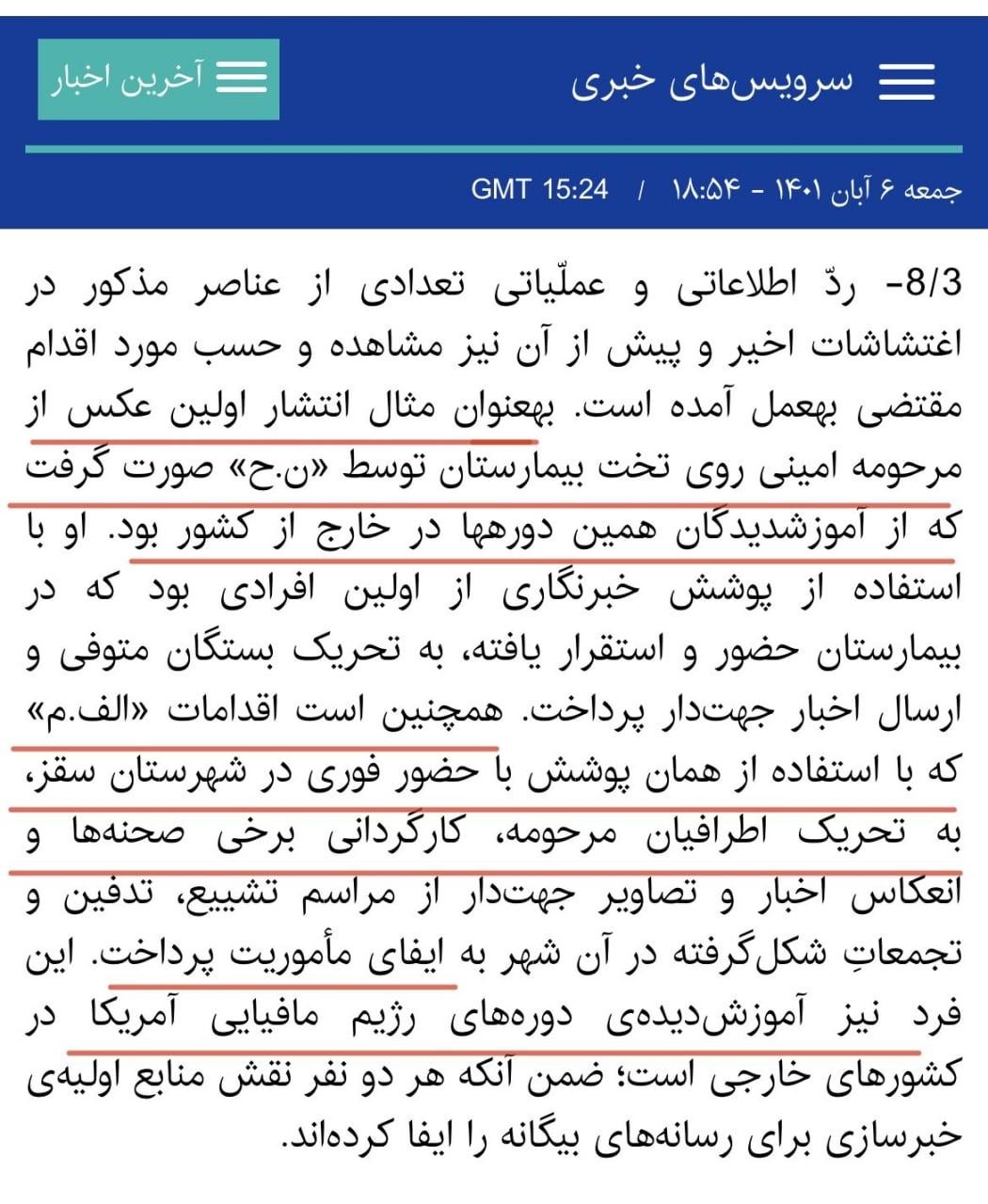 Home/Mahsa AminiThe Ministry of Intelligence and the Intelligence Organization of the Revolutionary Guards have issued a joint statement regarding the recent protests.Read1 minute -Tuesday 2024/09/17 - 19:19News Code:1320Share The Ministry of Intelligence and the Intelligence Organization of the Revolutionary Guards officially accused Niloofar Hamedi, a reporter for Shargh, and Elahe Mohammadi, a reporter for Hemmihan newspaper, of publishing the first photo of Mahsa Amini on the hospital bed and disseminating "biased news" about the funeral, burial, and initial protests.These two intelligence agencies described the reporters as individuals trained in courses by what they call the "mafia regime of the United States" in foreign countries, and accused them of serving as primary sources of news for "foreign media." Take less than a minute, register and share your opinion under this post.Insulting or inciting messages will be deleted.Sign UpComming Up Next Ali Entazari, a university professor, used the phrase "the annihilation of a Sunni Kurdish girl" in reference to Mahsa Amini on the program "Shiveh"!خواندن 1 minute Mrs. Dr. Azar Mansouri, head of Iran's reform frontخواندن 1 minute "The anniversary of the release of images of Mahsa (Jina) Amini in Kasra Hospital in Tehran.خواندن 0 "She Sat Among the Pupil of Our Eye..."خواندن 1 minute Less Seen Video: The Moment of Writing "Zhina Gyan, Tu Namri, Nawt E Be Beteram" ("Zhina Gyan, You Will Not Die, Your Name Will Become a Symbol")خواندن 0Most ReadMemories of Akbar Hashemi - February 20, 2000 - Meeting with Abdullah Jasbi and Concerns About Election ResultsMovie / Where is Commander Morteza Talaie?Akbar Hashemi's memoirs - 1999 September 10 - The two-person political negotiations with Vaez Tabasi continued until he was escorted to Tehran, where Hashemi apparently decided to seriously participate in the sixth parliamentary elections.The records of the recent periods of the Islamic Council showed that the parliament is not in charge of affairs and cannot interfere or pass resolutions on the authority of the Commander-in-Chief of the Armed Forces at any level, let alone supervise.What will be the future of Iran with the announced candidates for the presidential election? / Conversation with Dr. Taghi Azad AramakiCan I feel tired with you?A Basiji veterinarian was appointed head of the health network instead of an otolaryngologist.Akbar Hashemi's memoirs - 1999 September 5 - The meeting of the senior managers of the judiciary with Hashemi Rafsanjani and their complaint about the neglect of Hashemi Shahroudi, the new head of the judiciary, continues.Memories of Akbar Hashemi - 1999 September 7 - In continuation of the efforts of the late Vaez Tabasi, who used to encourage Hashemi to participate in the elections in frequent meetings, this time he also met with Hashemi.Akbar Hashemi's memories - 1999 September 9 - Continued visits to the belongings, buildings and works of Astan Quds
