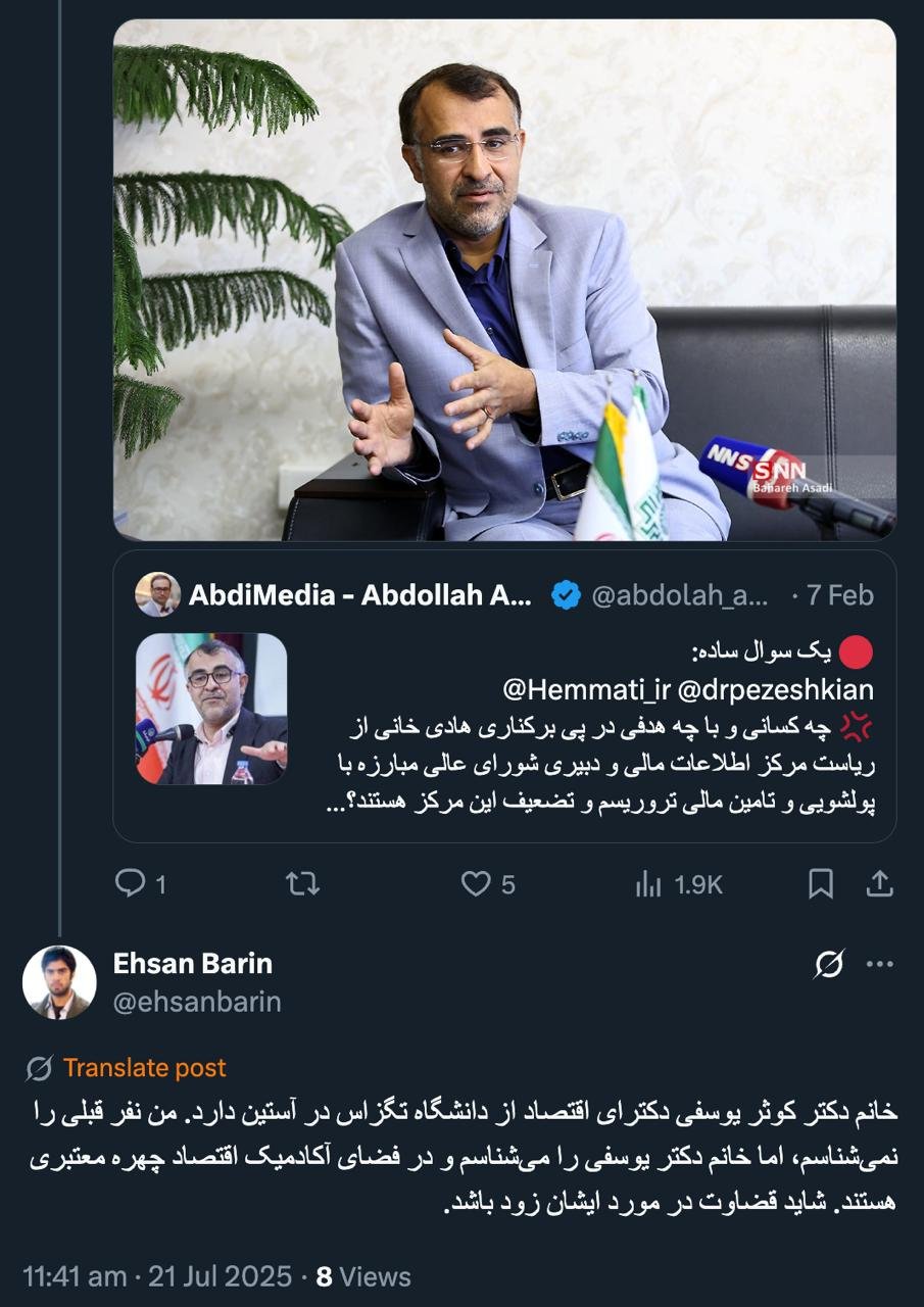 Home/PoliticsI did not make a judgment and of course I did not mention anything about their spouse's job and influence.Read1 minute -Monday 2025/07/21 - 15:48News Code:21661Share خانم دکتر کوثر یوسفی دکترای اقتصاد از دانشگاه تگزاس در آستین دارد. من نفر قبلی را نمیشناسم، اما خانم دکتر یوسفی را میشناسم و در فضای آکادمیک اقتصاد چهره معتبری هستند. شاید قضاوت در مورد ایشان زود باشد.— Ehsan Barin (@ehsanbarin) July 21, 2025🔴 درودمن قضاوتی نکردم و البته هیچ اشارهای هم به شغل ون فوذ همسرشان نکردم— AbdiMedia - Abdollah Abdi (@abdolah_abdi) July 21, 2025Related news The unfortunate change of the successful corruption-fighting manager is a masterpiece of the Minister of Economy in the Pezeshkian government / Khani goes, Yousefi comes? Take less than a minute, register and share your opinion under this post.Insulting or inciting messages will be deleted.Sign UpComming Up Next I remembered Dr. Sadegh Zibakalam's speech about six months ago, when he said: If we enter into a military conflict, whether the system remains or not, not a single electric pole will remain intact in Iran - are you listening?خواندن 0 If this public announcement is not hindered like other parts of the system's security megaproject, yesخواندن 1 minute Regardless of the result of the establishment or non-continuation of the establishment of the Islamic Republic; Should the main leadership option after Ayatollah Khamenei be acted in this way?خواندن 1 minute According to the significant custom of the seminary and jurisprudence, now we have to see which jurist will perform the funeral prayer for Ayatollah Khamenei?خواندن 1 minute In the news of his appointment, I wrote that he is the commander of the camp at the same time as the deputy commander of the army corpsخواندن 1 minuteMost ReadMemories of Akbar Hashemi - February 20, 2000 - Meeting with Abdullah Jasbi and Concerns About Election ResultsMovie / Where is Commander Morteza Talaie?Akbar Hashemi's memoirs - 1999 September 10 - The two-person political negotiations with Vaez Tabasi continued until he was escorted to Tehran, where Hashemi apparently decided to seriously participate in the sixth parliamentary elections.The records of the recent periods of the Islamic Council showed that the parliament is not in charge of affairs and cannot interfere or pass resolutions on the authority of the Commander-in-Chief of the Armed Forces at any level, let alone supervise.What will be the future of Iran with the announced candidates for the presidential election? / Conversation with Dr. Taghi Azad AramakiCan I feel tired with you?A Basiji veterinarian was appointed head of the health network instead of an otolaryngologist.Akbar Hashemi's memoirs - 1999 September 5 - The meeting of the senior managers of the judiciary with Hashemi Rafsanjani and their complaint about the neglect of Hashemi Shahroudi, the new head of the judiciary, continues.Memories of Akbar Hashemi - 1999 September 7 - In continuation of the efforts of the late Vaez Tabasi, who used to encourage Hashemi to participate in the elections in frequent meetings, this time he also met with Hashemi.Akbar Hashemi's memories - 1999 September 9 - Continued visits to the belongings, buildings and works of Astan Quds
