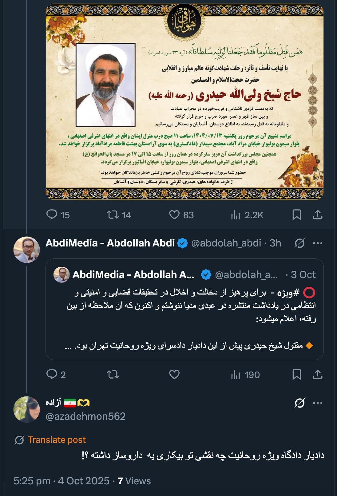 Home/PoliticsTwitter replies on October 5Read1 minute -Sunday 2025/10/05 - 10:27News Code:22946Share The former deputy prosecutor, prosecutor, and judge is more correct.Related news Informed sources narrate | Sheikh Heydari was murdered with a knife in the Baqiyatollah Al-Azm Mosque in Tehran after he had temporarily accepted the offer of the mosque's imam, Vaezinejad, to lead prayers in his absence. Take less than a minute, register and share your opinion under this post.Insulting or inciting messages will be deleted.Sign UpComming Up Next I remembered Dr. Sadegh Zibakalam's speech about six months ago, when he said: If we enter into a military conflict, whether the system remains or not, not a single electric pole will remain intact in Iran - are you listening?خواندن 0 If this public announcement is not hindered like other parts of the system's security megaproject, yesخواندن 1 minute Regardless of the result of the establishment or non-continuation of the establishment of the Islamic Republic; Should the main leadership option after Ayatollah Khamenei be acted in this way?خواندن 1 minute According to the significant custom of the seminary and jurisprudence, now we have to see which jurist will perform the funeral prayer for Ayatollah Khamenei?خواندن 1 minute In the news of his appointment, I wrote that he is the commander of the camp at the same time as the deputy commander of the army corpsخواندن 1 minuteMost ReadMemories of Akbar Hashemi - February 20, 2000 - Meeting with Abdullah Jasbi and Concerns About Election ResultsMovie / Where is Commander Morteza Talaie?Akbar Hashemi's memoirs - 1999 September 10 - The two-person political negotiations with Vaez Tabasi continued until he was escorted to Tehran, where Hashemi apparently decided to seriously participate in the sixth parliamentary elections.The records of the recent periods of the Islamic Council showed that the parliament is not in charge of affairs and cannot interfere or pass resolutions on the authority of the Commander-in-Chief of the Armed Forces at any level, let alone supervise.What will be the future of Iran with the announced candidates for the presidential election? / Conversation with Dr. Taghi Azad AramakiCan I feel tired with you?A Basiji veterinarian was appointed head of the health network instead of an otolaryngologist.Akbar Hashemi's memoirs - 1999 September 5 - The meeting of the senior managers of the judiciary with Hashemi Rafsanjani and their complaint about the neglect of Hashemi Shahroudi, the new head of the judiciary, continues.Memories of Akbar Hashemi - 1999 September 7 - In continuation of the efforts of the late Vaez Tabasi, who used to encourage Hashemi to participate in the elections in frequent meetings, this time he also met with Hashemi.Akbar Hashemi's memories - 1999 September 9 - Continued visits to the belongings, buildings and works of Astan Quds