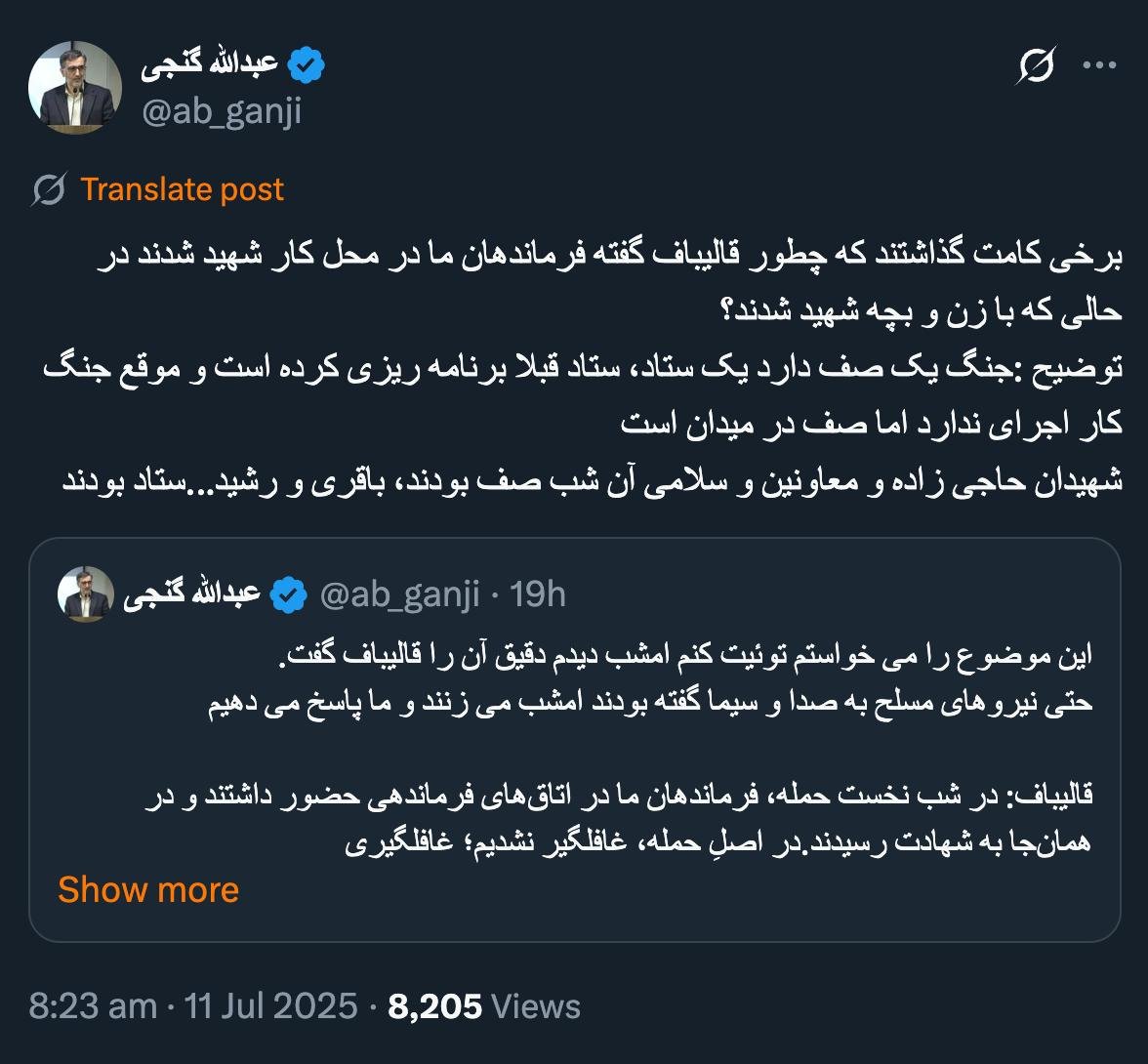 Home/PoliticsMr. Ganji , of course, is not the commander of Khatam's headquarters, and the deputy head of the General Staff is not a headquarters.Read1 minute -Wednesday 2025/07/16 - 13:04News Code:21186Share In this real sensitive situation, I don't want to ask more questions.برخی کامت گذاشتند که چطور قالیباف گفته فرماندهان ما در محل کار شهید شدند در حالی که با زن و بچه شهید شدند؟ توضیح :جنگ یک صف دارد یک ستاد، ستاد قبلا برنامه ریزی کرده است و موقع جنگ کار اجرای ندارد اما صف در میدان استشهیدان حاجی زاده و معاونین و سلامی آن شب صف بودند، باقری و… https://t.co/XFUx5MUaDs— عبدالله گنجی (@ab_ganji) July 11, 2025🔴جناب گنجی، درود💢 البته وظیفه #فرمانده قرارگاه خاتم ستادی نیست و معاون #عملیات ستاد کل هم ستادی نیست.🔸در این موقعیت حساس واقعی بیشتر نمیخواهم سوال بپرسم.— AbdiMedia - Abdollah Abdi (@abdolah_abdi) July 11, 2025 Take less than a minute, register and share your opinion under this post.Insulting or inciting messages will be deleted.Sign UpComming Up Next I remembered Dr. Sadegh Zibakalam's speech about six months ago, when he said: If we enter into a military conflict, whether the system remains or not, not a single electric pole will remain intact in Iran - are you listening?خواندن 0 If this public announcement is not hindered like other parts of the system's security megaproject, yesخواندن 1 minute Regardless of the result of the establishment or non-continuation of the establishment of the Islamic Republic; Should the main leadership option after Ayatollah Khamenei be acted in this way?خواندن 1 minute According to the significant custom of the seminary and jurisprudence, now we have to see which jurist will perform the funeral prayer for Ayatollah Khamenei?خواندن 1 minute In the news of his appointment, I wrote that he is the commander of the camp at the same time as the deputy commander of the army corpsخواندن 1 minuteMost ReadMemories of Akbar Hashemi - February 20, 2000 - Meeting with Abdullah Jasbi and Concerns About Election ResultsMovie / Where is Commander Morteza Talaie?Akbar Hashemi's memoirs - 1999 September 10 - The two-person political negotiations with Vaez Tabasi continued until he was escorted to Tehran, where Hashemi apparently decided to seriously participate in the sixth parliamentary elections.The records of the recent periods of the Islamic Council showed that the parliament is not in charge of affairs and cannot interfere or pass resolutions on the authority of the Commander-in-Chief of the Armed Forces at any level, let alone supervise.What will be the future of Iran with the announced candidates for the presidential election? / Conversation with Dr. Taghi Azad AramakiCan I feel tired with you?A Basiji veterinarian was appointed head of the health network instead of an otolaryngologist.Akbar Hashemi's memoirs - 1999 September 5 - The meeting of the senior managers of the judiciary with Hashemi Rafsanjani and their complaint about the neglect of Hashemi Shahroudi, the new head of the judiciary, continues.Memories of Akbar Hashemi - 1999 September 7 - In continuation of the efforts of the late Vaez Tabasi, who used to encourage Hashemi to participate in the elections in frequent meetings, this time he also met with Hashemi.Akbar Hashemi's memories - 1999 September 9 - Continued visits to the belongings, buildings and works of Astan Quds