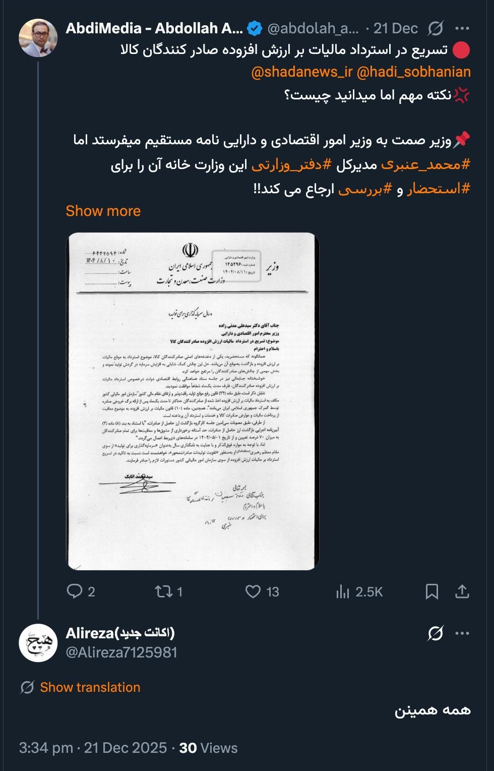 Home/PoliticsIt was novel that the Minister of Economy did not consider the extremely important letter from Minister Samat, who is on his level, and that it was merely referred to by the Director General of the Ministry's Office. Of course, I also briefly mentioned otRead1 minute -Wednesday 2025/12/24 - 15:43News Code:24007Share 🔴 تسریع در استرداد مالیات بر ارزش افزوده صادر کنندگان کالا@hadi_sobhanian @shadanews_ir 💢نکته مهم اما میدانید چیست؟📌وزیر صمت به وزیر امور اقتصادی و دارایی نامه مستقیم میفرستد اما #محمد_عنبری مدیرکل #دفتر_وزارتی این وزارت خانه آن را برای #استحضار و #بررسی ارجاع می کند!!🔸یعنی حتی نامه وزیر صمت به اطلاع وزیر همطراز خود نمیرسد.📌و البته کافیست سایر ارجاعات دفتر وزارتی این وزارت خانه را هم بررسی کنید، تا توان فوق العاده و مدیریت آقای مدیرکل دفتر وزارتی مکشوف شود.— AbdiMedia - Abdollah Abdi (@abdolah_abdi) December 21, 2025Related news Accelerating VAT refunds for exporters of goods Take less than a minute, register and share your opinion under this post.Insulting or inciting messages will be deleted.Sign UpComming Up Next Twitter responses on Februaryخواندن 4 minutes What is really going on inside the country?خواندن 1 minute Confirmation of Abdi Media's notes regarding secret negotiations between the United States and the Islamic Republic by the Ministry of Intelligence's Foreign Intelligence and Movements Organization.خواندن 1 minute Will the day ever come when the accurate narrative of the Jame'eh group's arrest is told? The plans they had, which were thwarted by the meeting between the mother of the Jalaeipour martyrs and Ayatollah Khamenei,خواندن 1 minute Mr. Ambassador of the Islamic Republic, greetings. Does the realization of this seriousness also have a timeframe?خواندن 1 minuteMost ReadMemories of Akbar Hashemi - February 20, 2000 - Meeting with Abdullah Jasbi and Concerns About Election ResultsMovie / Where is Commander Morteza Talaie?Akbar Hashemi's memoirs - 1999 September 10 - The two-person political negotiations with Vaez Tabasi continued until he was escorted to Tehran, where Hashemi apparently decided to seriously participate in the sixth parliamentary elections.The records of the recent periods of the Islamic Council showed that the parliament is not in charge of affairs and cannot interfere or pass resolutions on the authority of the Commander-in-Chief of the Armed Forces at any level, let alone supervise.What will be the future of Iran with the announced candidates for the presidential election? / Conversation with Dr. Taghi Azad AramakiCan I feel tired with you?A Basiji veterinarian was appointed head of the health network instead of an otolaryngologist.Akbar Hashemi's memoirs - 1999 September 5 - The meeting of the senior managers of the judiciary with Hashemi Rafsanjani and their complaint about the neglect of Hashemi Shahroudi, the new head of the judiciary, continues.Memories of Akbar Hashemi - 1999 September 7 - In continuation of the efforts of the late Vaez Tabasi, who used to encourage Hashemi to participate in the elections in frequent meetings, this time he also met with Hashemi.Akbar Hashemi's memories - 1999 September 9 - Continued visits to the belongings, buildings and works of Astan Quds