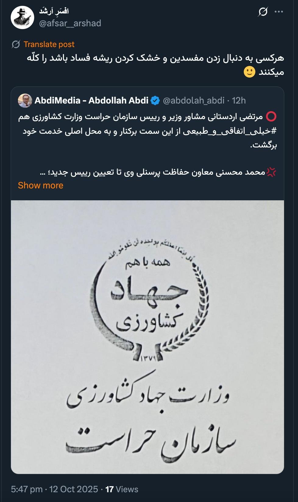 Home/PoliticsThe strangest case I have seen, where everyone is trying their best to block leads and communications of stakeholders, is the phenomenon of the Zawiyeh Financial Group, which I have covered in Abdi Media without publishing details so far.Read1 minute -Monday 2025/10/13 - 10:15News Code:23038Share هرکسی به دنبال زدن مفسدین و خشک کردن ریشه فساد باشد را کلّه میکنند 🙂 https://t.co/QrfT26Kgnt— افسَرِ اَرشَد (@afsar__arshad) October 12, 2025🔴 درودعجیب ترین پروندهای که همه تلاش خود را میکنند تا سرنخ ها و ارتباطات ذی نفعان را مسدود کنند و دیدهام، پدیده #گروه_مالی_زاویه است که تا کنون بدون انتشار جزییات در عبدی مدیا به آن پرداختهام— AbdiMedia - Abdollah Abdi (@abdolah_abdi) October 12, 2025Related news Morteza Ardestani, the minister's advisor and head of the Agricultural Ministry's Security Organization, was also removed from this position quite coincidentally and naturally, and returned to his original place of service. Take less than a minute, register and share your opinion under this post.Insulting or inciting messages will be deleted.Sign UpComming Up Next I remembered Dr. Sadegh Zibakalam's speech about six months ago, when he said: If we enter into a military conflict, whether the system remains or not, not a single electric pole will remain intact in Iran - are you listening?خواندن 0 If this public announcement is not hindered like other parts of the system's security megaproject, yesخواندن 1 minute Regardless of the result of the establishment or non-continuation of the establishment of the Islamic Republic; Should the main leadership option after Ayatollah Khamenei be acted in this way?خواندن 1 minute According to the significant custom of the seminary and jurisprudence, now we have to see which jurist will perform the funeral prayer for Ayatollah Khamenei?خواندن 1 minute In the news of his appointment, I wrote that he is the commander of the camp at the same time as the deputy commander of the army corpsخواندن 1 minuteMost ReadMemories of Akbar Hashemi - February 20, 2000 - Meeting with Abdullah Jasbi and Concerns About Election ResultsMovie / Where is Commander Morteza Talaie?Akbar Hashemi's memoirs - 1999 September 10 - The two-person political negotiations with Vaez Tabasi continued until he was escorted to Tehran, where Hashemi apparently decided to seriously participate in the sixth parliamentary elections.The records of the recent periods of the Islamic Council showed that the parliament is not in charge of affairs and cannot interfere or pass resolutions on the authority of the Commander-in-Chief of the Armed Forces at any level, let alone supervise.What will be the future of Iran with the announced candidates for the presidential election? / Conversation with Dr. Taghi Azad AramakiCan I feel tired with you?A Basiji veterinarian was appointed head of the health network instead of an otolaryngologist.Akbar Hashemi's memoirs - 1999 September 5 - The meeting of the senior managers of the judiciary with Hashemi Rafsanjani and their complaint about the neglect of Hashemi Shahroudi, the new head of the judiciary, continues.Memories of Akbar Hashemi - 1999 September 7 - In continuation of the efforts of the late Vaez Tabasi, who used to encourage Hashemi to participate in the elections in frequent meetings, this time he also met with Hashemi.Akbar Hashemi's memories - 1999 September 9 - Continued visits to the belongings, buildings and works of Astan Quds