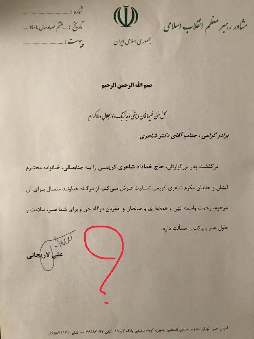 Home/PoliticsA picture of a condolence letter addressed to Mr. Shaeri, the former mayor of Ahvaz, from Ali Larijani has been published on local social networks in Khuzestan.Read1 minute -Wednesday 2025/10/01 - 11:40News Code:22891Share If this is not a fake condolence message, I wonder why Ali Larijani is listed on his former letterheads asIf this is not a fake condolence message, I wonder why Ali Larijani wrote this message on his former letterhead as an advisor to Ayatollah Khamenei, and not on the letterhead of the Secretary of the Supreme National Security Council and, at the same time, the Ayatollah's representative on this council?Who is behind the publication of this condolence? Take less than a minute, register and share your opinion under this post.Insulting or inciting messages will be deleted.Sign UpComming Up Next Mr. Ashna, greetings. Are you also examining the theory that this U.S. military mobilization might ultimately have a target other than the Islamic Republic?خواندن 1 minute The matter is perfectly clear. They were released following a directive from the Judiciary, and this directive was followed up with such speed that bail was accepted and they were released even on a holiday.خواندن 1 minute Dr., greetings. What was the outcome of the Medical Examiner's (Forensic Medicine) report that the family was pursuing through the Prosecutor's Office?خواندن 1 minute Twitter responses on Februaryخواندن 4 minutes What is really going on inside the country?خواندن 1 minuteMost ReadMemories of Akbar Hashemi - February 20, 2000 - Meeting with Abdullah Jasbi and Concerns About Election ResultsMovie / Where is Commander Morteza Talaie?Akbar Hashemi's memoirs - 1999 September 10 - The two-person political negotiations with Vaez Tabasi continued until he was escorted to Tehran, where Hashemi apparently decided to seriously participate in the sixth parliamentary elections.The records of the recent periods of the Islamic Council showed that the parliament is not in charge of affairs and cannot interfere or pass resolutions on the authority of the Commander-in-Chief of the Armed Forces at any level, let alone supervise.What will be the future of Iran with the announced candidates for the presidential election? / Conversation with Dr. Taghi Azad AramakiCan I feel tired with you?A Basiji veterinarian was appointed head of the health network instead of an otolaryngologist.Akbar Hashemi's memoirs - 1999 September 5 - The meeting of the senior managers of the judiciary with Hashemi Rafsanjani and their complaint about the neglect of Hashemi Shahroudi, the new head of the judiciary, continues.Memories of Akbar Hashemi - 1999 September 7 - In continuation of the efforts of the late Vaez Tabasi, who used to encourage Hashemi to participate in the elections in frequent meetings, this time he also met with Hashemi.Akbar Hashemi's memories - 1999 September 9 - Continued visits to the belongings, buildings and works of Astan Quds
