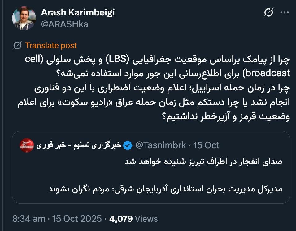 Home/PoliticsThere are many whys; no one gives an answer or doesn't have one!Read1 minute -Friday 2025/10/17 - 14:45News Code:23074Share چرا از پیامک براساس موقعیت جغرافیایی (LBS) و پخش سلولی (cell broadcast) برای اطلاعرسانی این جور موارد استفاده نمیشه؟چرا در زمان حمله اسراییل؛ اعلام وضعیت اضطراری با این دو فناوری انجام نشد یا چرا دستکم مثل زمان حمله عراق «رادیو سکوت» برای اعلام وضعیت قرمز و آژیرخطر نداشتیم؟ https://t.co/KTjIgjMB5X— Arash Karimbeigi (@ARASHka) October 15, 2025🔴 درودچراها زیاد است؛ کسی پاسخی نمیدهد یا ندارد!— AbdiMedia - Abdollah Abdi (@abdolah_abdi) October 16, 2025 Take less than a minute, register and share your opinion under this post.Insulting or inciting messages will be deleted.Sign UpComming Up Next I remembered Dr. Sadegh Zibakalam's speech about six months ago, when he said: If we enter into a military conflict, whether the system remains or not, not a single electric pole will remain intact in Iran - are you listening?خواندن 0 If this public announcement is not hindered like other parts of the system's security megaproject, yesخواندن 1 minute Regardless of the result of the establishment or non-continuation of the establishment of the Islamic Republic; Should the main leadership option after Ayatollah Khamenei be acted in this way?خواندن 1 minute According to the significant custom of the seminary and jurisprudence, now we have to see which jurist will perform the funeral prayer for Ayatollah Khamenei?خواندن 1 minute In the news of his appointment, I wrote that he is the commander of the camp at the same time as the deputy commander of the army corpsخواندن 1 minuteMost ReadMemories of Akbar Hashemi - February 20, 2000 - Meeting with Abdullah Jasbi and Concerns About Election ResultsMovie / Where is Commander Morteza Talaie?Akbar Hashemi's memoirs - 1999 September 10 - The two-person political negotiations with Vaez Tabasi continued until he was escorted to Tehran, where Hashemi apparently decided to seriously participate in the sixth parliamentary elections.The records of the recent periods of the Islamic Council showed that the parliament is not in charge of affairs and cannot interfere or pass resolutions on the authority of the Commander-in-Chief of the Armed Forces at any level, let alone supervise.What will be the future of Iran with the announced candidates for the presidential election? / Conversation with Dr. Taghi Azad AramakiCan I feel tired with you?A Basiji veterinarian was appointed head of the health network instead of an otolaryngologist.Akbar Hashemi's memoirs - 1999 September 5 - The meeting of the senior managers of the judiciary with Hashemi Rafsanjani and their complaint about the neglect of Hashemi Shahroudi, the new head of the judiciary, continues.Memories of Akbar Hashemi - 1999 September 7 - In continuation of the efforts of the late Vaez Tabasi, who used to encourage Hashemi to participate in the elections in frequent meetings, this time he also met with Hashemi.Akbar Hashemi's memories - 1999 September 9 - Continued visits to the belongings, buildings and works of Astan Quds