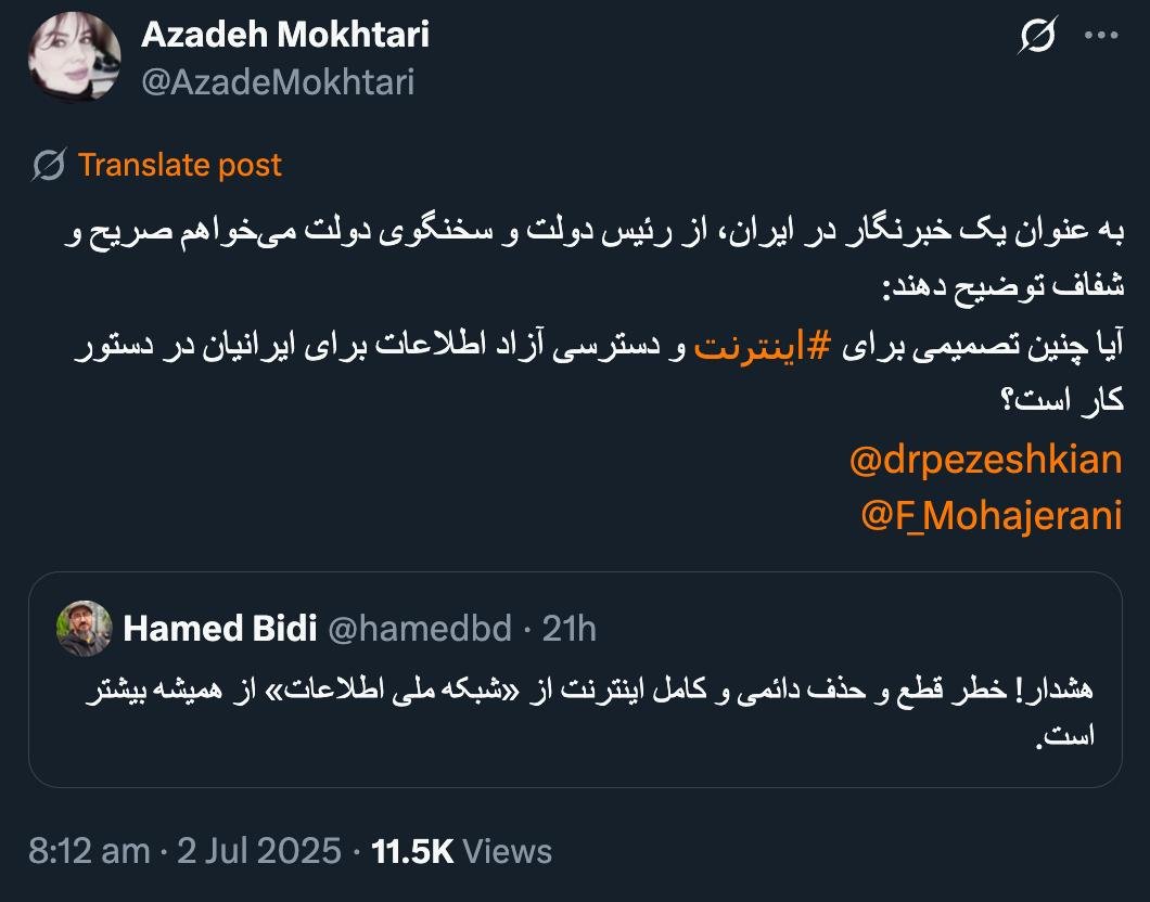 Home/PoliticsIf it is to be implemented in the short term, no one will answer even the chairman and secretary of the Supreme National Security Council!Read1 minute -Monday 2025/07/14 - 18:49News Code:20735Share به عنوان یک خبرنگار در ایران، از رئیس دولت و سخنگوی دولت میخواهم صریح و شفاف توضیح دهند:آیا چنین تصمیمی برای #اینترنت و دسترسی آزاد اطلاعات برای ایرانیان در دستور کار است؟@drpezeshkian@F_Mohajerani https://t.co/gSEc6HW5Jy— Azadeh Mokhtari (@AzadeMokhtari) July 2, 2025🔴 درود#اگر قرار به اجرا در #کوتاه_مدت باشد هیچ کس پاسخ نخواهد داد حتی رییس و دبیر شورای عالی امنیت ملی!— AbdiMedia - Abdollah Abdi (@abdolah_abdi) July 2, 2025 Take less than a minute, register and share your opinion under this post.Insulting or inciting messages will be deleted.Sign UpComming Up Next I remembered Dr. Sadegh Zibakalam's speech about six months ago, when he said: If we enter into a military conflict, whether the system remains or not, not a single electric pole will remain intact in Iran - are you listening?خواندن 0 If this public announcement is not hindered like other parts of the system's security megaproject, yesخواندن 1 minute Regardless of the result of the establishment or non-continuation of the establishment of the Islamic Republic; Should the main leadership option after Ayatollah Khamenei be acted in this way?خواندن 1 minute According to the significant custom of the seminary and jurisprudence, now we have to see which jurist will perform the funeral prayer for Ayatollah Khamenei?خواندن 1 minute In the news of his appointment, I wrote that he is the commander of the camp at the same time as the deputy commander of the army corpsخواندن 1 minuteMost ReadMemories of Akbar Hashemi - February 20, 2000 - Meeting with Abdullah Jasbi and Concerns About Election ResultsMovie / Where is Commander Morteza Talaie?Akbar Hashemi's memoirs - 1999 September 10 - The two-person political negotiations with Vaez Tabasi continued until he was escorted to Tehran, where Hashemi apparently decided to seriously participate in the sixth parliamentary elections.The records of the recent periods of the Islamic Council showed that the parliament is not in charge of affairs and cannot interfere or pass resolutions on the authority of the Commander-in-Chief of the Armed Forces at any level, let alone supervise.What will be the future of Iran with the announced candidates for the presidential election? / Conversation with Dr. Taghi Azad AramakiCan I feel tired with you?A Basiji veterinarian was appointed head of the health network instead of an otolaryngologist.Akbar Hashemi's memoirs - 1999 September 5 - The meeting of the senior managers of the judiciary with Hashemi Rafsanjani and their complaint about the neglect of Hashemi Shahroudi, the new head of the judiciary, continues.Memories of Akbar Hashemi - 1999 September 7 - In continuation of the efforts of the late Vaez Tabasi, who used to encourage Hashemi to participate in the elections in frequent meetings, this time he also met with Hashemi.Akbar Hashemi's memories - 1999 September 9 - Continued visits to the belongings, buildings and works of Astan Quds