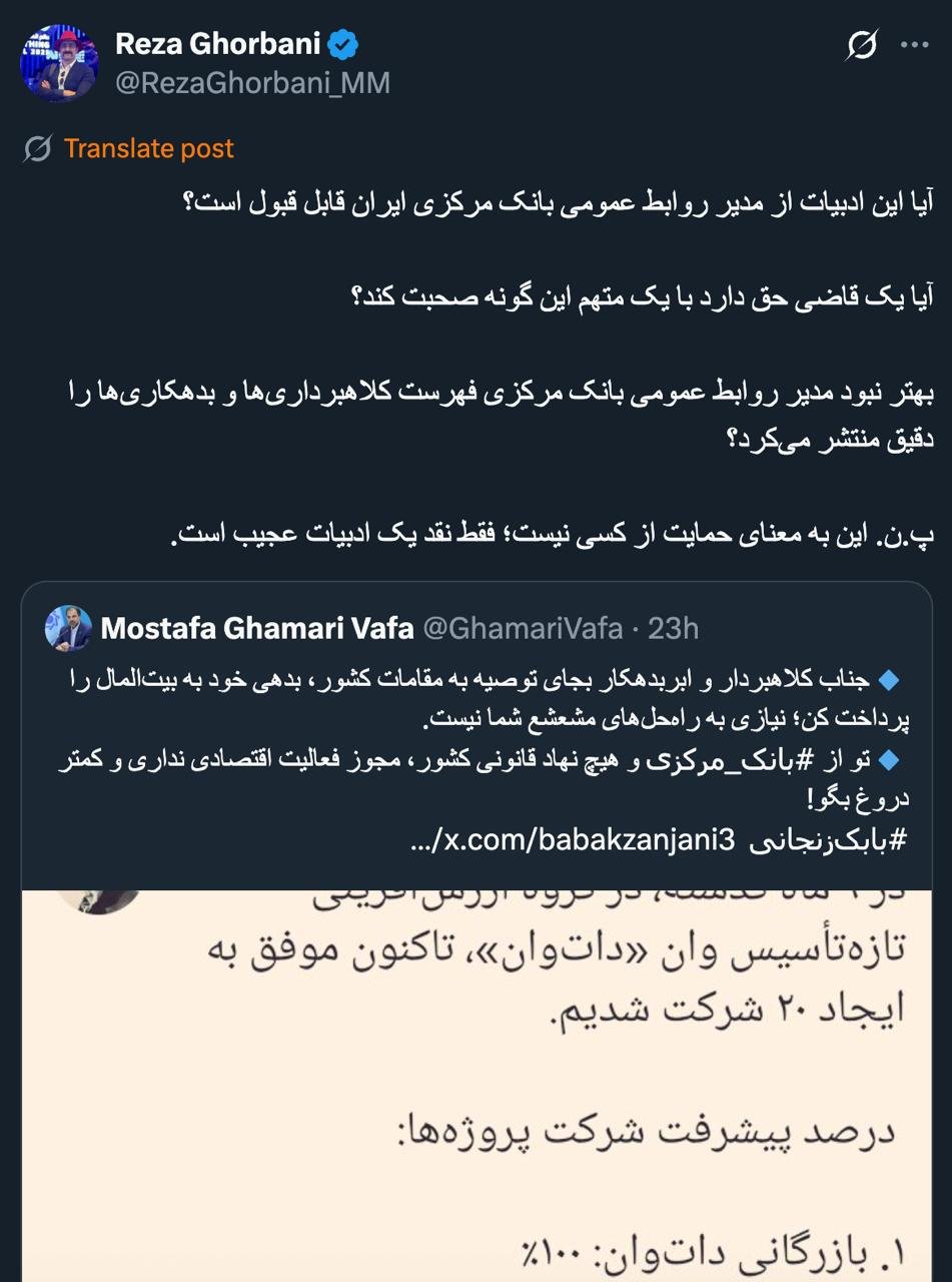 Home/PoliticsSince Mr. Qomari Vafa introduces himself as the Public Relations Manager of the Central Bank with the address of this bank, not as a real person but according to the bio of the account.Read1 minute -Monday 2025/07/14 - 22:38News Code:21172Share And in fact, as the spokesperson for this bank (without the slightest defense of the audience), the use of these phrases is a bit more complicated.And in fact, as the spokesperson for this bank (without the slightest defense for the audience), they used these phrases; the issue is somewhat more complicated. Was it merely an overflow of emotions, or were their statements aimed at a specific goal? In this case, it should soon be clarified by subsequent behaviors.آیا این ادبیات از مدیر روابط عمومی بانک مرکزی ایران قابل قبول است؟آیا یک قاضی حق دارد با یک متهم این گونه صحبت کند؟بهتر نبود مدیر روابط عمومی بانک مرکزی فهرست کلاهبرداریها و بدهکاریها را دقیق منتشر میکرد؟پ.ن. این به معنای حمایت از کسی نیست؛ فقط نقد یک ادبیات عجیب است. https://t.co/y2dAqbgLqW— Reza Ghorbani (@RezaGhorbani_MM) July 11, 2025🔴درودچون آقای قمری وفا @GhamariVafa نه به عنوان یک شخصیت حقیقی بلکه طبق بیوی حساب کاربری، خود را به عنوان مدیر روابط عمومی بانک مرکزی با آدرس این بانک معرفی میکنند و در حقیقت به عنوان سخنگوی این بانک (بدون اینکه کوچکترین دفاعی از مخاطب) از این عبارات استفاده کردند موضوع کمی…— AbdiMedia - Abdollah Abdi (@abdolah_abdi) July 11, 2025Related news آقای قمری وفا درود به عنوان مدیر روابط عمومی بانک مرکزی میخواهید بفرمایید آقای نامبرده بدهی و رد مال خود را به اجرای احکام دادسرای مجری حکم پرداخت ننموده و بدون تادیه رد مال از ارفاقات قانونی برخوردار شده؟ Take less than a minute, register and share your opinion under this post.Insulting or inciting messages will be deleted.Sign UpComming Up Next I remembered Dr. Sadegh Zibakalam's speech about six months ago, when he said: If we enter into a military conflict, whether the system remains or not, not a single electric pole will remain intact in Iran - are you listening?خواندن 0 If this public announcement is not hindered like other parts of the system's security megaproject, yesخواندن 1 minute Regardless of the result of the establishment or non-continuation of the establishment of the Islamic Republic; Should the main leadership option after Ayatollah Khamenei be acted in this way?خواندن 1 minute According to the significant custom of the seminary and jurisprudence, now we have to see which jurist will perform the funeral prayer for Ayatollah Khamenei?خواندن 1 minute In the news of his appointment, I wrote that he is the commander of the camp at the same time as the deputy commander of the army corpsخواندن 1 minuteMost ReadMemories of Akbar Hashemi - February 20, 2000 - Meeting with Abdullah Jasbi and Concerns About Election ResultsMovie / Where is Commander Morteza Talaie?Akbar Hashemi's memoirs - 1999 September 10 - The two-person political negotiations with Vaez Tabasi continued until he was escorted to Tehran, where Hashemi apparently decided to seriously participate in the sixth parliamentary elections.The records of the recent periods of the Islamic Council showed that the parliament is not in charge of affairs and cannot interfere or pass resolutions on the authority of the Commander-in-Chief of the Armed Forces at any level, let alone supervise.What will be the future of Iran with the announced candidates for the presidential election? / Conversation with Dr. Taghi Azad AramakiCan I feel tired with you?A Basiji veterinarian was appointed head of the health network instead of an otolaryngologist.Akbar Hashemi's memoirs - 1999 September 5 - The meeting of the senior managers of the judiciary with Hashemi Rafsanjani and their complaint about the neglect of Hashemi Shahroudi, the new head of the judiciary, continues.Memories of Akbar Hashemi - 1999 September 7 - In continuation of the efforts of the late Vaez Tabasi, who used to encourage Hashemi to participate in the elections in frequent meetings, this time he also met with Hashemi.Akbar Hashemi's memories - 1999 September 9 - Continued visits to the belongings, buildings and works of Astan Quds