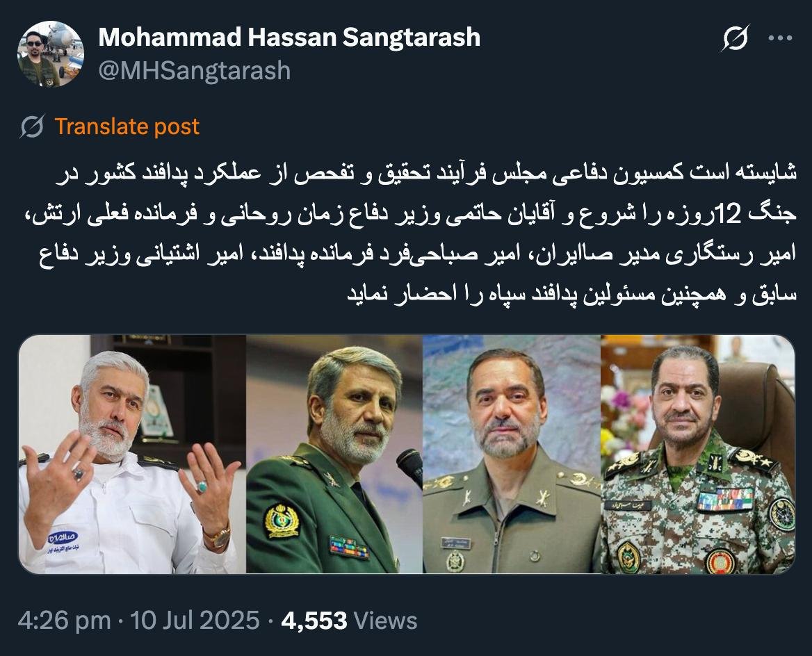 Home/PoliticsDoes the "Parliament at the Top of Affairs" have the authority and permission to intervene in the powers of the Commander-in-Chief, and is this even allowed? Read1 minute -Monday 2025/07/14 - 22:38News Code:21173Share شایسته است کمسیون دفاعی مجلس فرآیند تحقیق و تفحص از عملکرد پدافند کشور در جنگ 12روزه را شروع و آقایان حاتمی وزیر دفاع زمان روحانی و فرمانده فعلی ارتش، امیر رستگاری مدیر صاایران، امیر صباحیفرد فرمانده پدافند، امیر اشتیانی وزیر دفاع سابق و همچنین مسئولین پدافند سپاه را احضار نماید pic.twitter.com/uhATwpZL8c— Mohammad Hassan Sangtarash (@MHSangtarash) July 10, 2025🔴درودمگر «مجلسِ در راس امور» مجوز و اجازه دارد در حوزه اختیارات فرمانده کل قوا و آن هم این قضیه وارد شود؟🔸میشود؟ بسم الله— AbdiMedia - Abdollah Abdi (@abdolah_abdi) July 11, 2025 Take less than a minute, register and share your opinion under this post.Insulting or inciting messages will be deleted.Sign UpComming Up Next I remembered Dr. Sadegh Zibakalam's speech about six months ago, when he said: If we enter into a military conflict, whether the system remains or not, not a single electric pole will remain intact in Iran - are you listening?خواندن 0 If this public announcement is not hindered like other parts of the system's security megaproject, yesخواندن 1 minute Regardless of the result of the establishment or non-continuation of the establishment of the Islamic Republic; Should the main leadership option after Ayatollah Khamenei be acted in this way?خواندن 1 minute According to the significant custom of the seminary and jurisprudence, now we have to see which jurist will perform the funeral prayer for Ayatollah Khamenei?خواندن 1 minute In the news of his appointment, I wrote that he is the commander of the camp at the same time as the deputy commander of the army corpsخواندن 1 minuteMost ReadMemories of Akbar Hashemi - February 20, 2000 - Meeting with Abdullah Jasbi and Concerns About Election ResultsMovie / Where is Commander Morteza Talaie?Akbar Hashemi's memoirs - 1999 September 10 - The two-person political negotiations with Vaez Tabasi continued until he was escorted to Tehran, where Hashemi apparently decided to seriously participate in the sixth parliamentary elections.The records of the recent periods of the Islamic Council showed that the parliament is not in charge of affairs and cannot interfere or pass resolutions on the authority of the Commander-in-Chief of the Armed Forces at any level, let alone supervise.What will be the future of Iran with the announced candidates for the presidential election? / Conversation with Dr. Taghi Azad AramakiCan I feel tired with you?A Basiji veterinarian was appointed head of the health network instead of an otolaryngologist.Akbar Hashemi's memoirs - 1999 September 5 - The meeting of the senior managers of the judiciary with Hashemi Rafsanjani and their complaint about the neglect of Hashemi Shahroudi, the new head of the judiciary, continues.Memories of Akbar Hashemi - 1999 September 7 - In continuation of the efforts of the late Vaez Tabasi, who used to encourage Hashemi to participate in the elections in frequent meetings, this time he also met with Hashemi.Akbar Hashemi's memories - 1999 September 9 - Continued visits to the belongings, buildings and works of Astan Quds